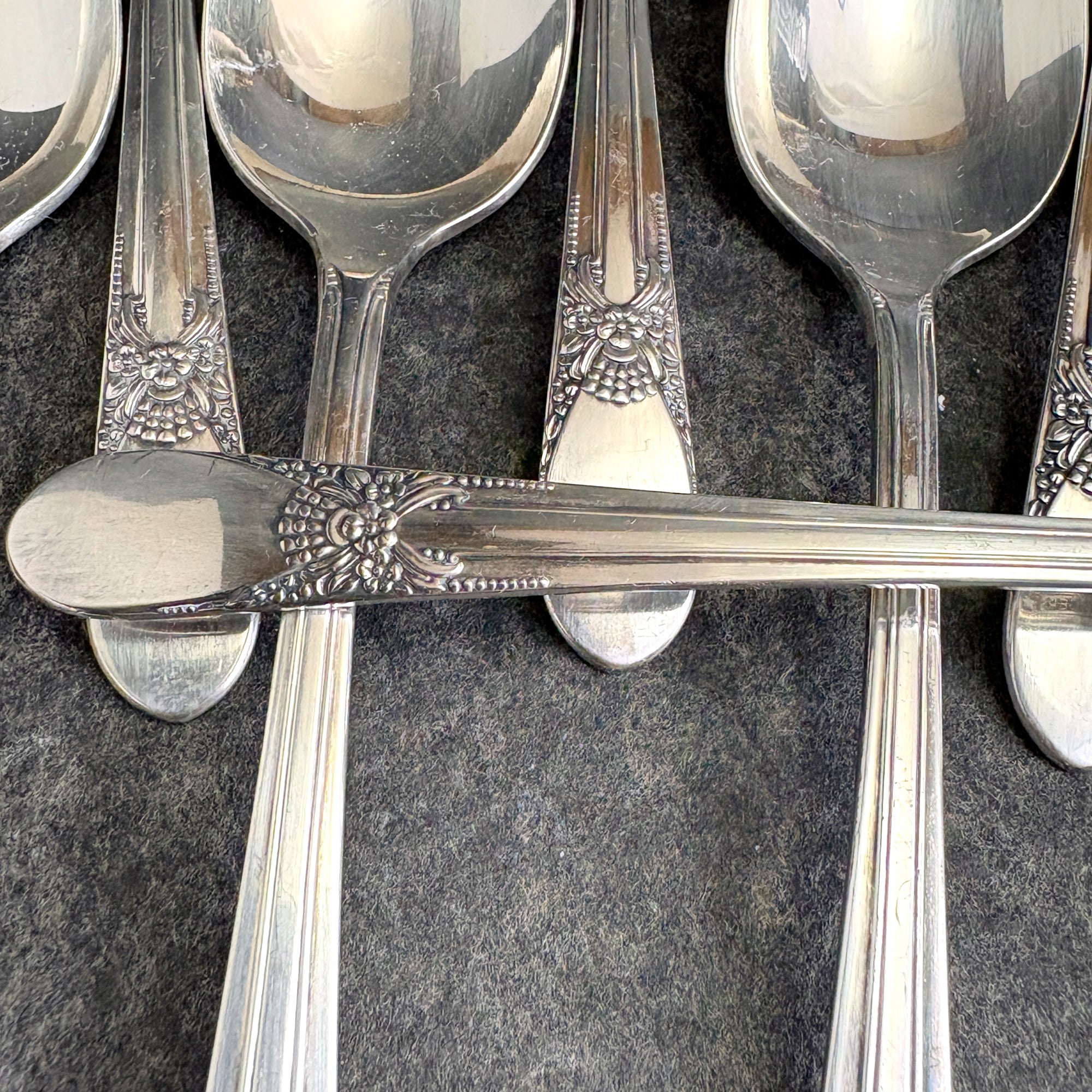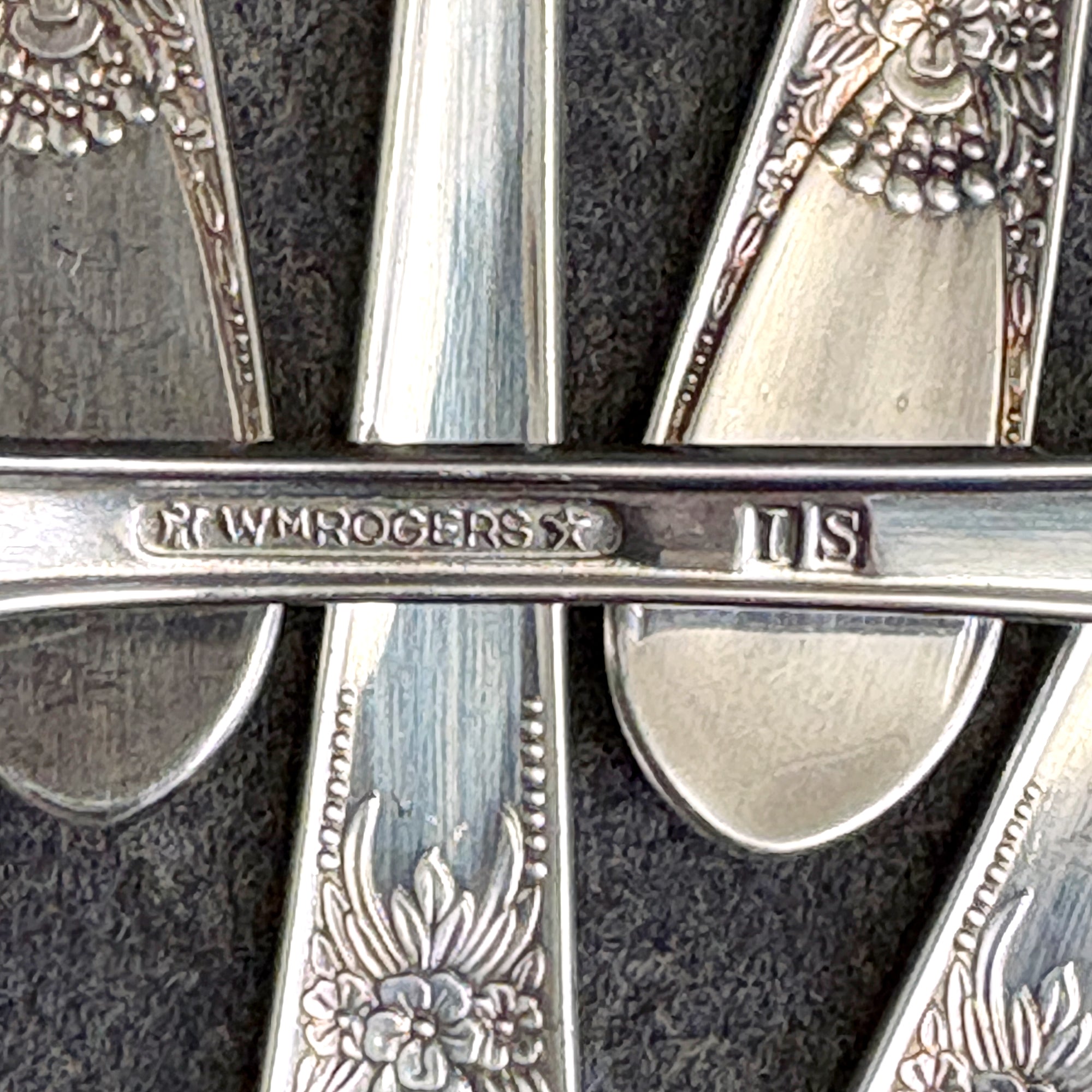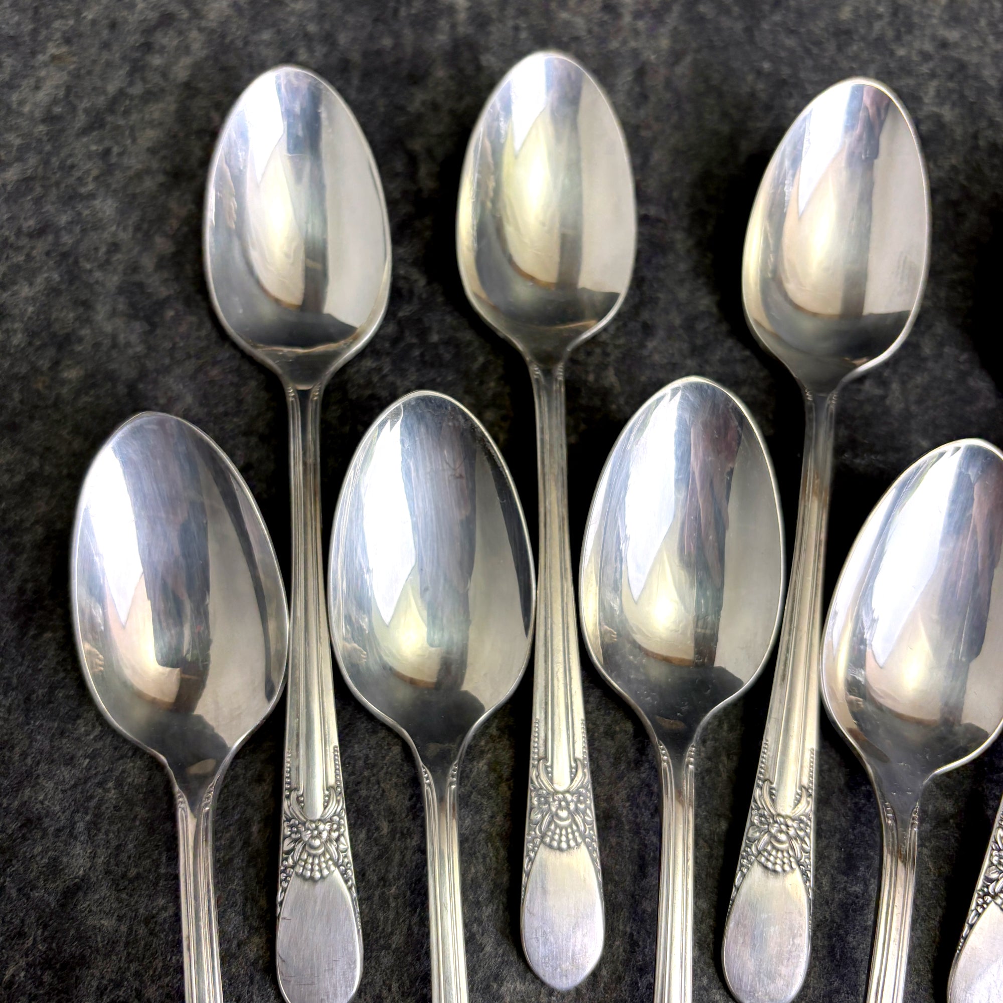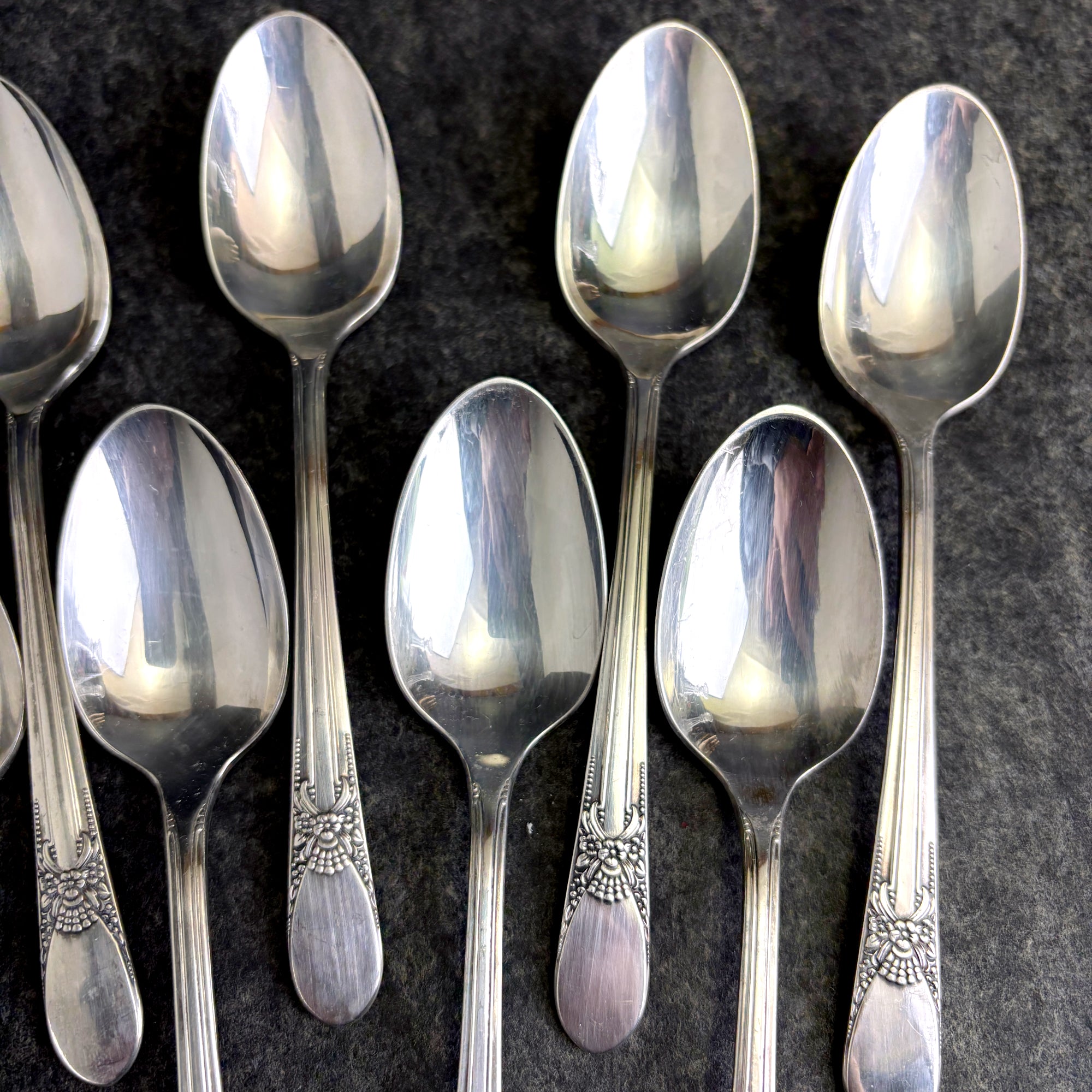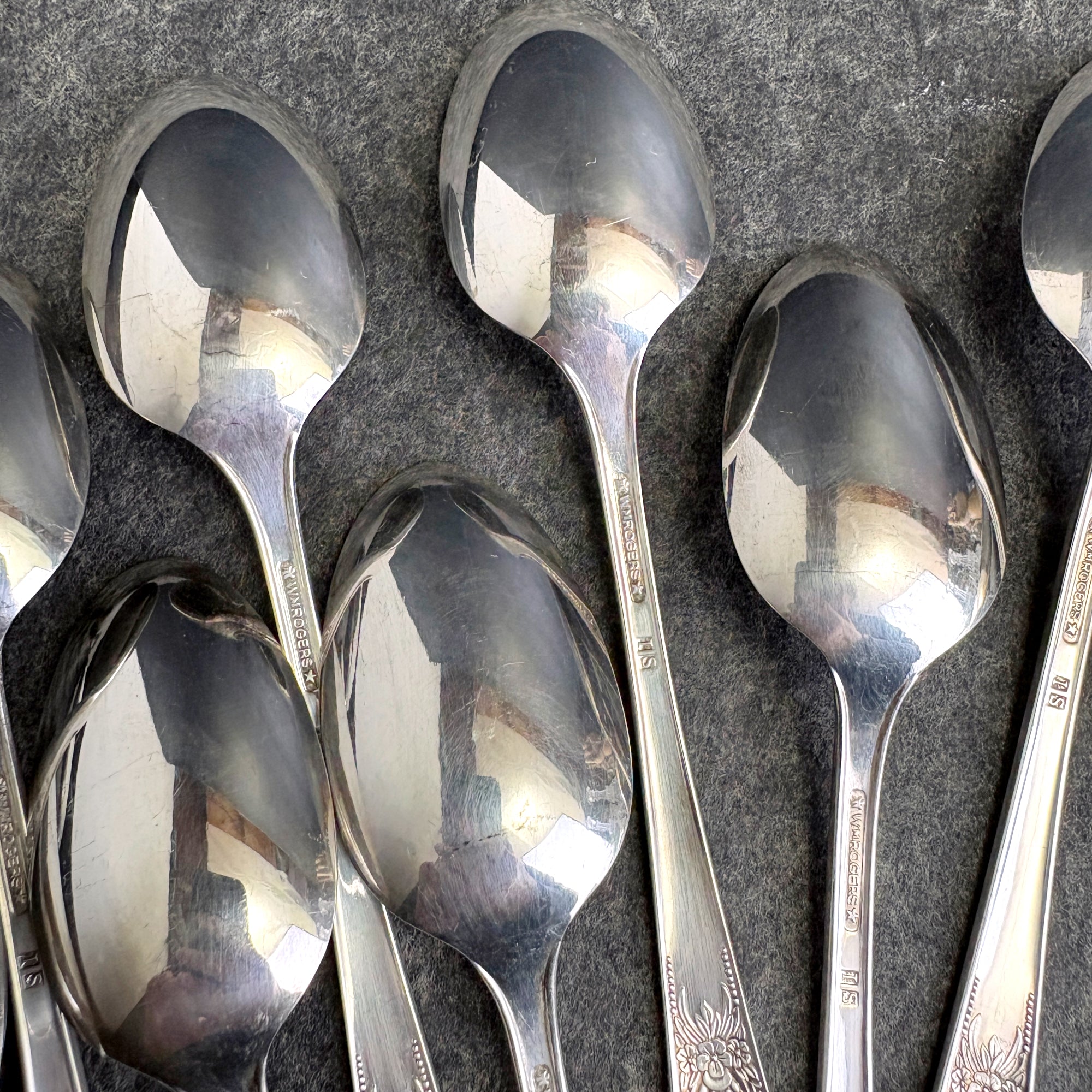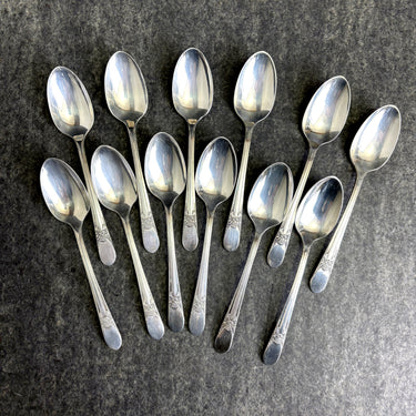 12 silver plate teaspoons in the 1940s Beloved pattern by Wm Rogers, made by International Silver Company. Made in Meriden, CT. Romantic small floral design on the handle, with room for a monogram to be added.