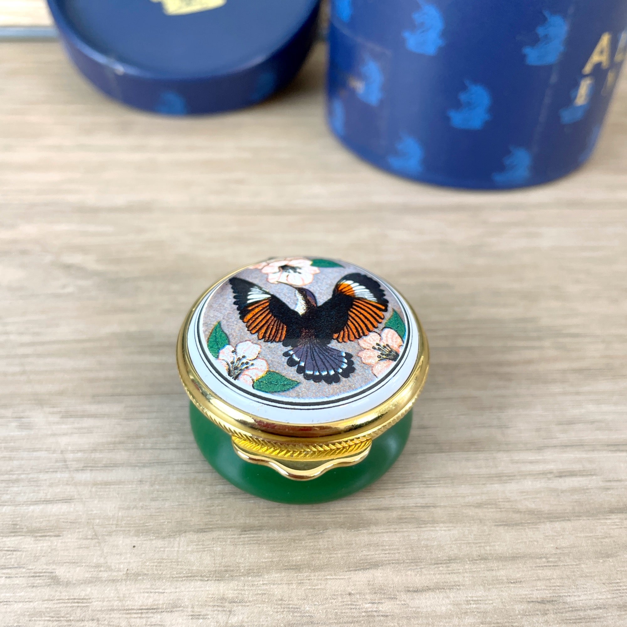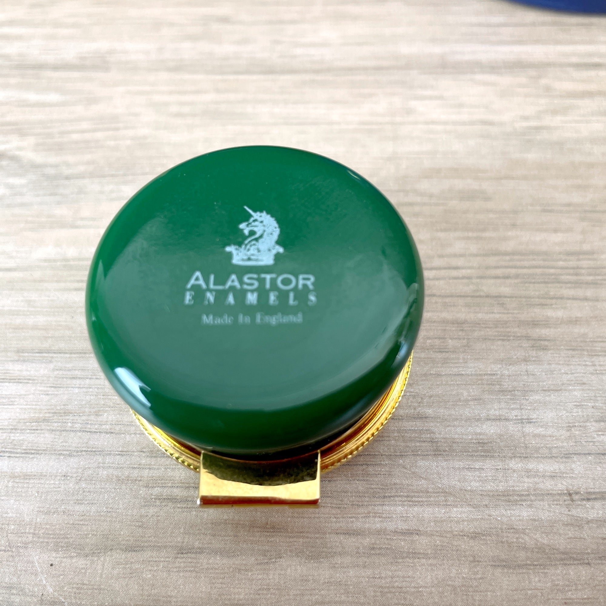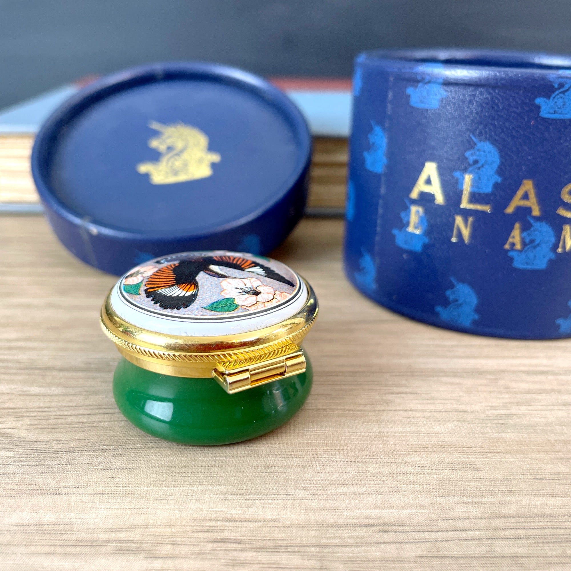 Vintage Alastor Enamels hummingbird #02101 hinged trinket or pill box in original box. Lovely small green circular enamel box with a humming bird and white and orange flowers on the lid. Interior is white. Gold toned metal rim, hinge and clasp. In original soft fabric lined box.