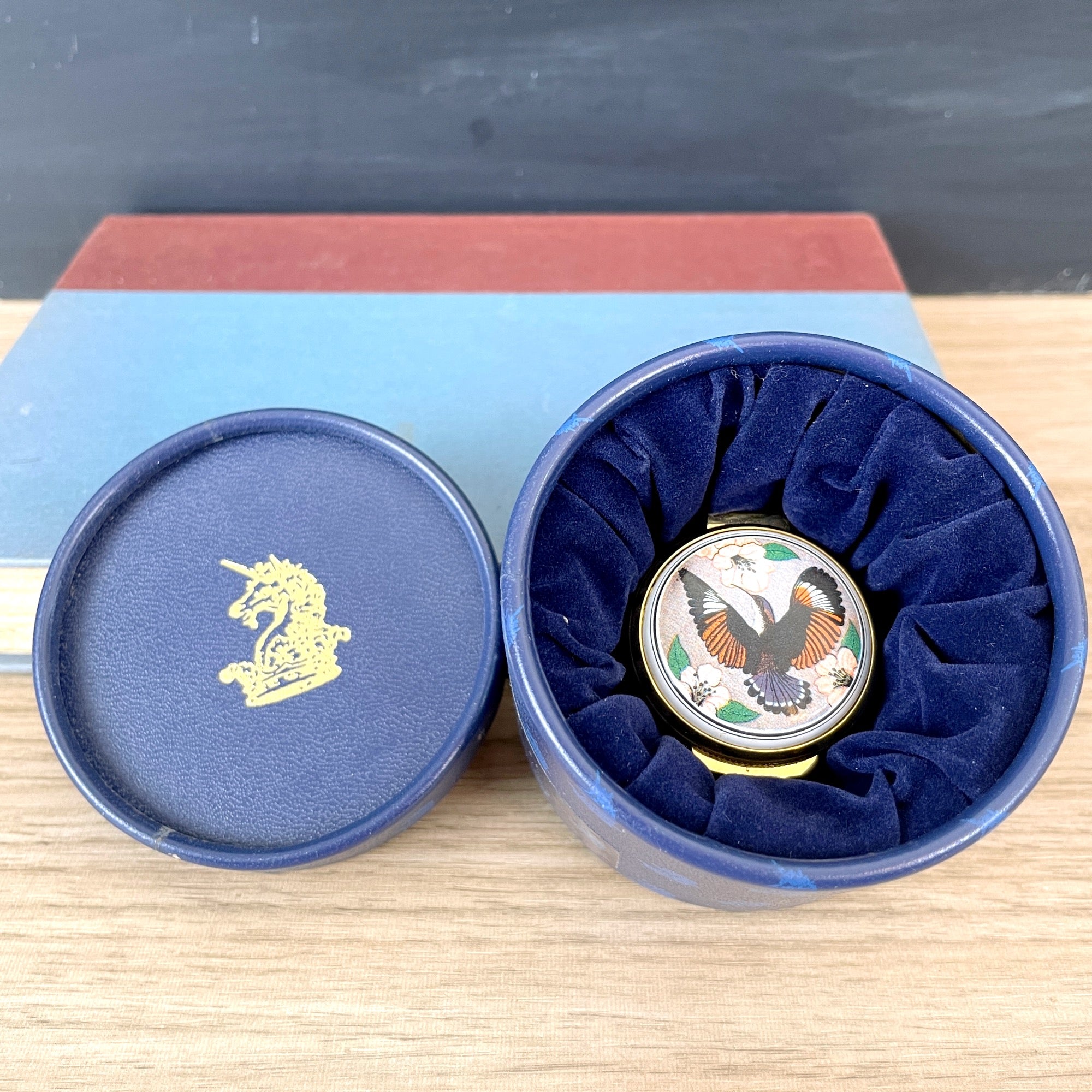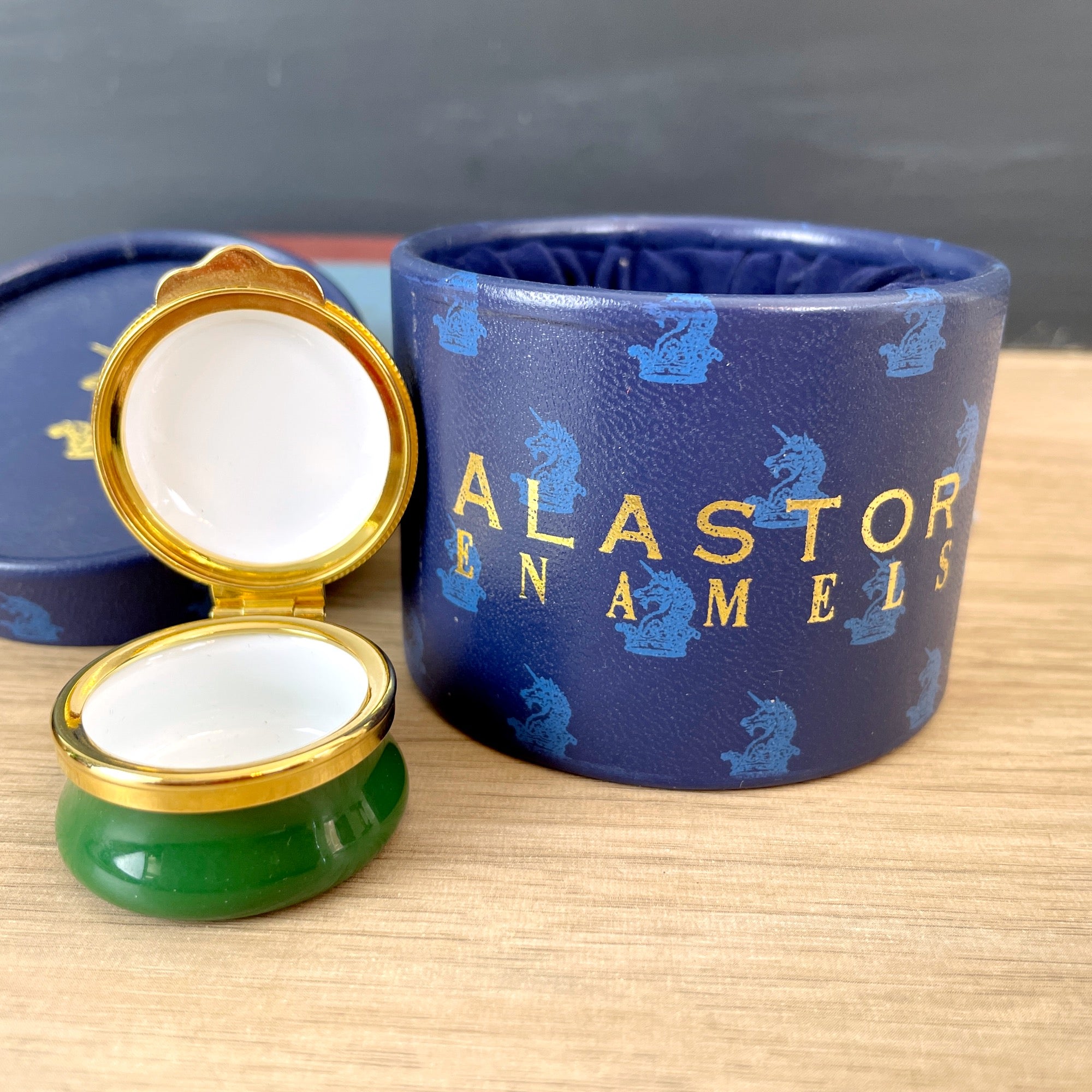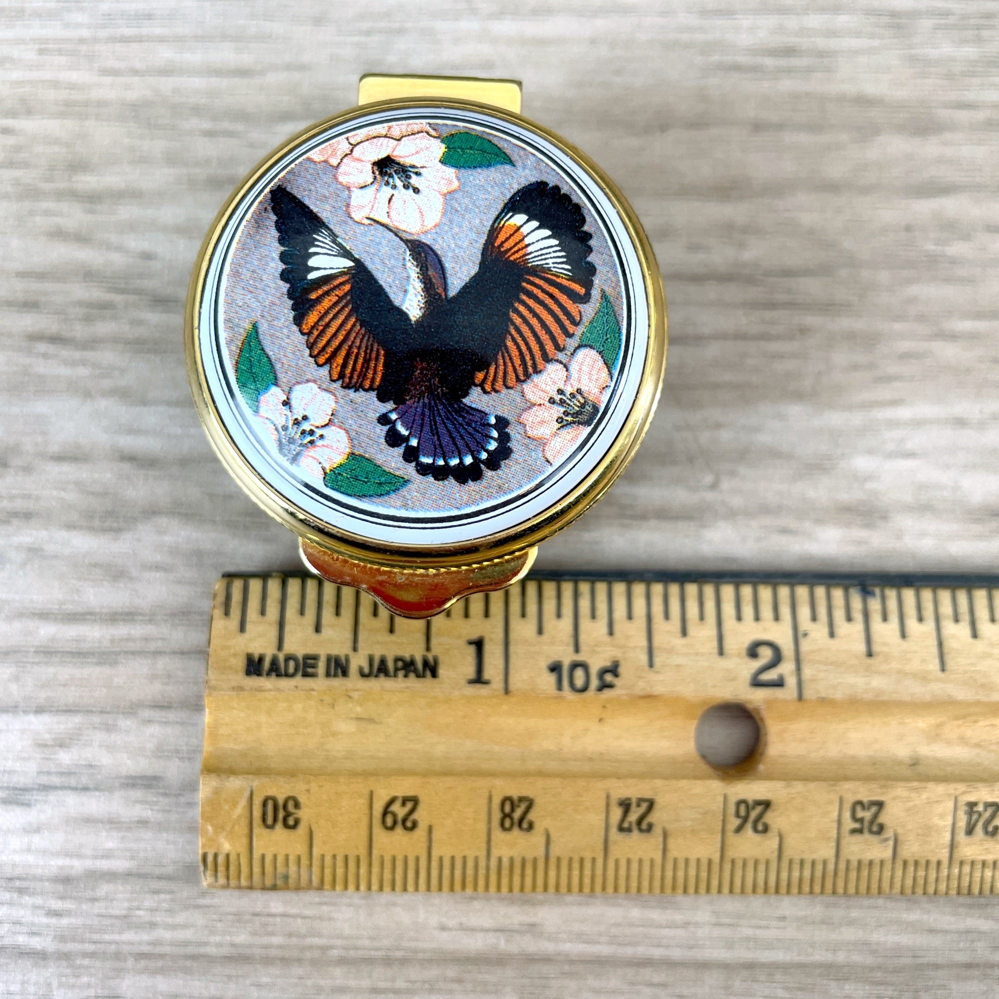 Vintage Alastor Enamels hummingbird #02101 hinged trinket or pill box in original box. Lovely small green circular enamel box with a humming bird and white and orange flowers on the lid. Interior is white. Gold toned metal rim, hinge and clasp. In original soft fabric lined box.