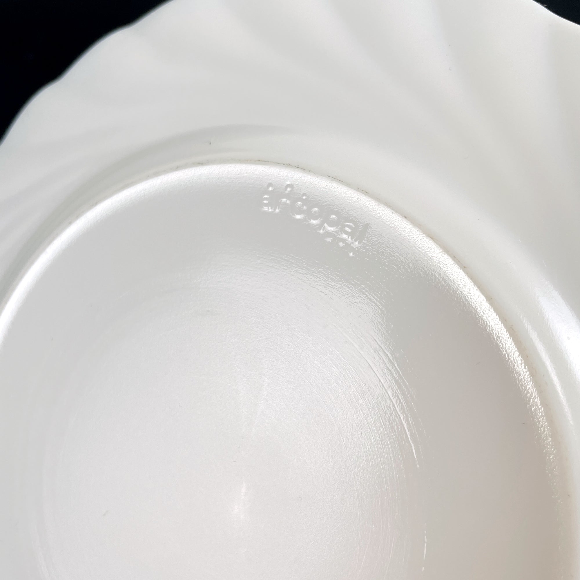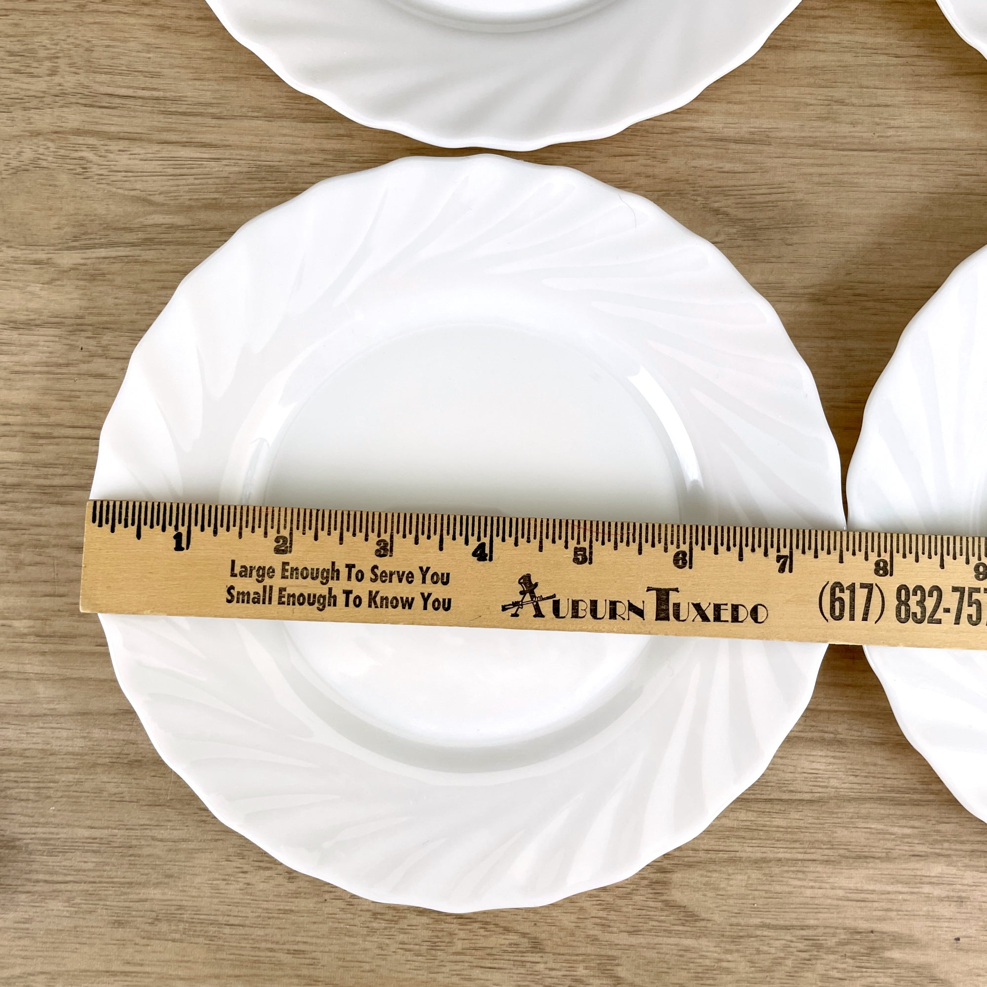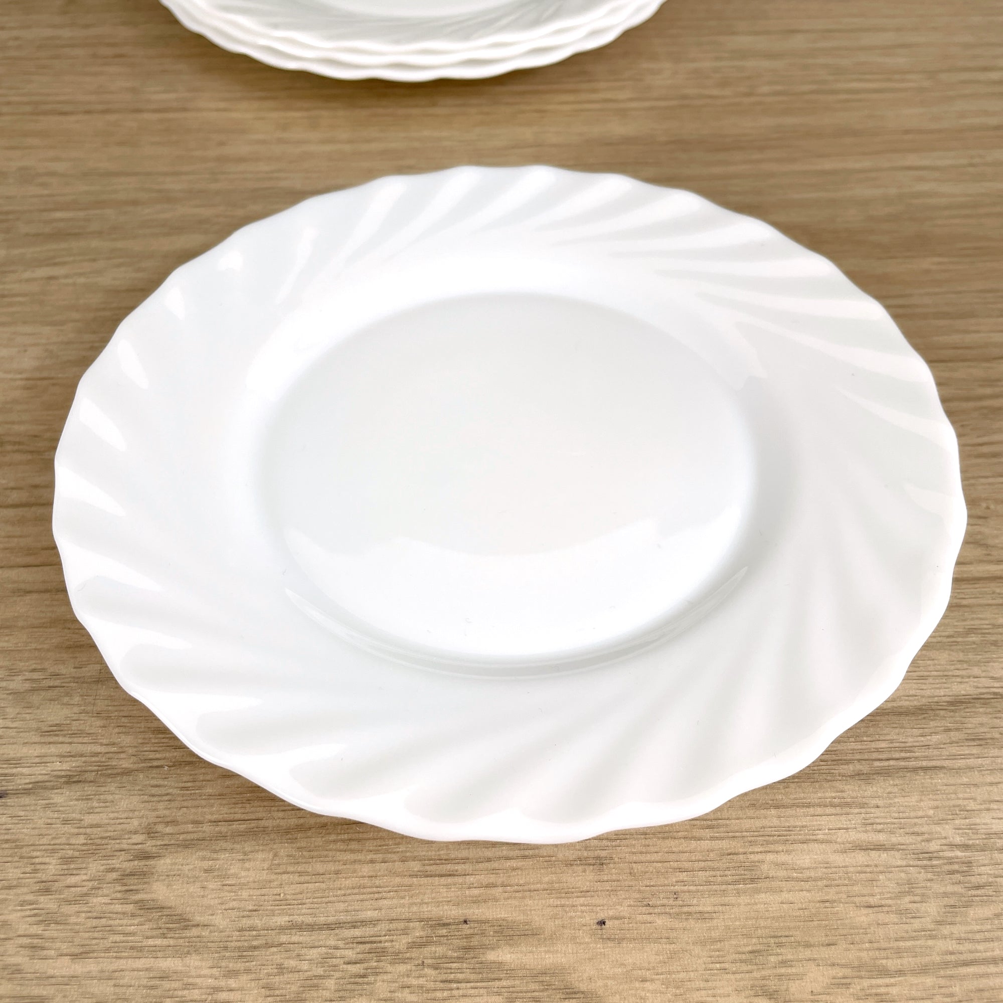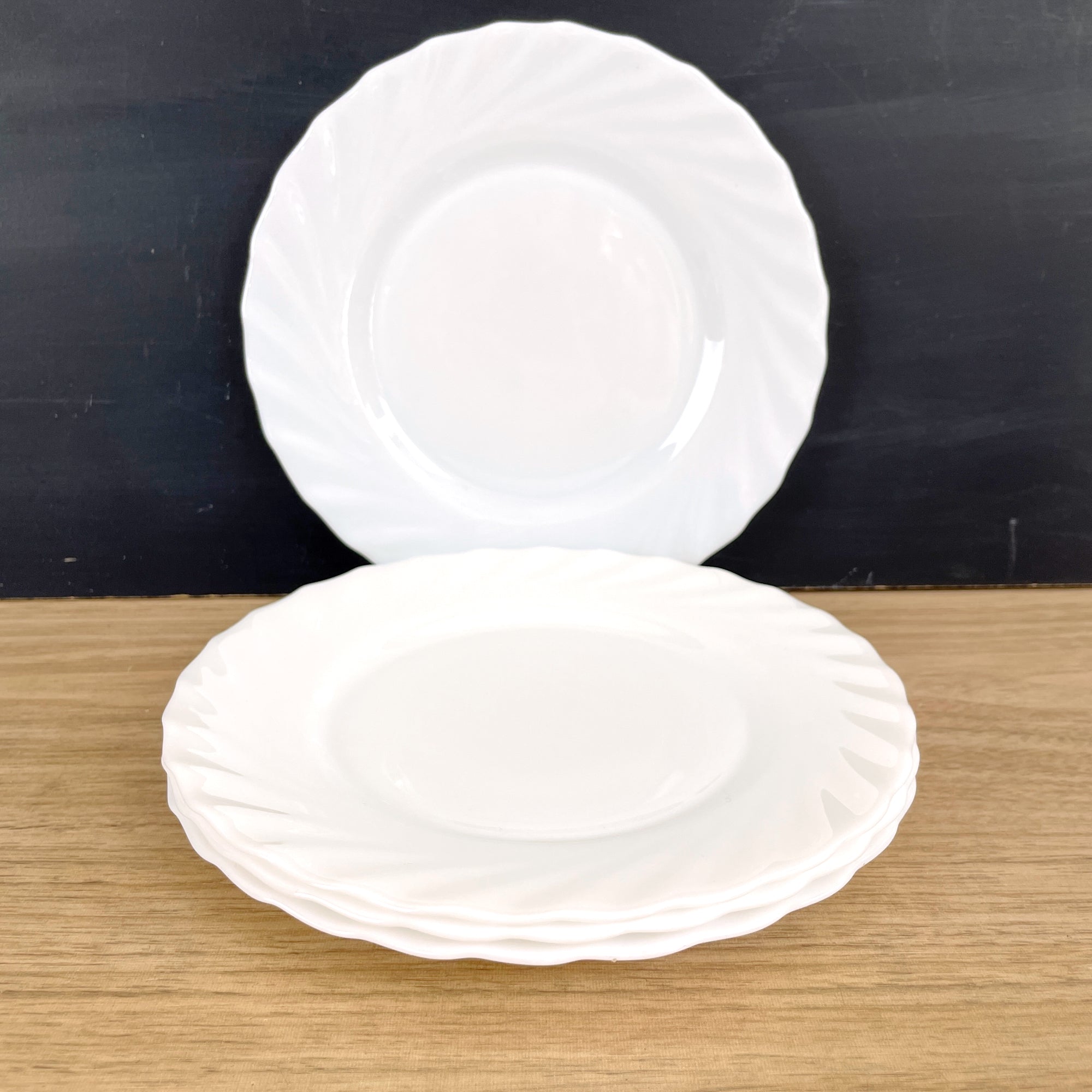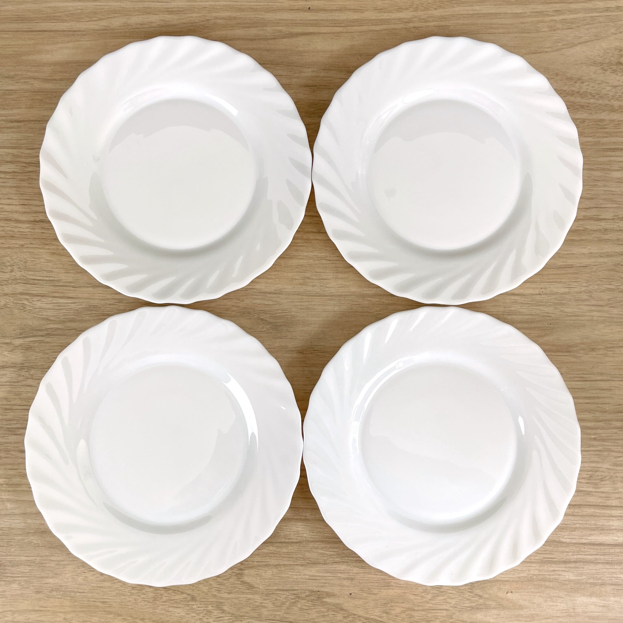 Set of four Arcopal Trianon white salad plates. Opalware glass with a swirl pattern, and scalloped edges.