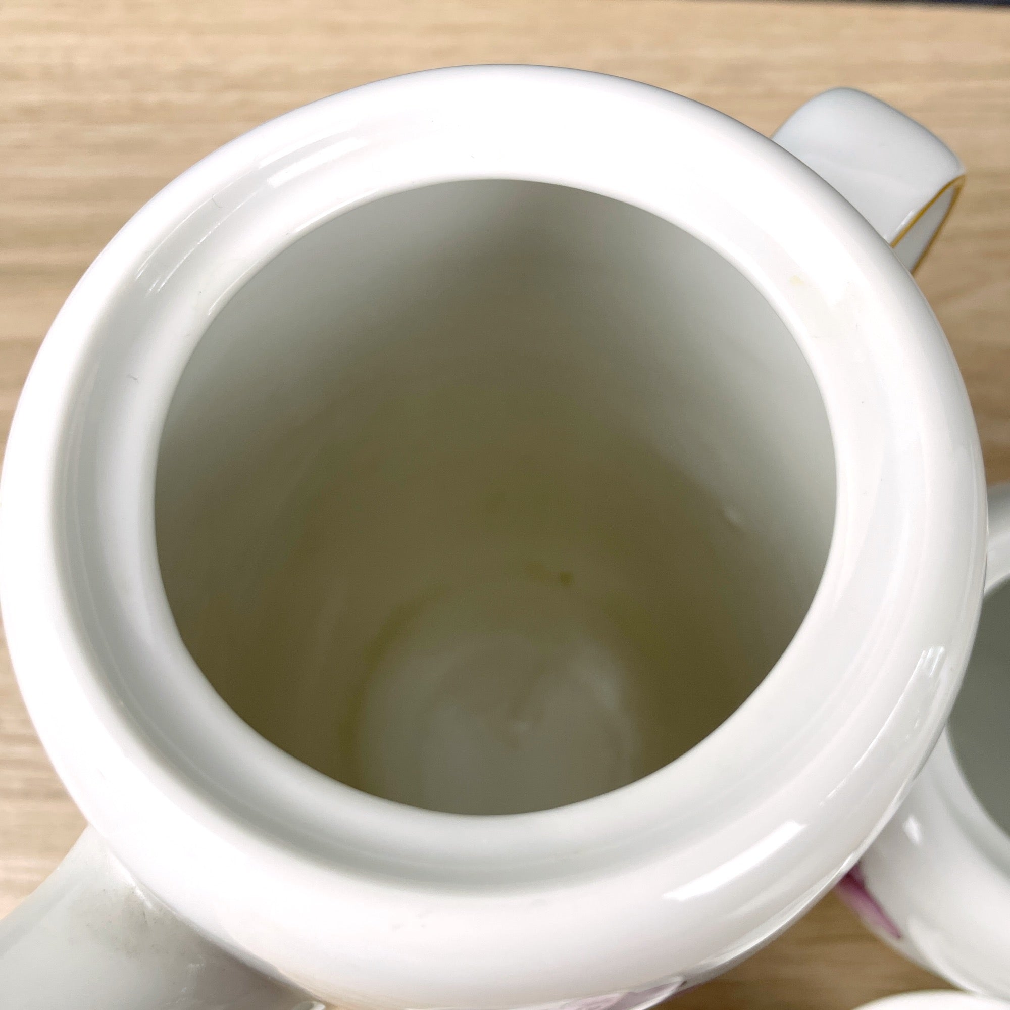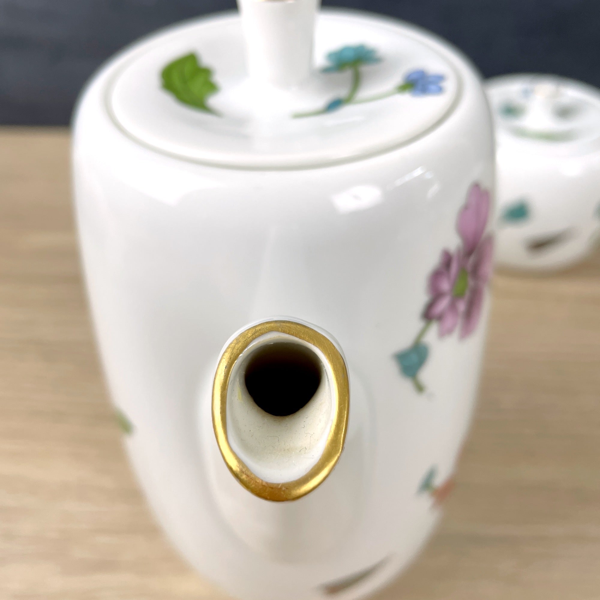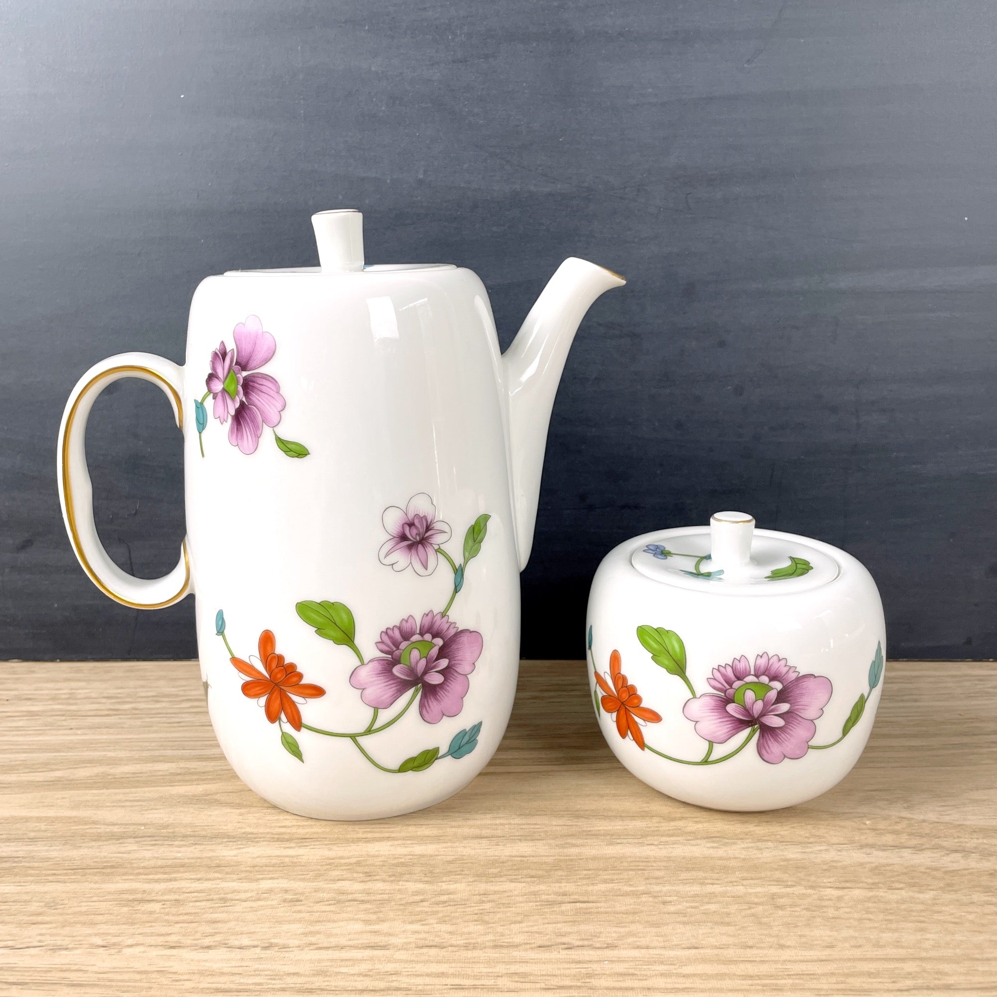 Royal Worcester Astley tall coffee pot and lidded sugar bowl, "True Porcelain Oven to Table Ware," made in England from 1967-1986. Simple and lovely white porcelain with a gold rim decorated with purple, teal and rust flowers.