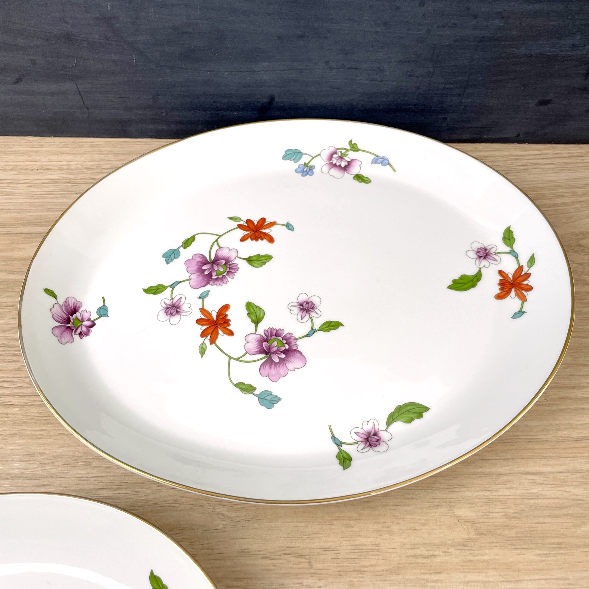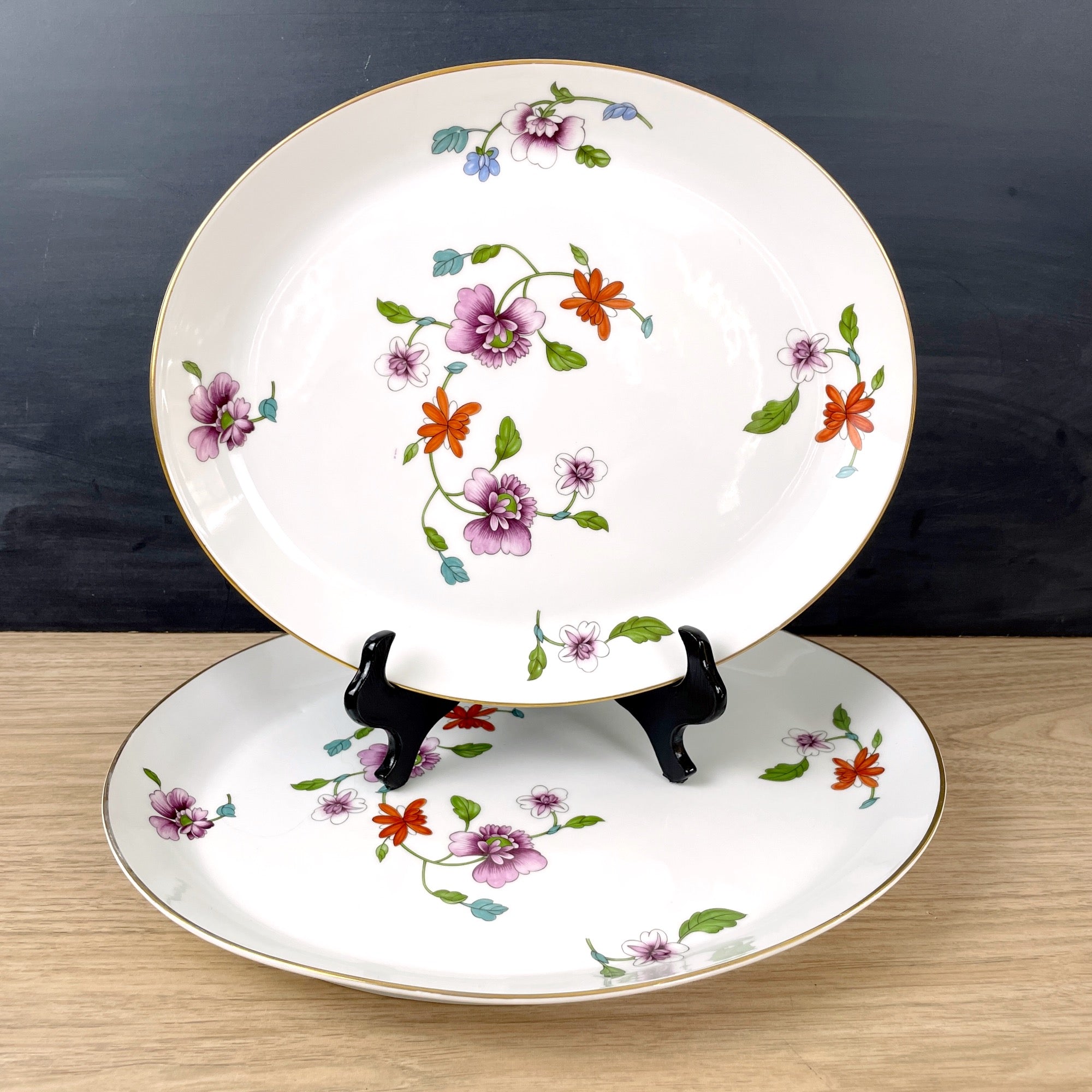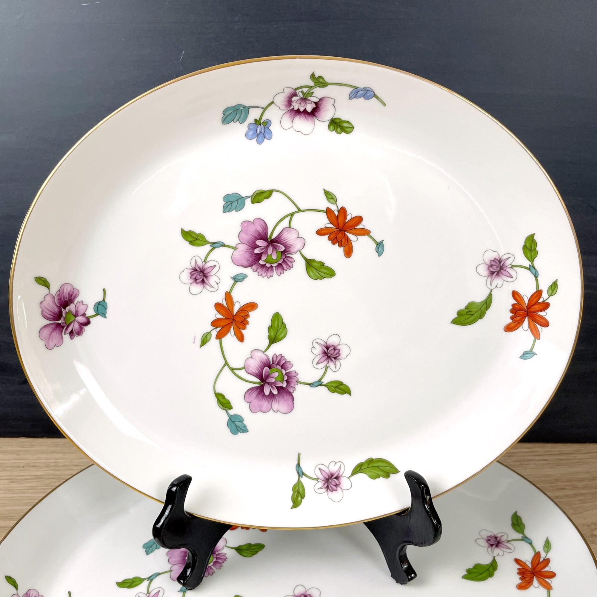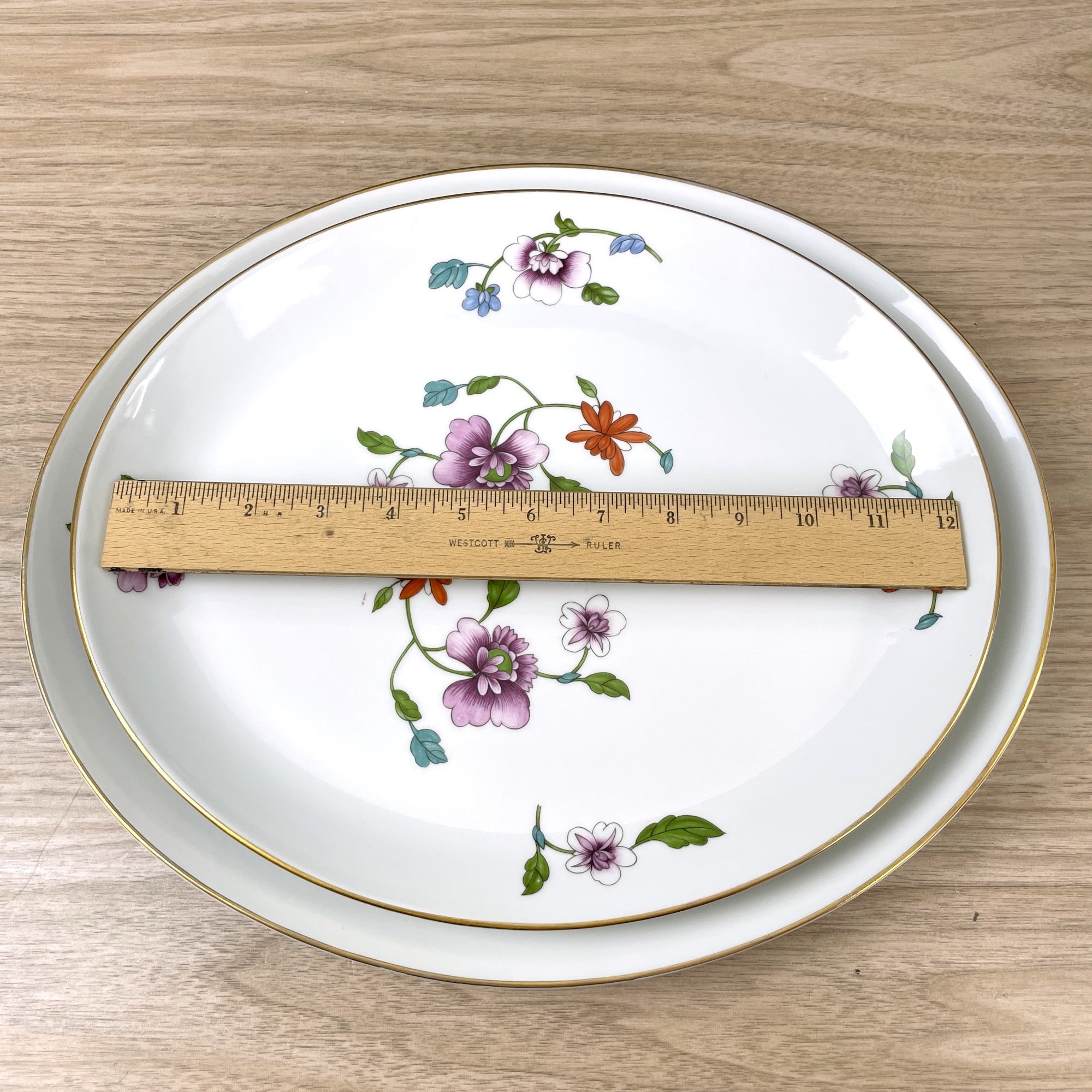 2 oval serving platters by Royal Worcester in the Atley pattern. "True Porcelain, Oven to Table Ware" made in England from 1967-1986. Simple and lovely white porcelain with a gold rim decorated with purple, teal and rust flowers.