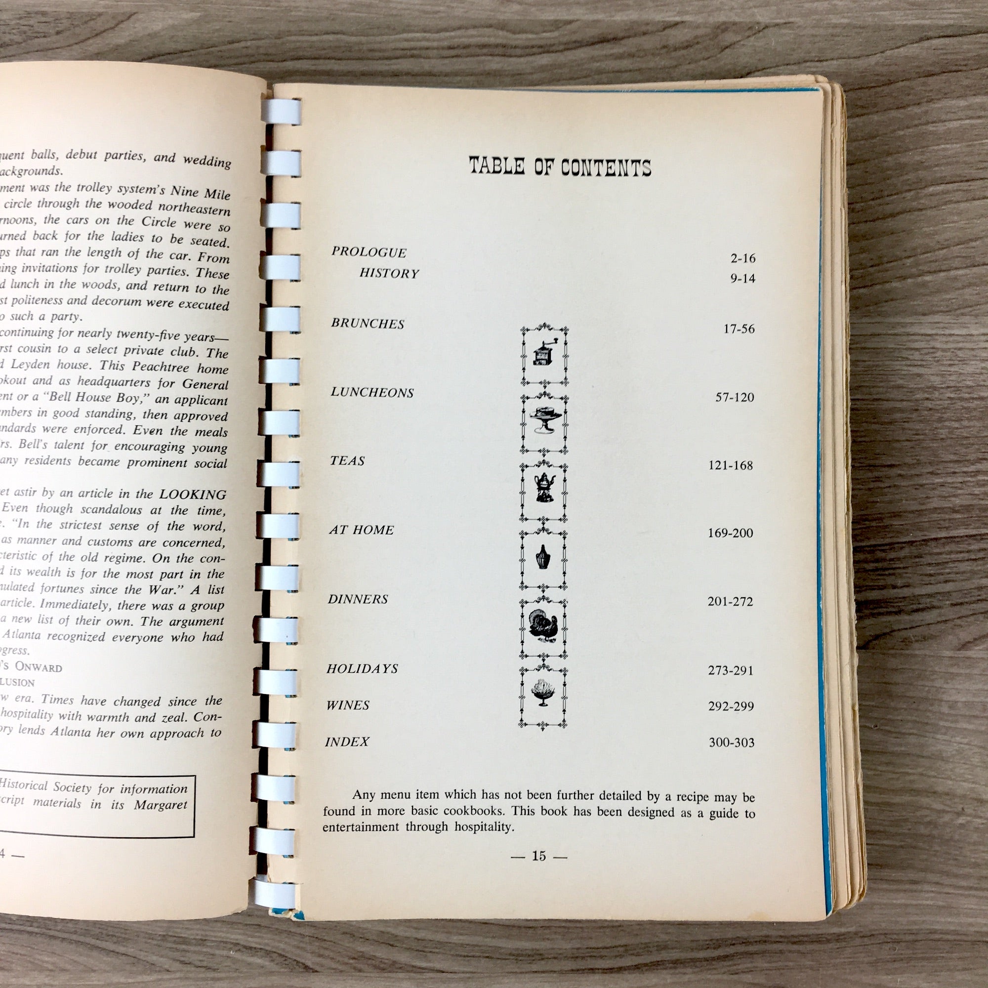 Includes a brief history of Atlanta. Recipes are organized by when and where they would be served. Black and white with spot illustrations
