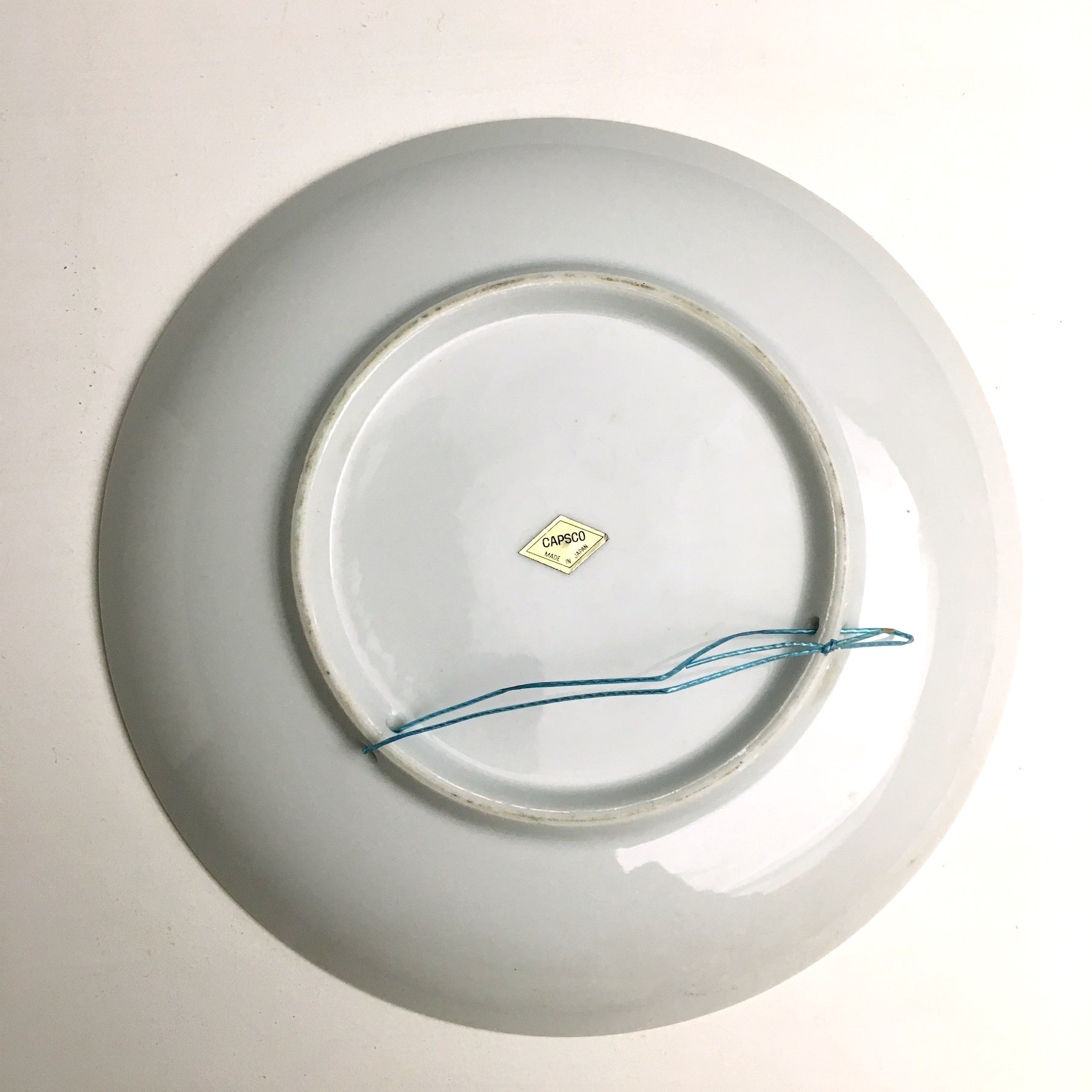 White plate with color center image is surrounded by gold printed flowers and a gold band on the rim. Made in Japan by Capsco.