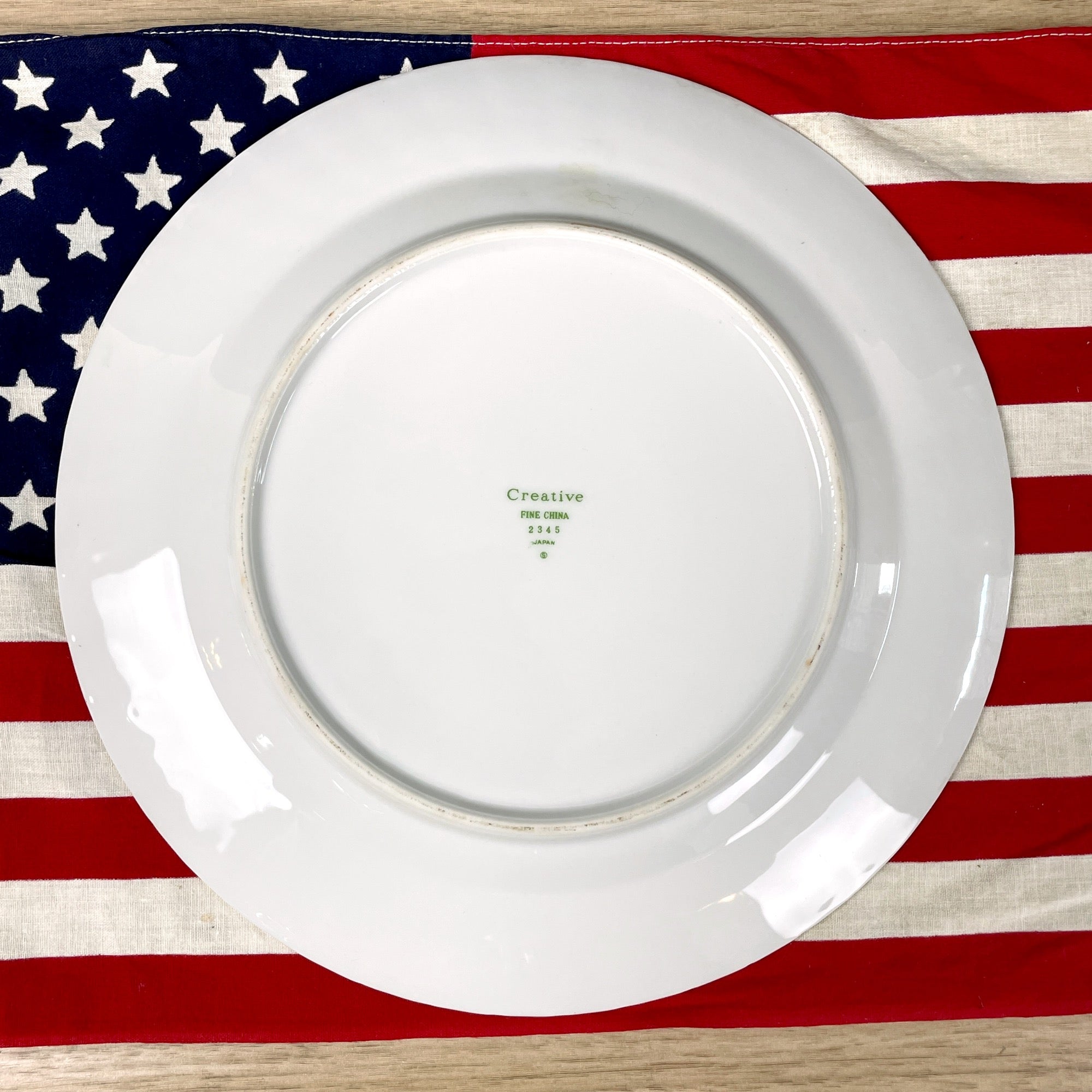 Printed on white plate with floral border. Made by Creative Fine China Japan, matches pattern 2345. Gold rim.