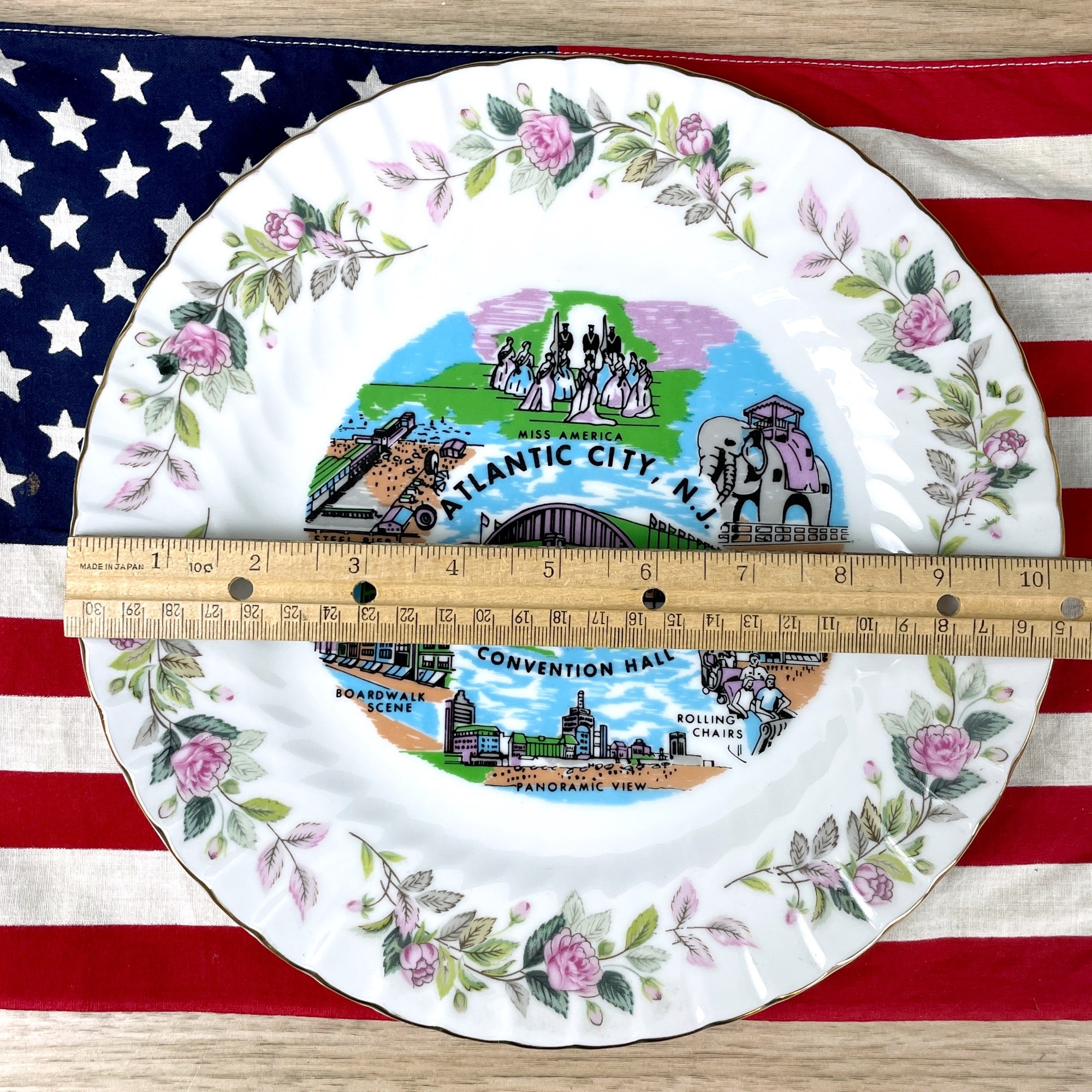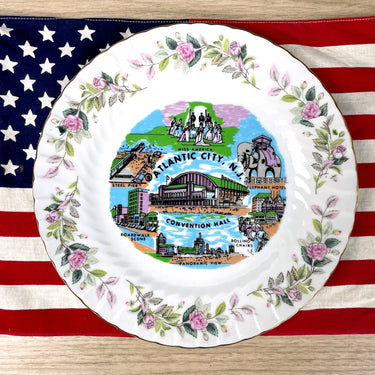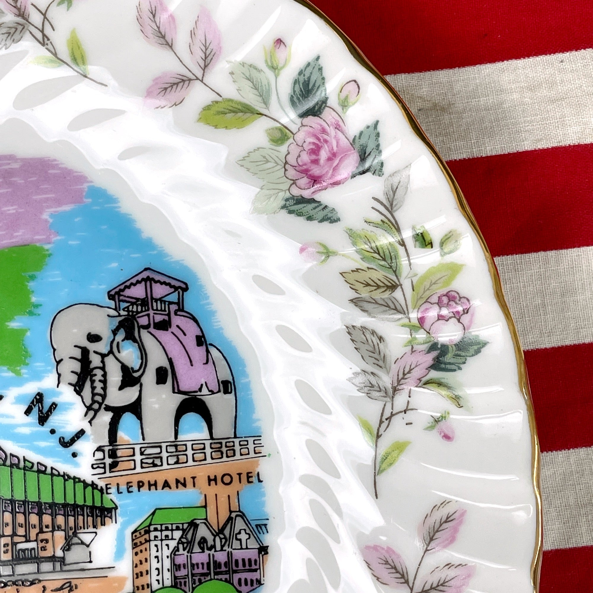Vintage 1950s souvenir travel plate from Atlantic City, NJ with pretty floral trim. Center image of Convention Hall surround by images of Elephant Hotel, Rolling Chairs, Boardwalk Scene, Steel Pier, and Miss America pageant.