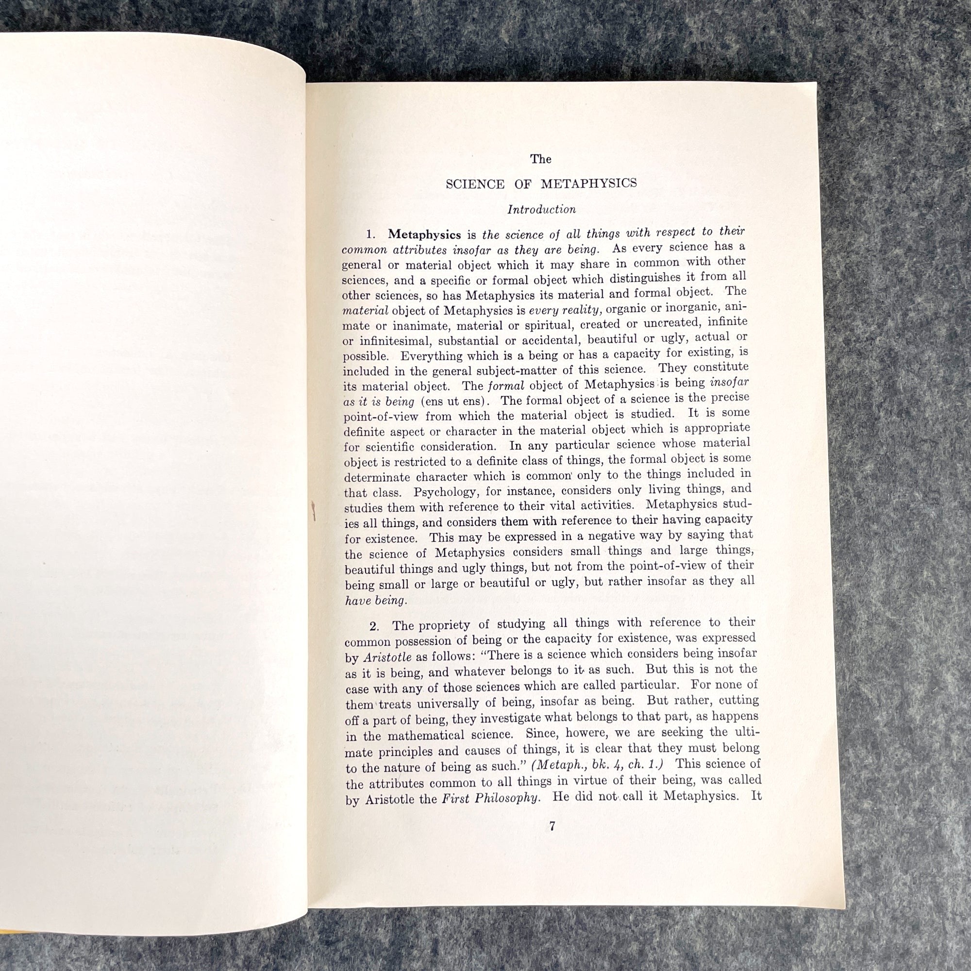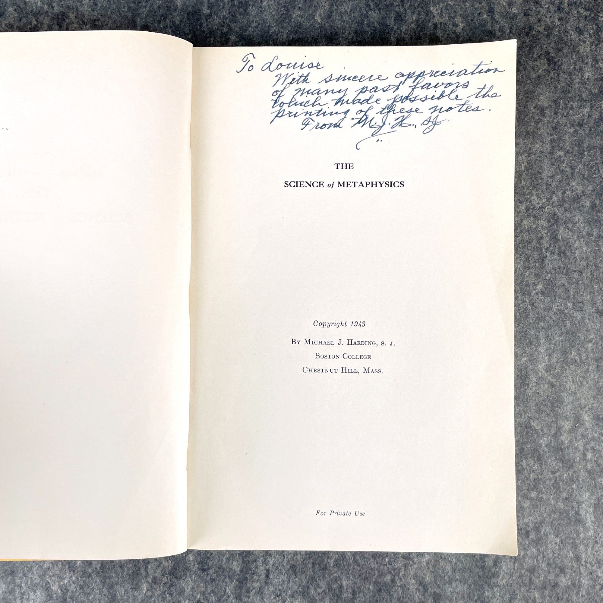 "The Science of Metaphysics" by Michael J Harding, S.J. is inscribed by the author "To Louise, With sincere appreciation for many past favors which made possible the printing of these notes." Copyright is 1943, Boston College. Marked "For Private Use". Yellow textured heavy paper cover., bound with staples on the inside, 126 pages. This may be one of a kind - OOAK.