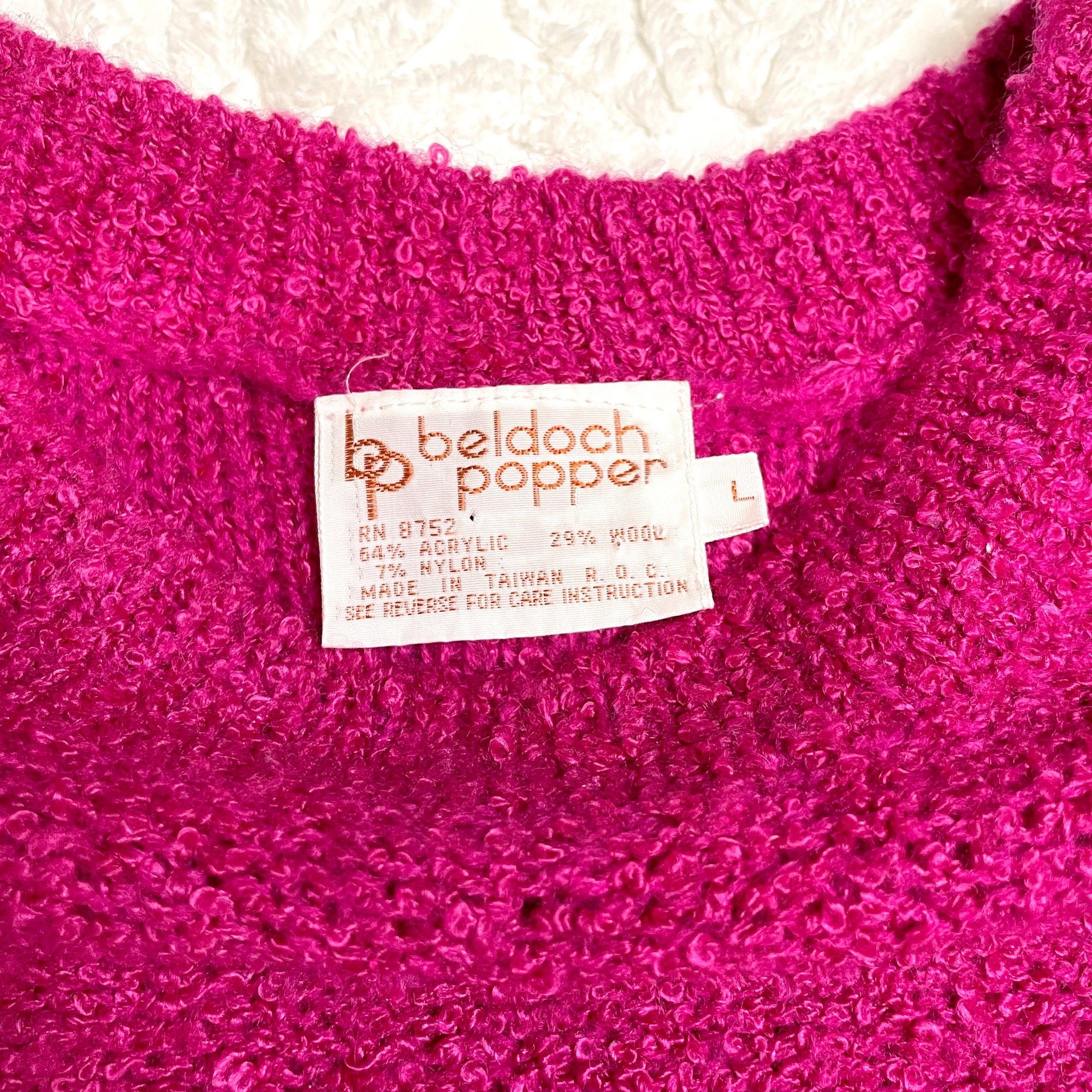 Vintage 1980s boucle knit pullover sweater by Beldoch Popper. Three quarter raglan sleeves. Round neck. Wide ribbed waistband. Wool blend.