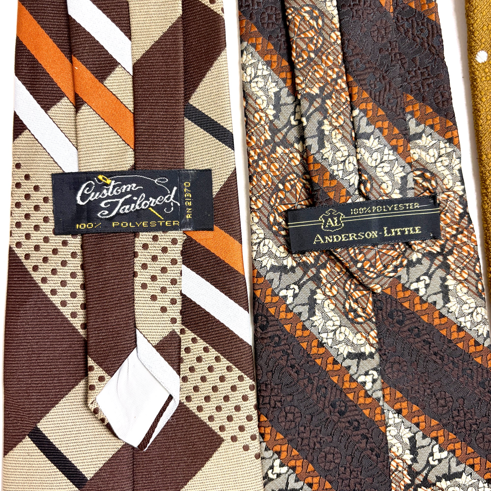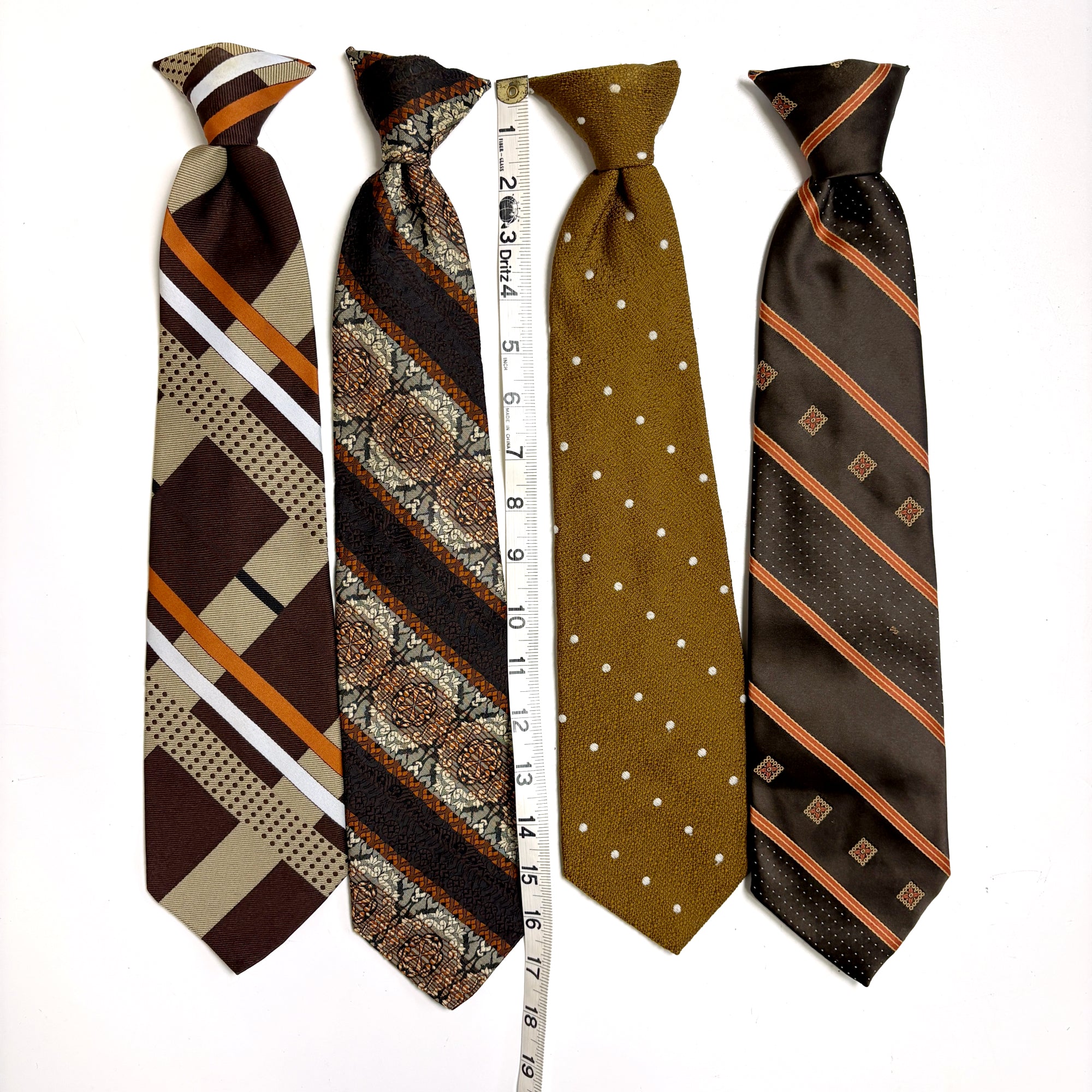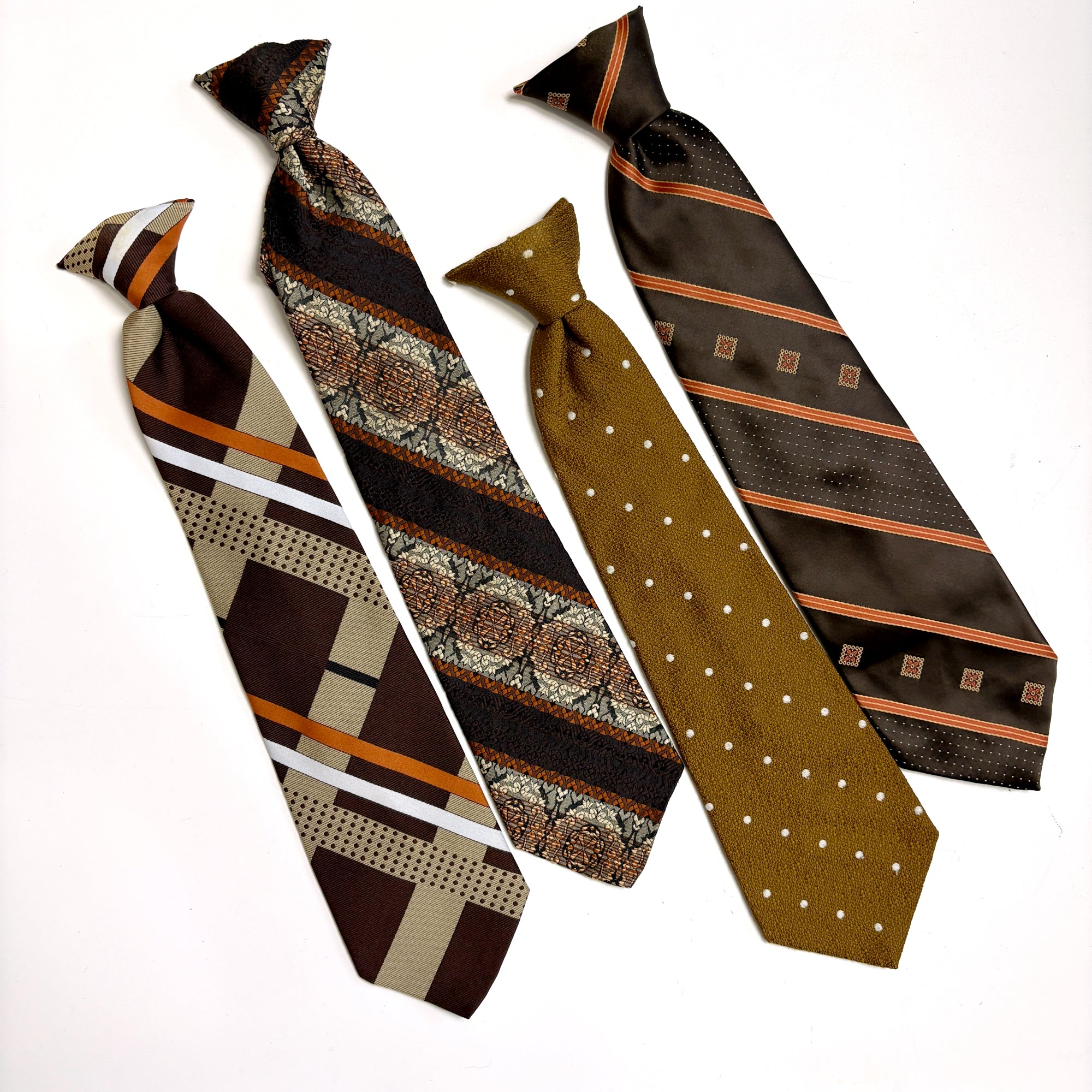 Set of four brown 1970s vintage clip on wide neckties adds quick change versatility to the wardrobe of any dude or girlie. Clip on, clip off, no mess, no knot, no bother. This may be a shock to you, but these ties are 100% polyester.