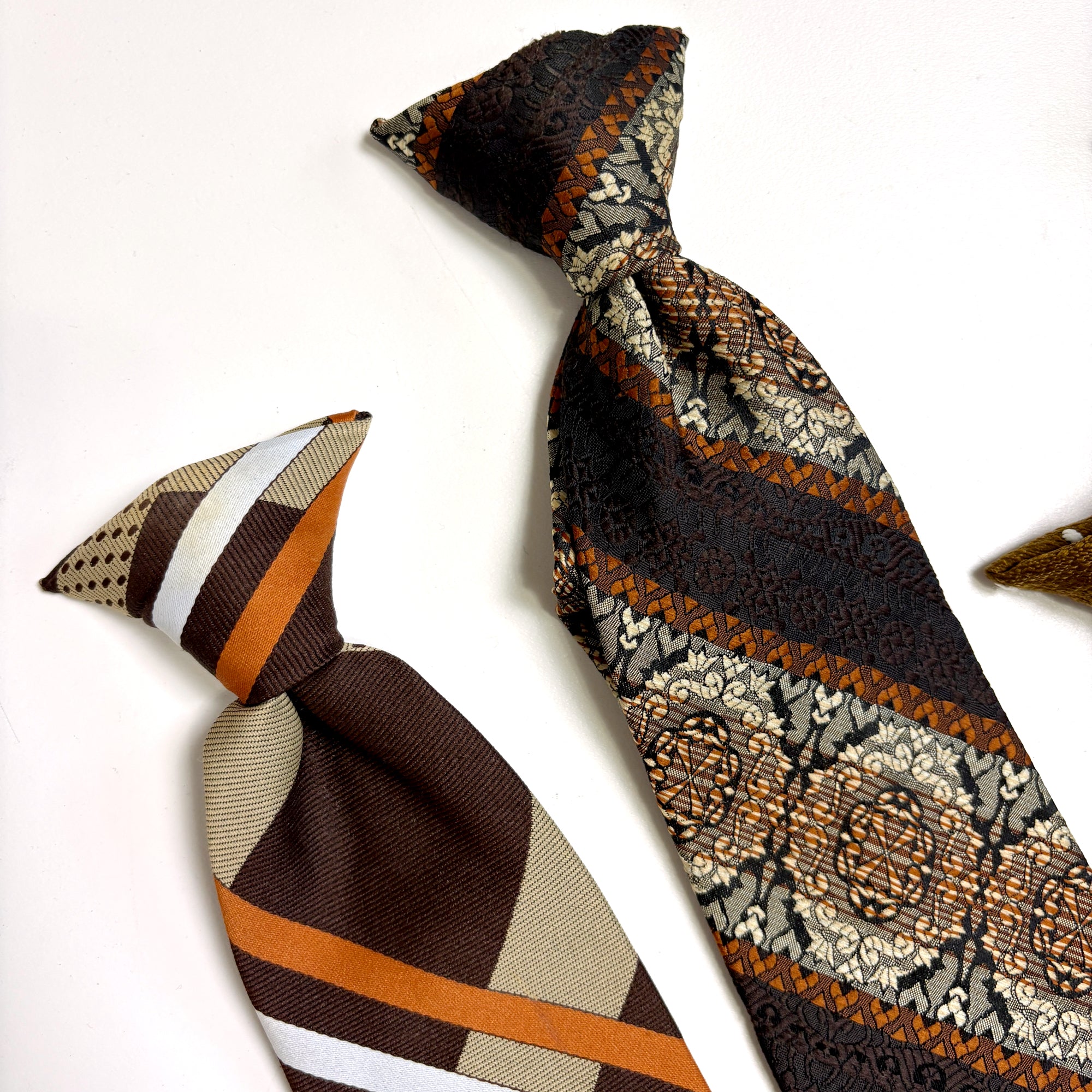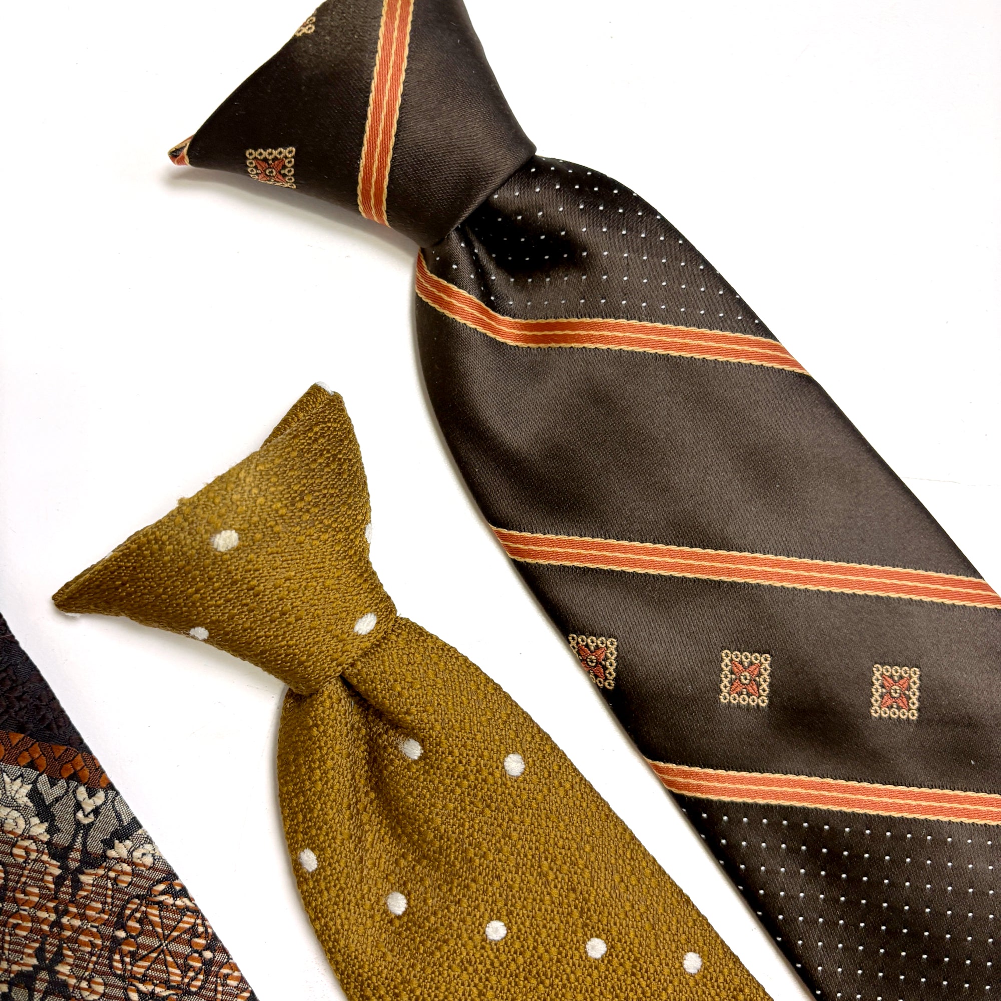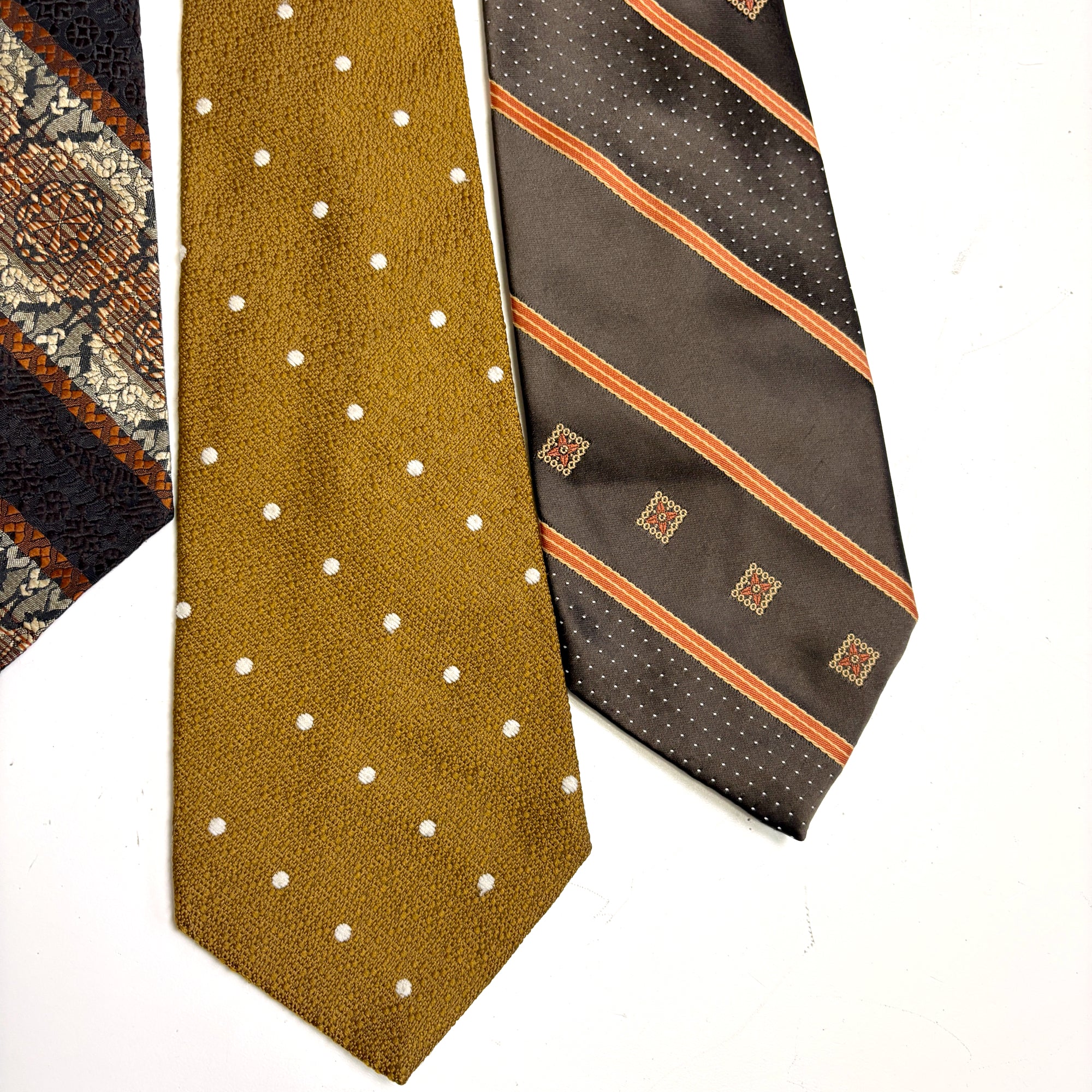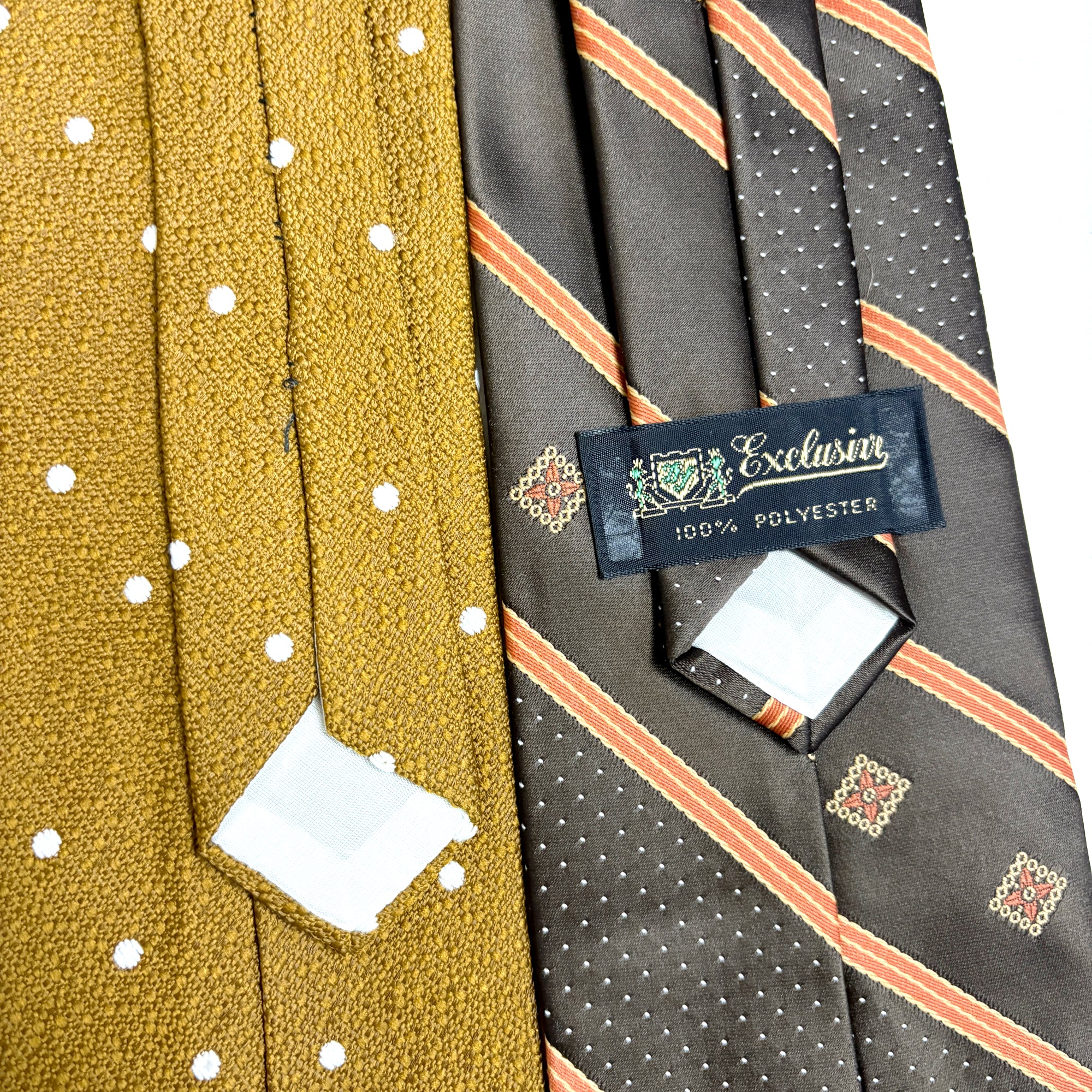 Set of four brown 1970s vintage clip on wide neckties adds quick change versatility to the wardrobe of any dude or girlie. Clip on, clip off, no mess, no knot, no bother. This may be a shock to you, but these ties are 100% polyester.