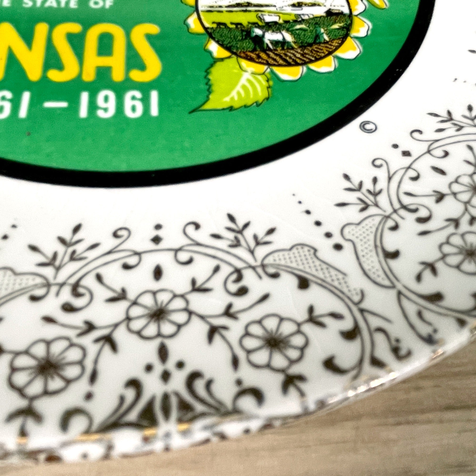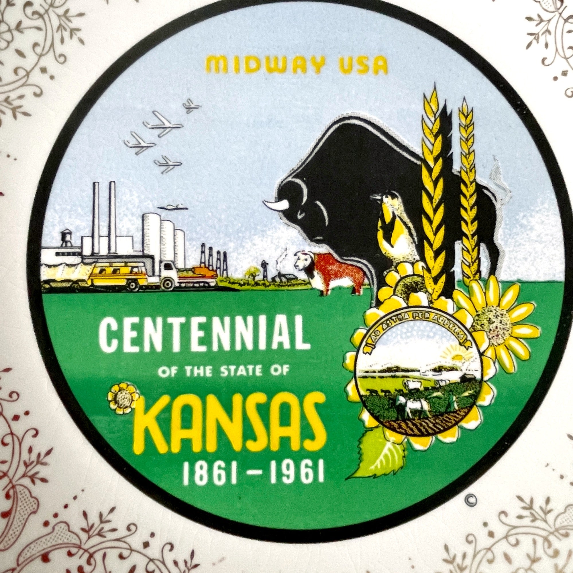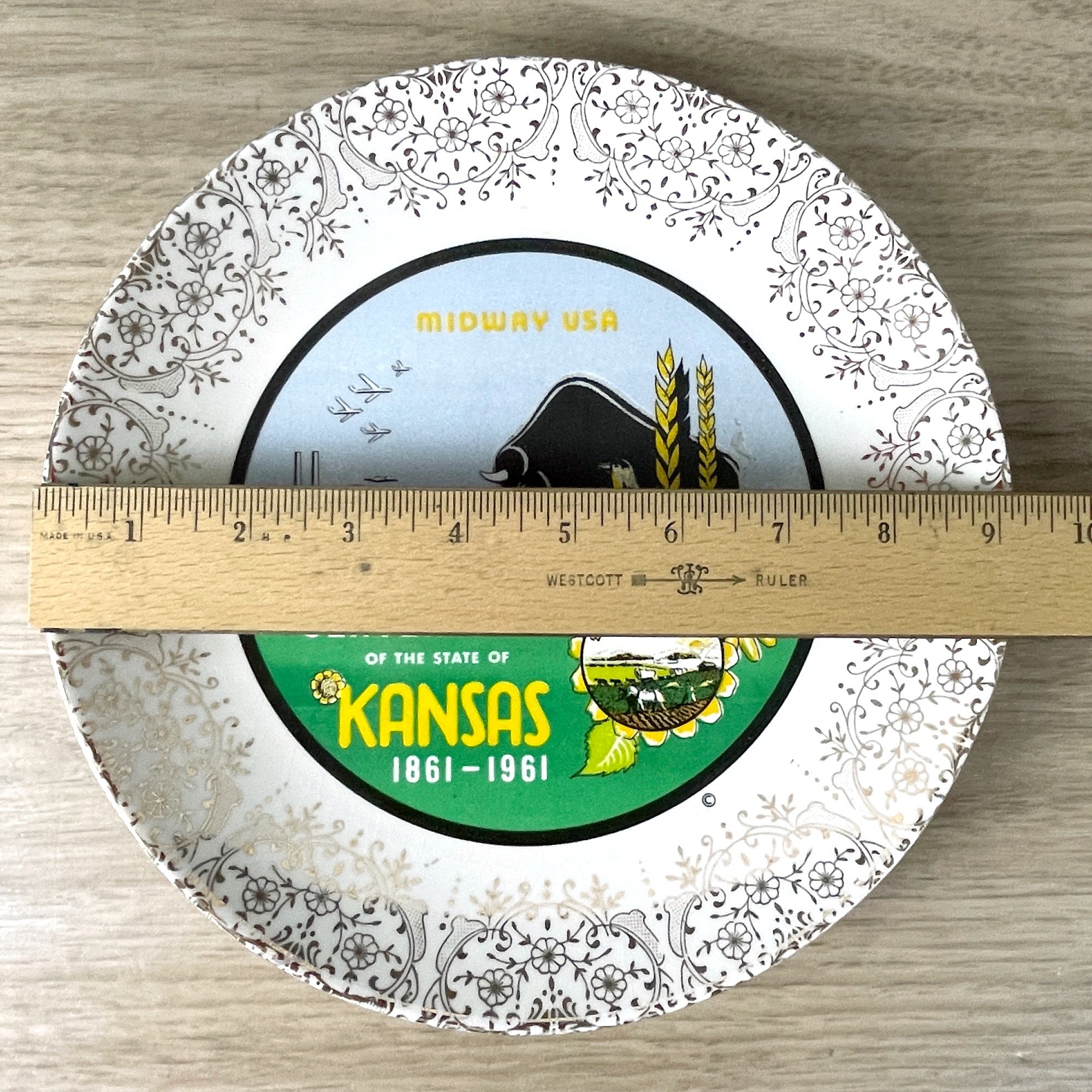 Vintage 1960s souvenir travel plate honoring the Centennial of Kansas, 1861-1961. Symbols represent buffalo, farming, manufacturing, sunflowers, and the state seal. Marked Kansas Centennial Distributors, Inc, Topeka Kansas.