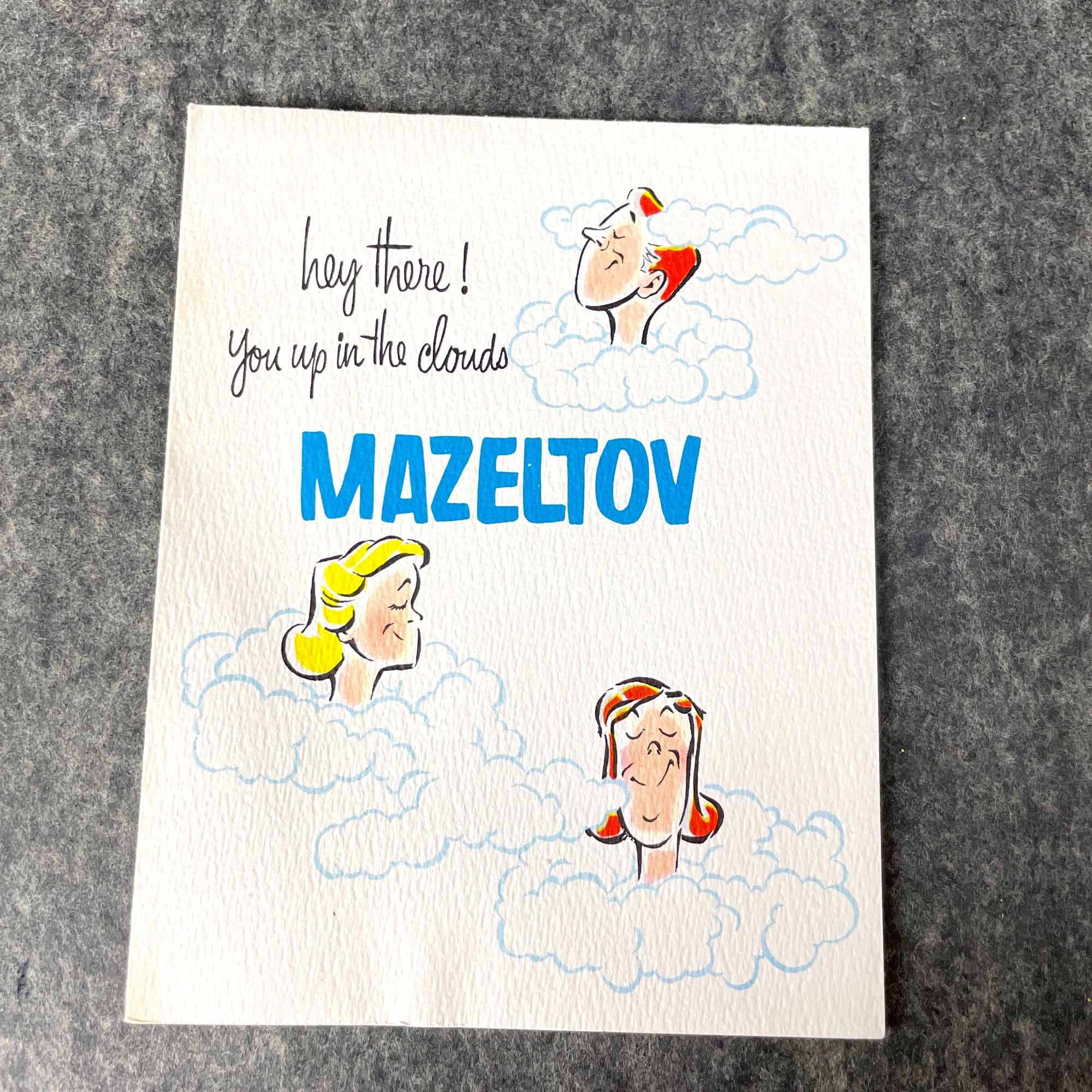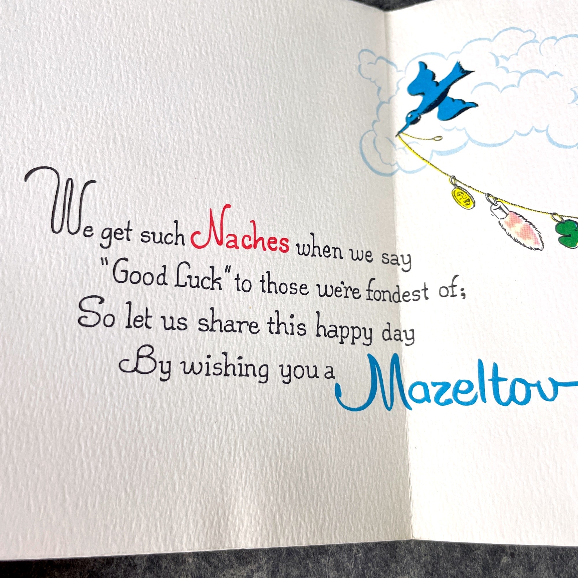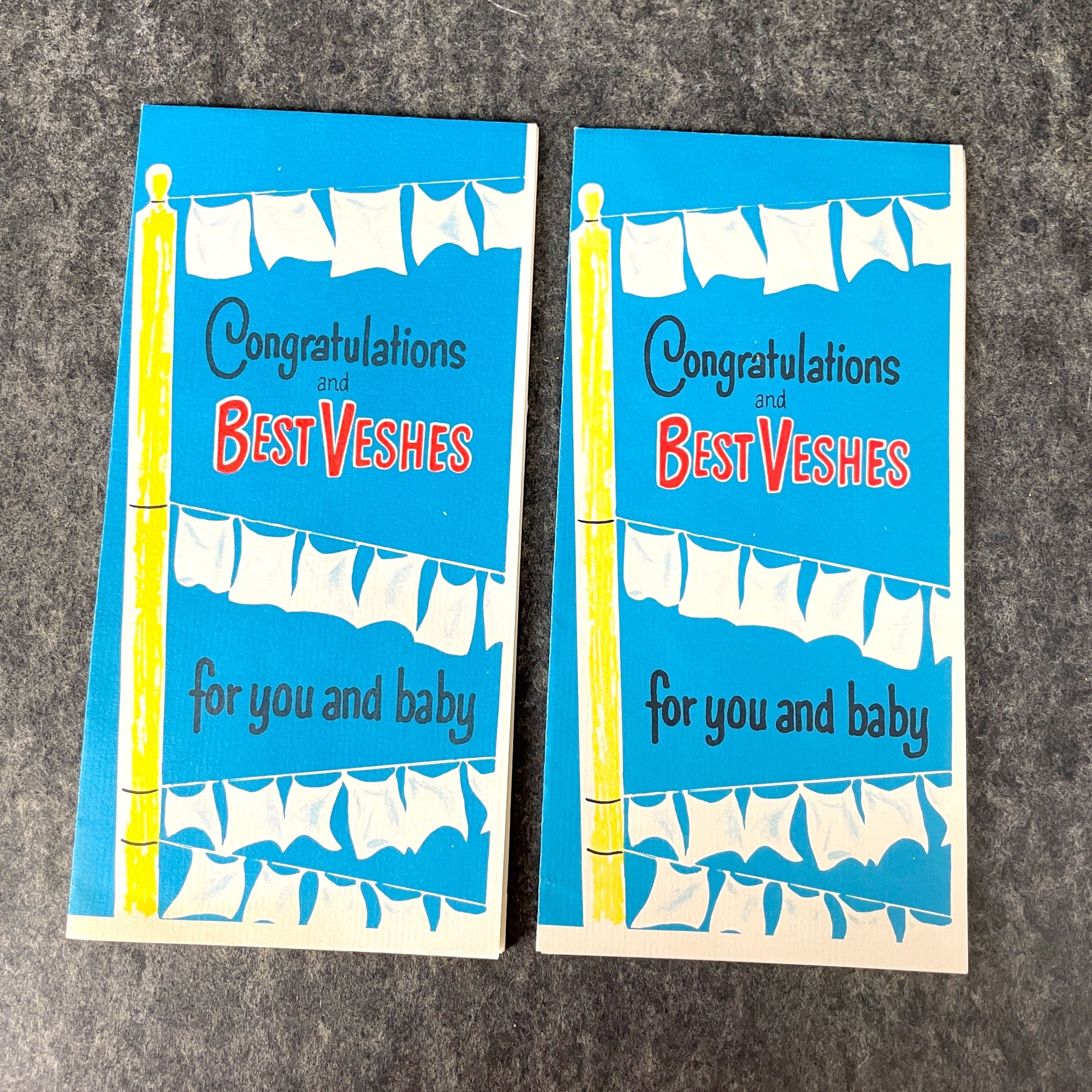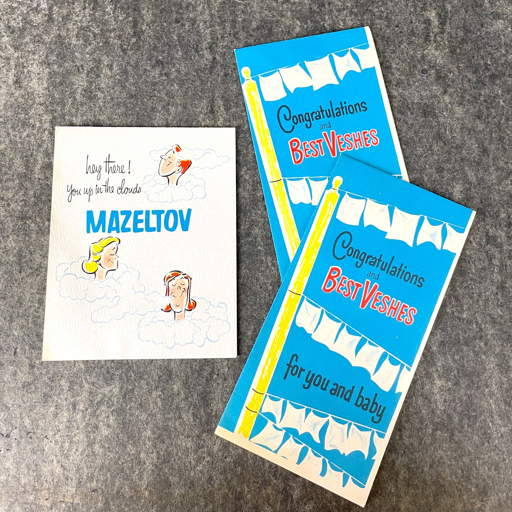 3 Jewish greeting cards from the 1950s and 1960s for collecting and art projects. Two "Best Veshes" baby cards, and one "Mazeltov" wedding card are included. All are used. No envelopes.
