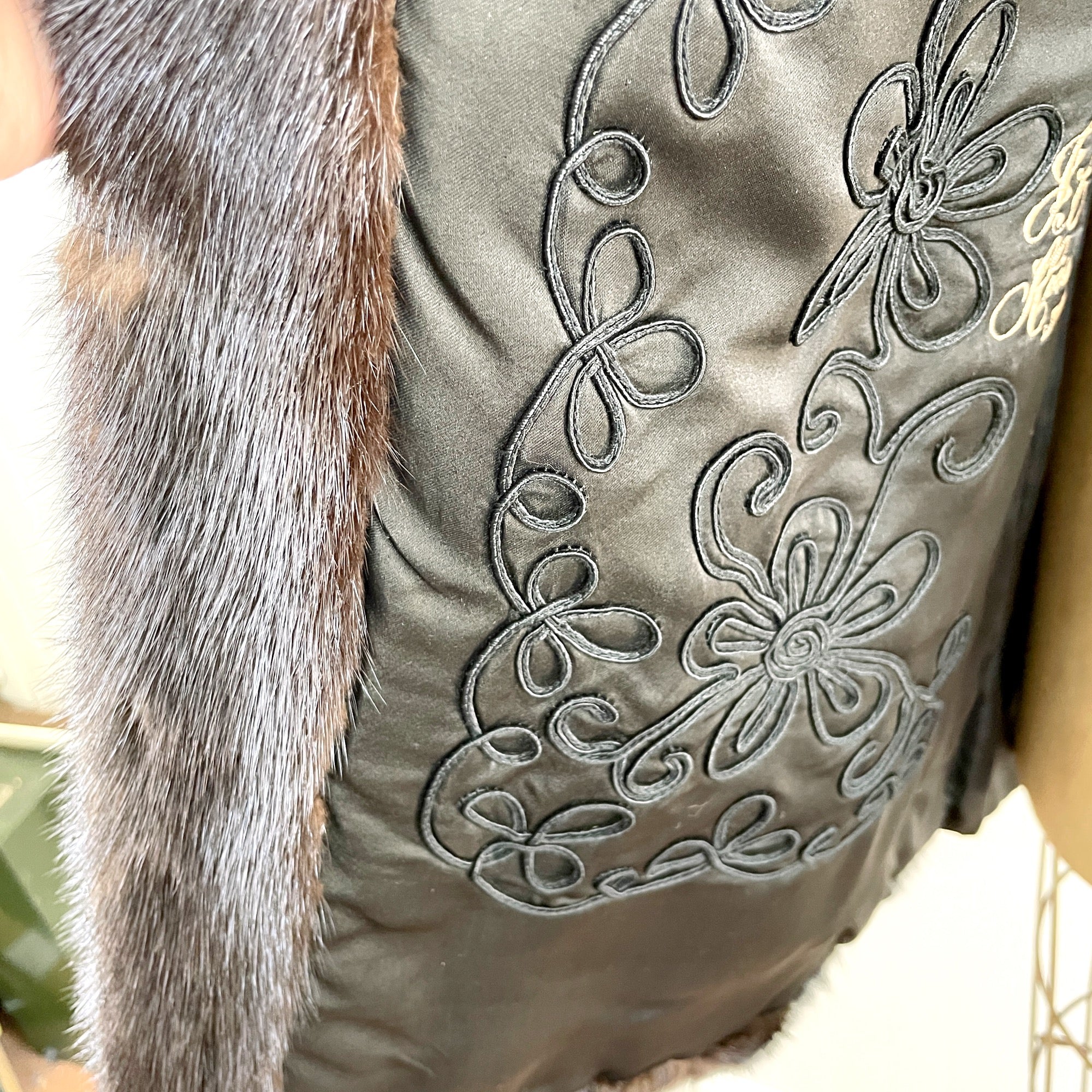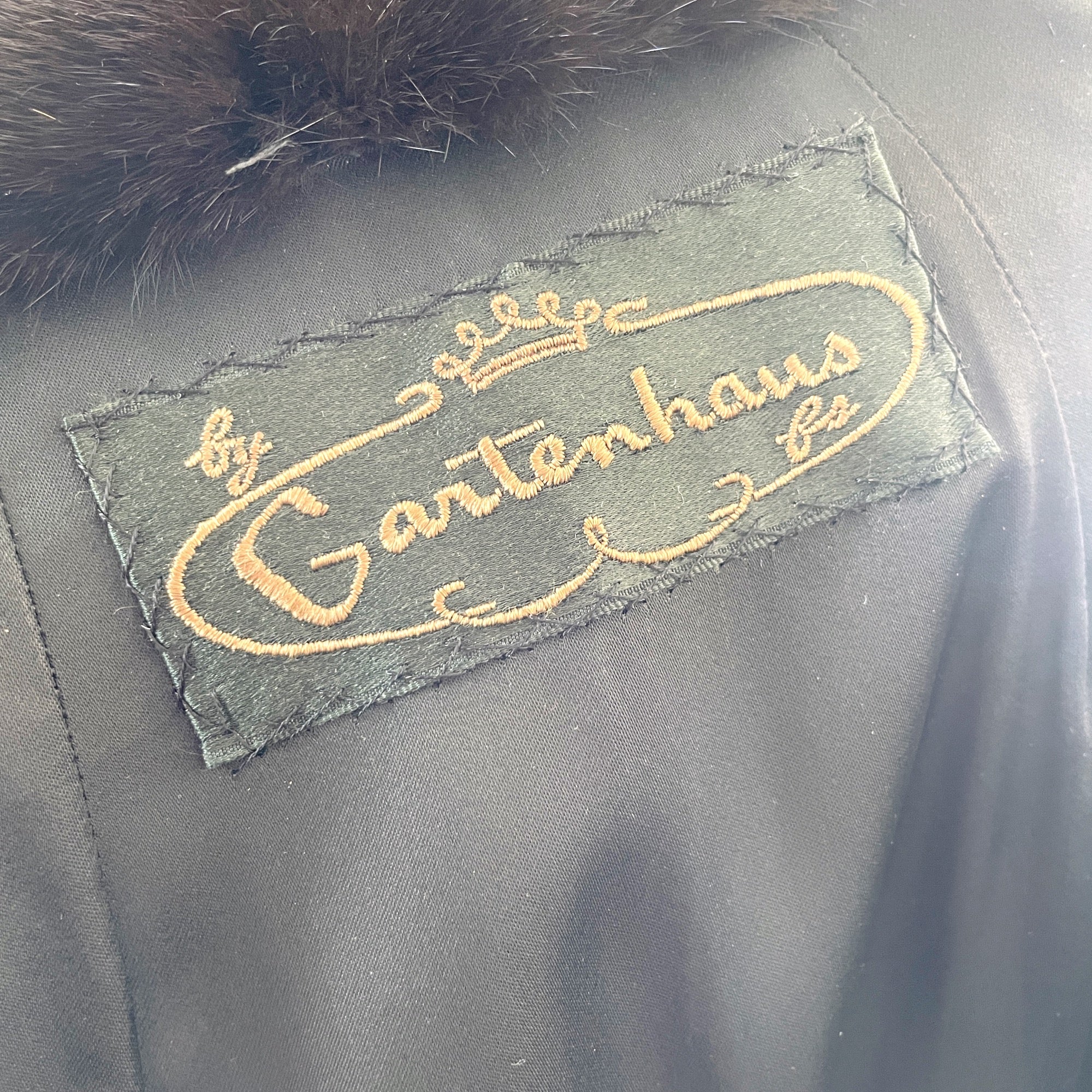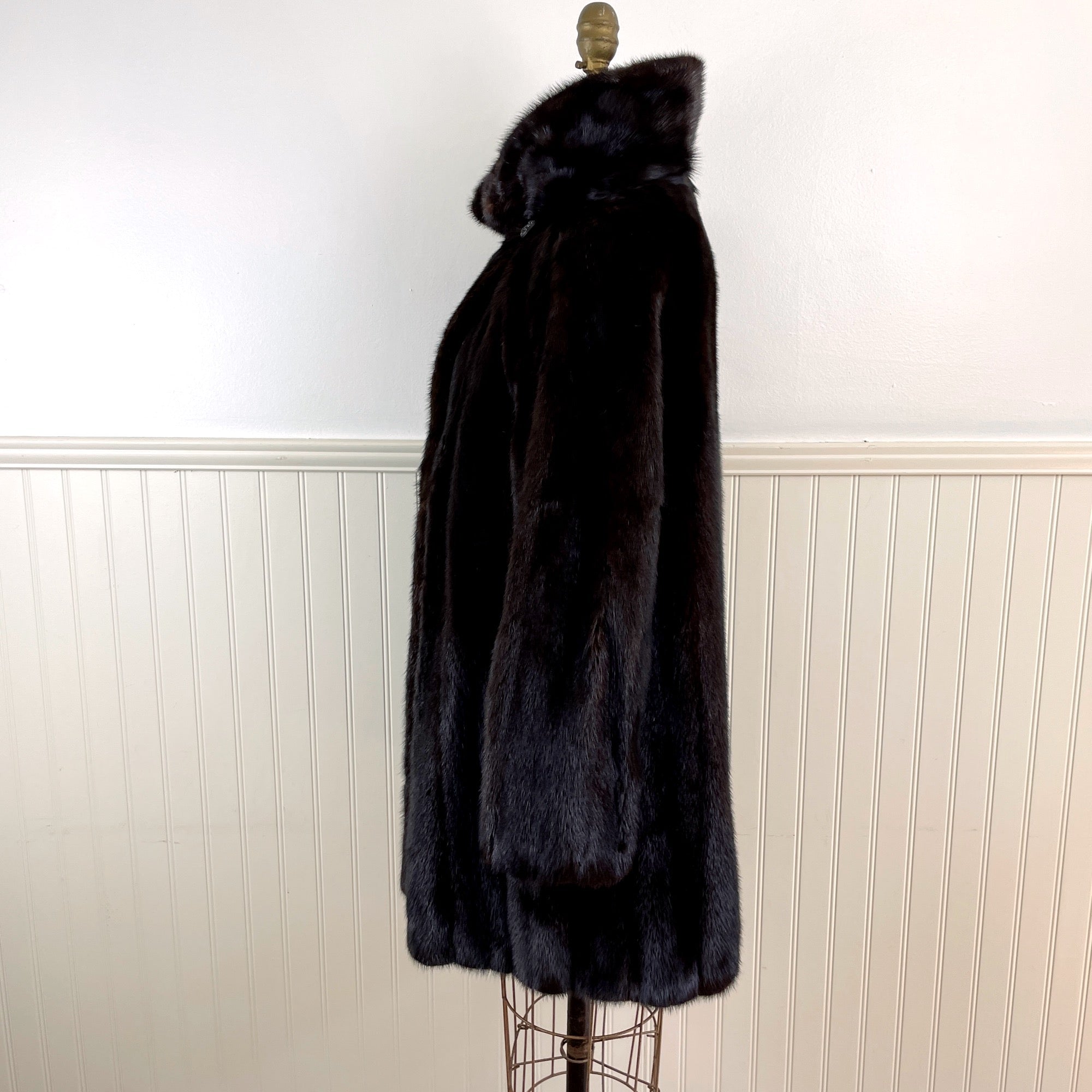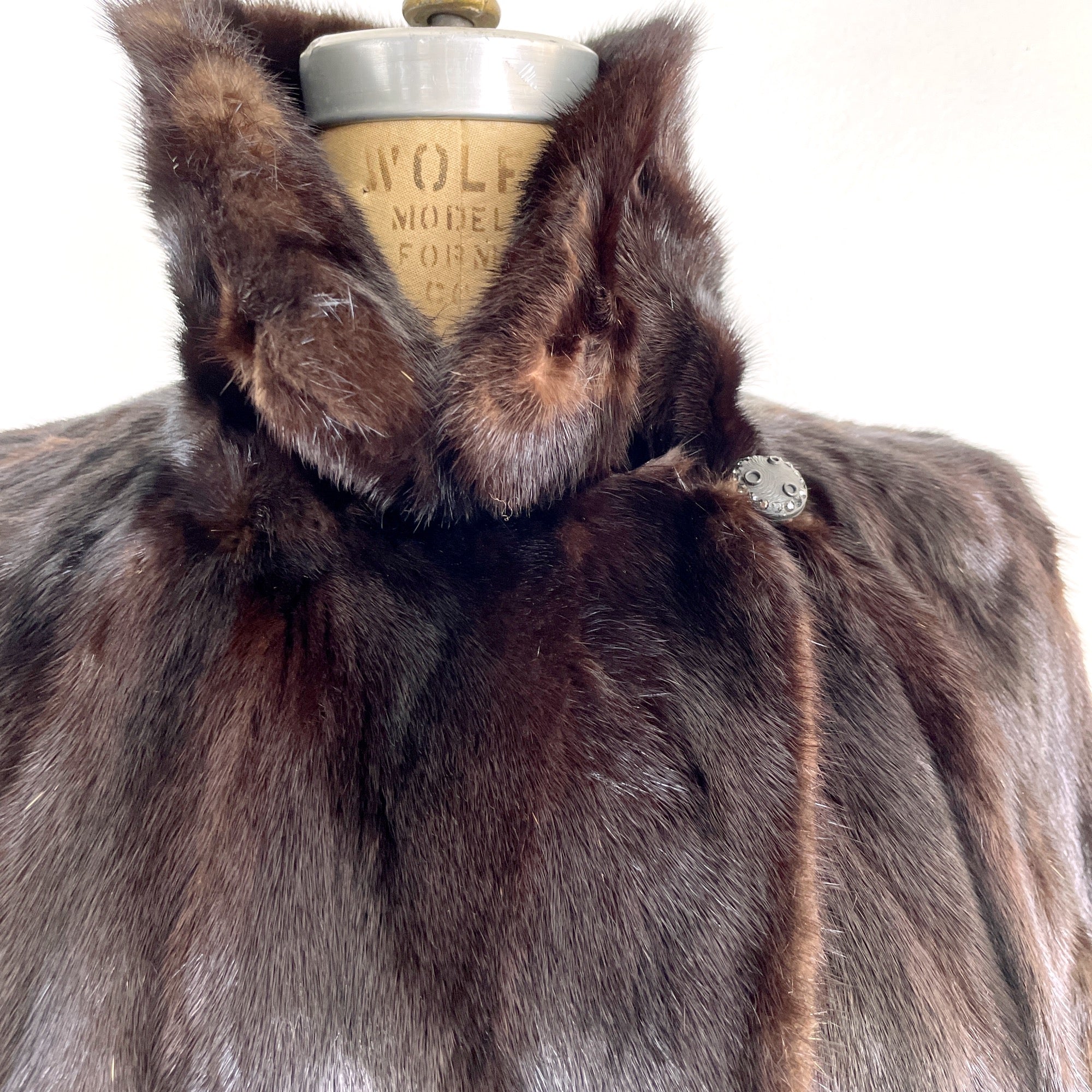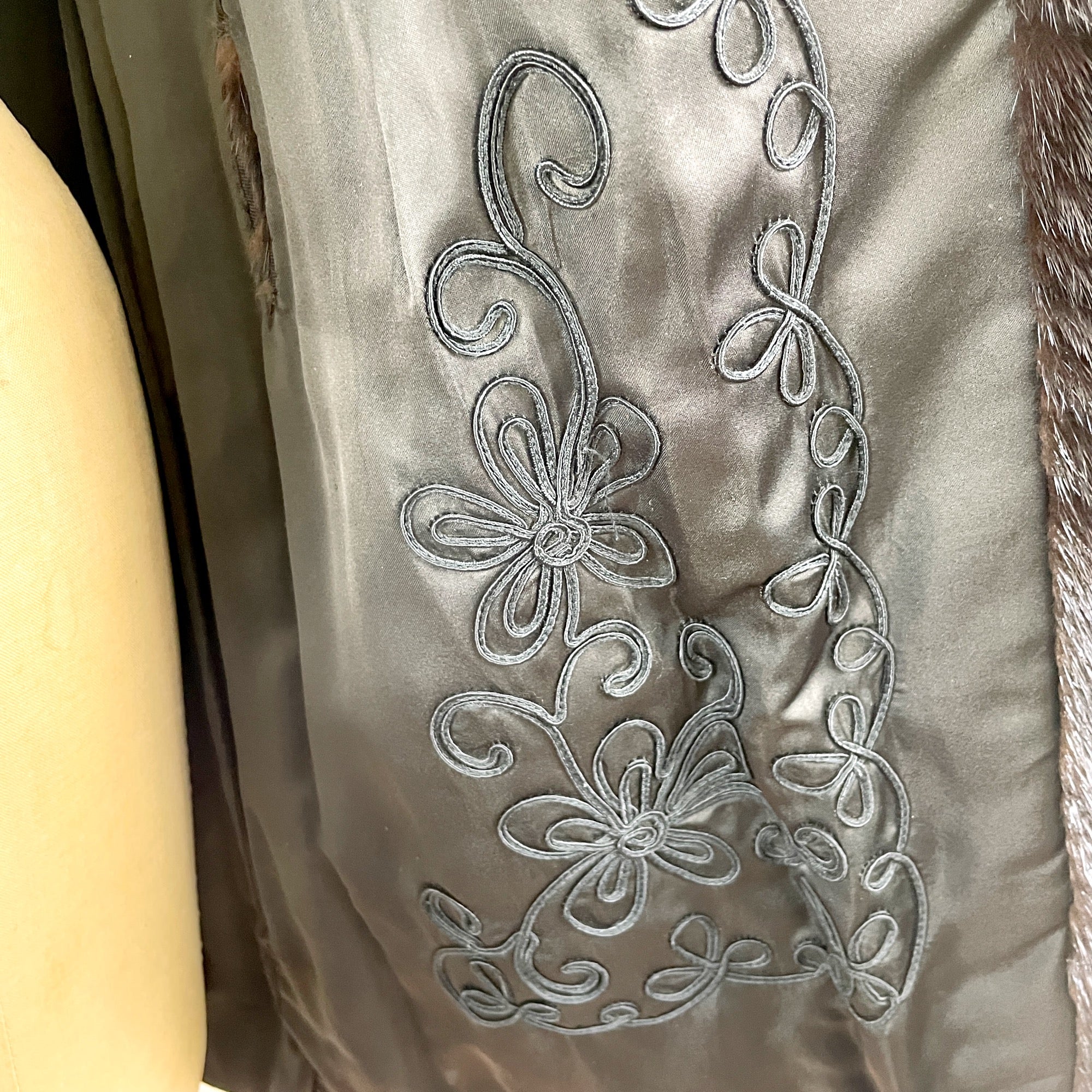 Vintage jacket length dark brown mink jacket by Gartenhouse. Shawl collar. Full raglan sleeves. Pockets. Originally had a belt, there are openings in the sides. Embroidery on the satin lining. Former owners name inside.