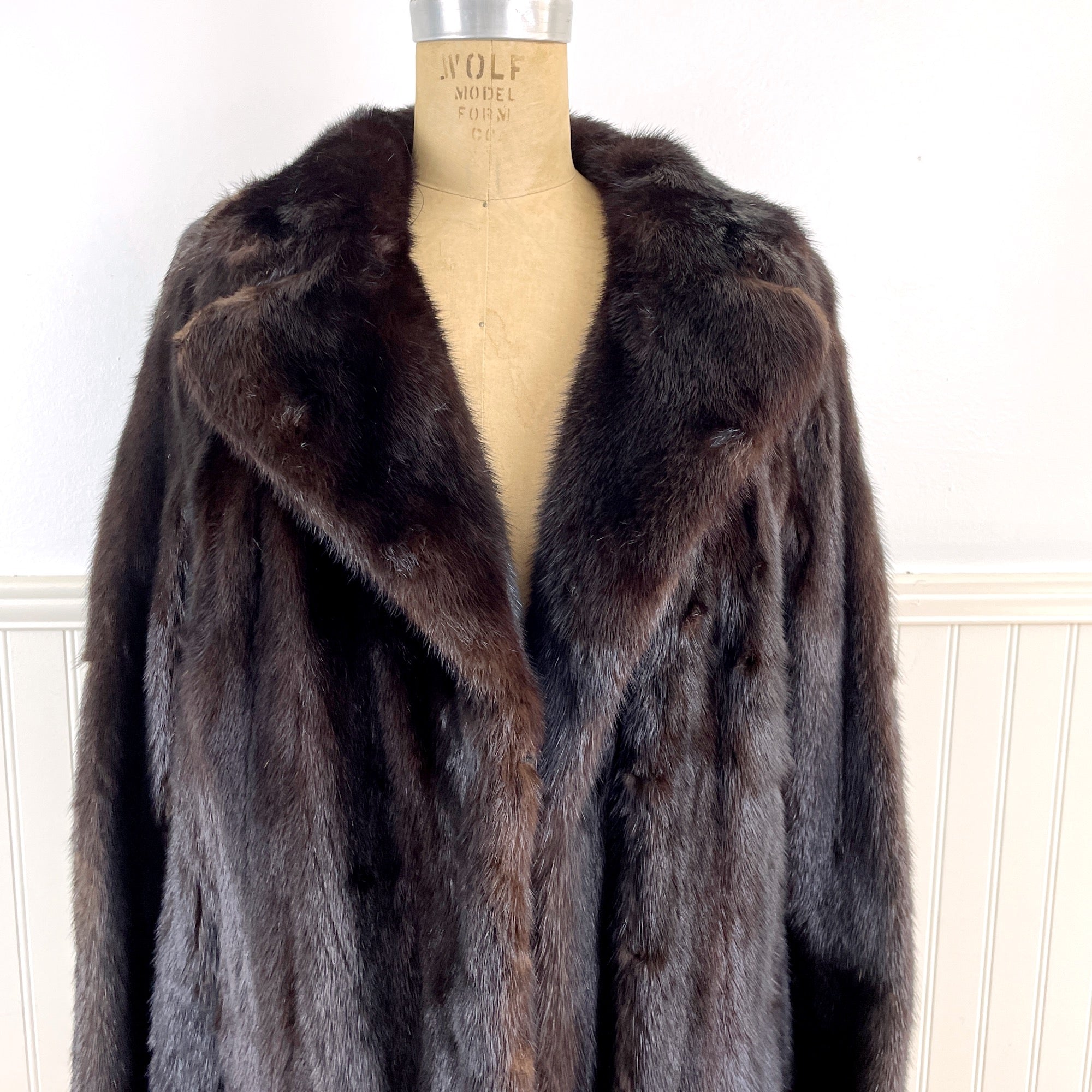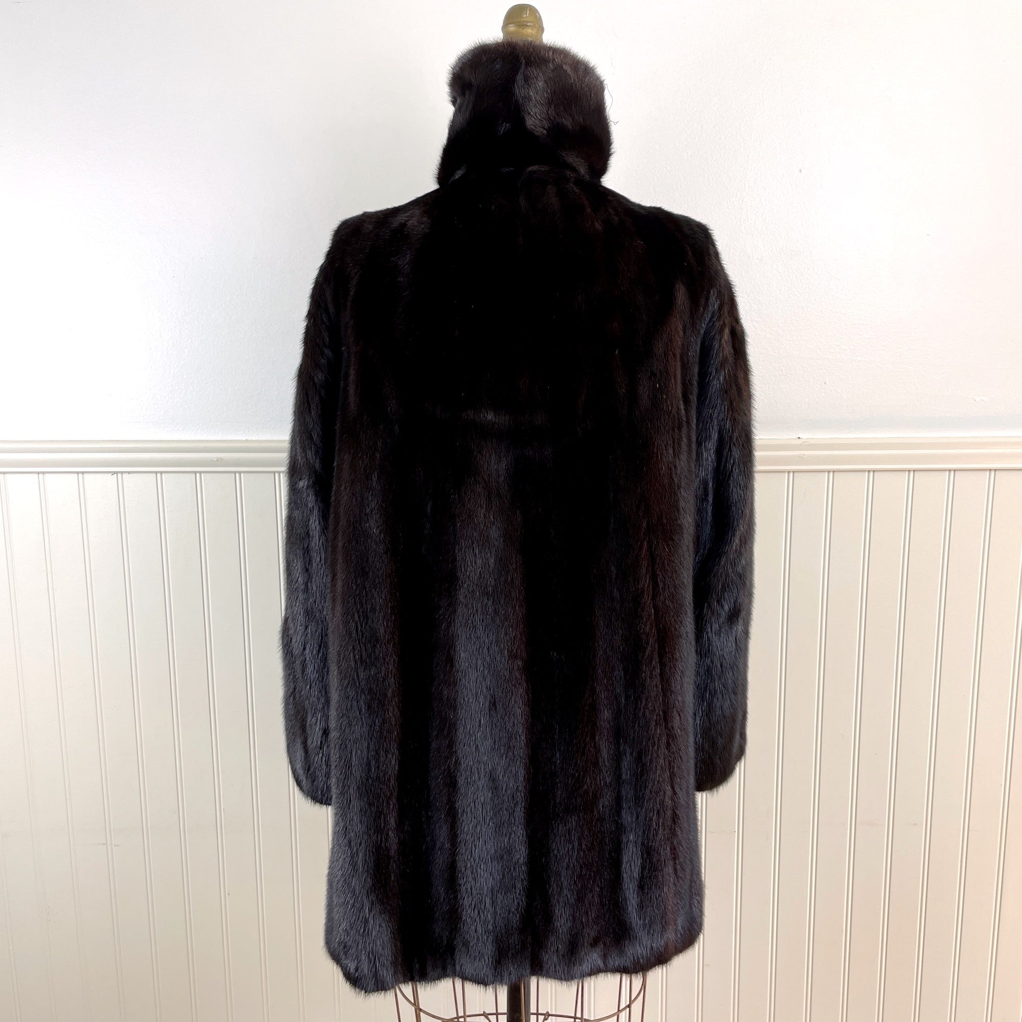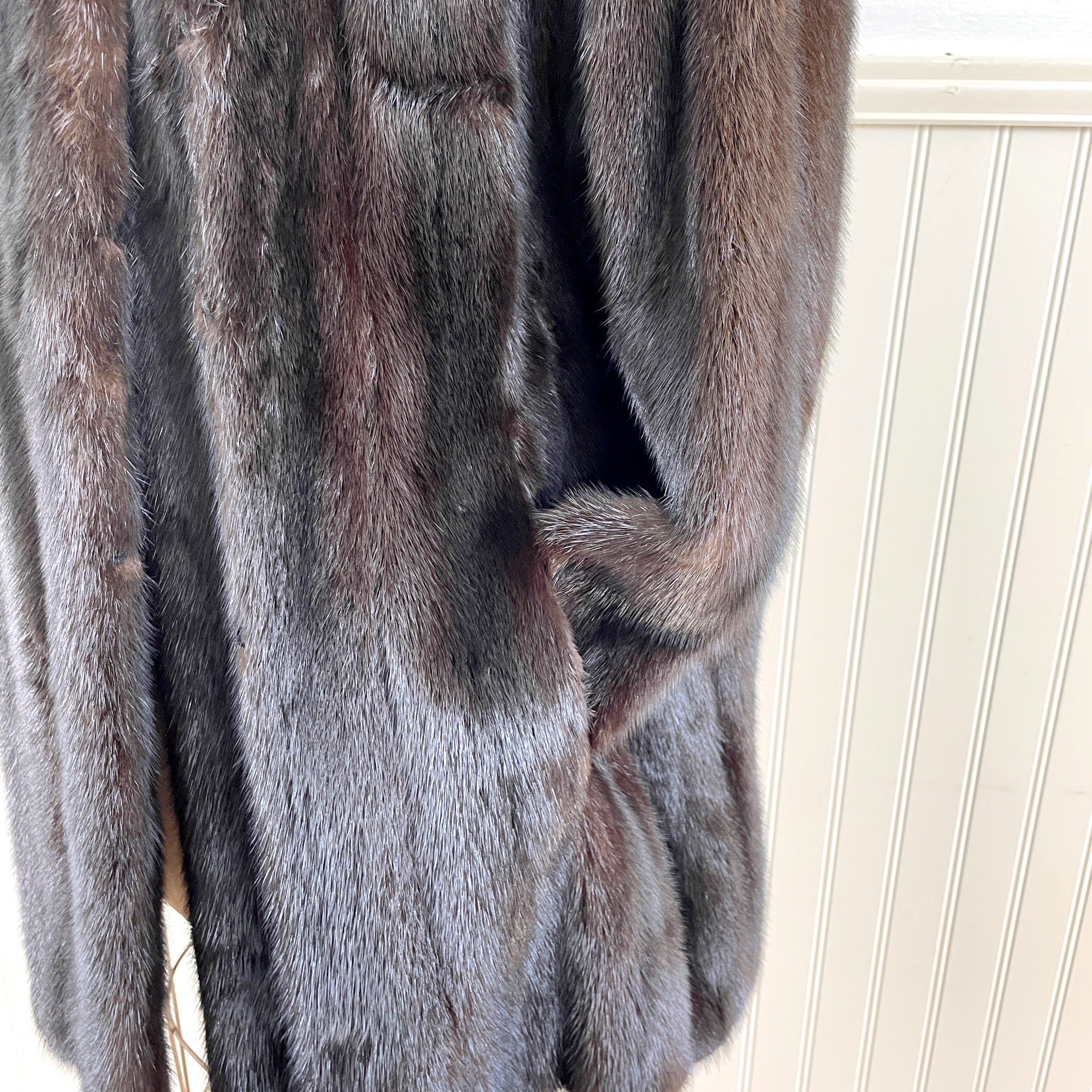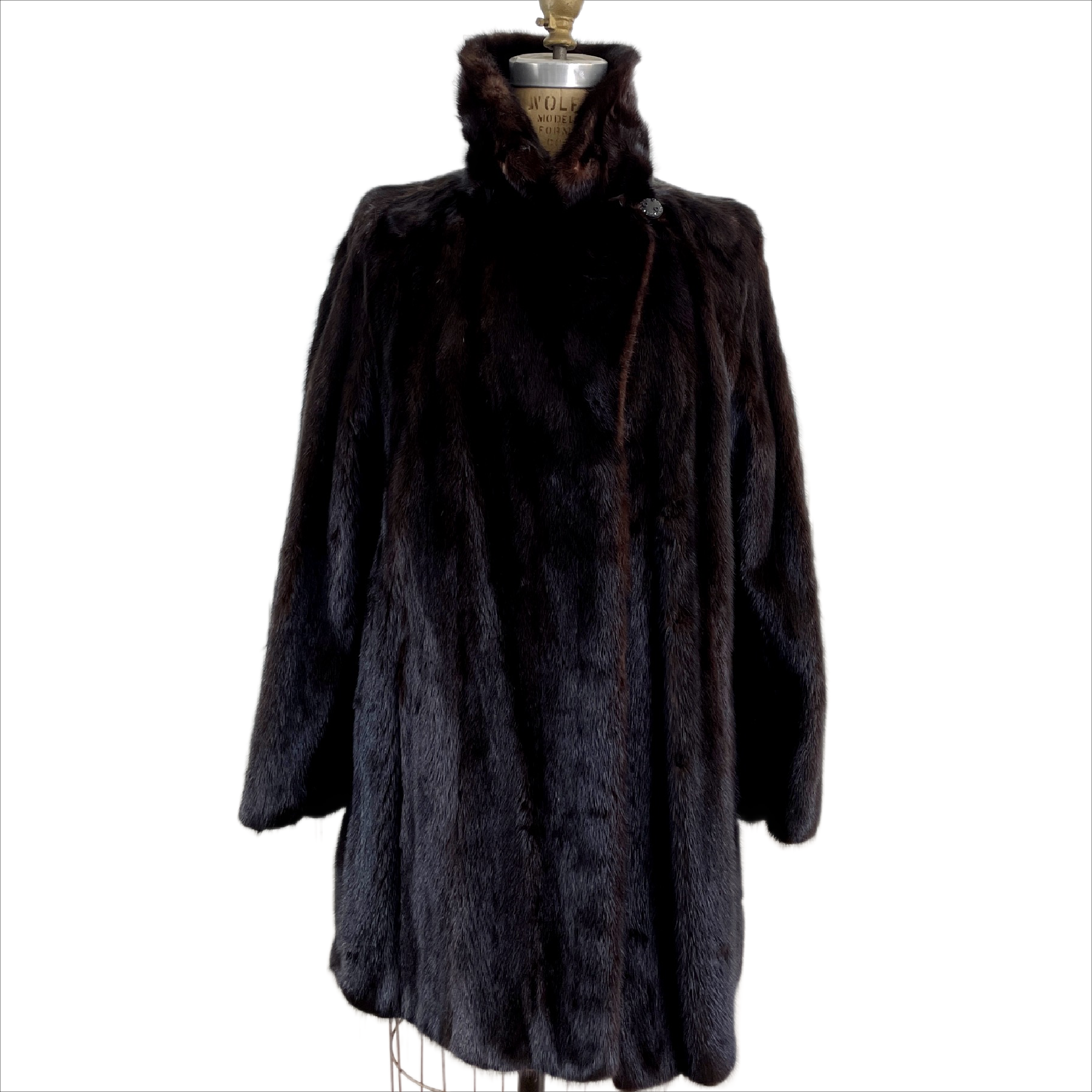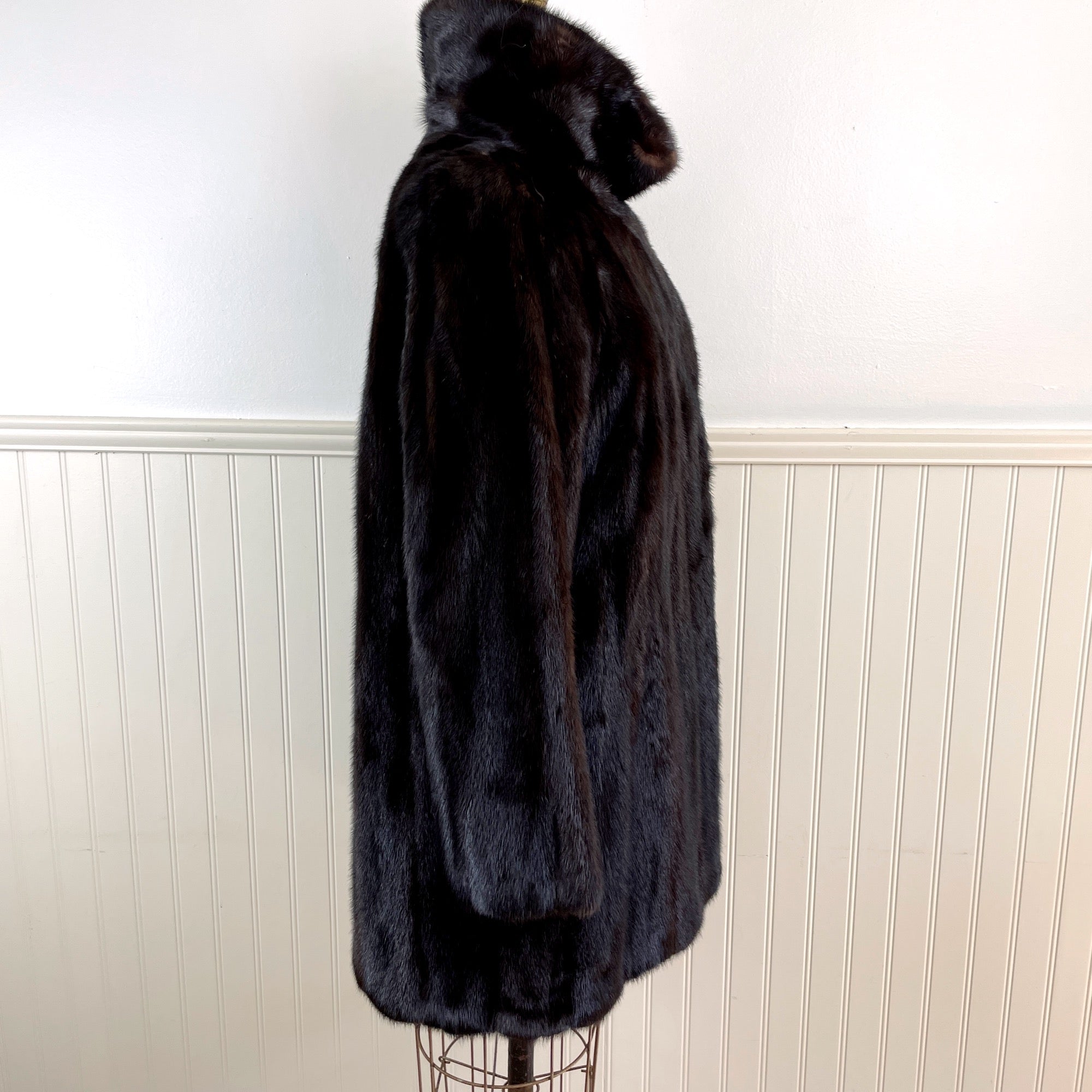 Vintage jacket length dark brown mink jacket by Gartenhouse. Shawl collar. Full raglan sleeves. Pockets. Originally had a belt, there are openings in the sides. Embroidery on the satin lining. Former owners name inside.