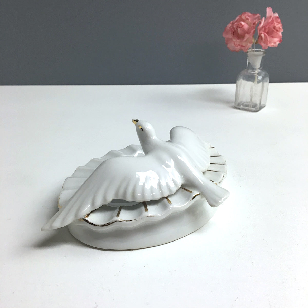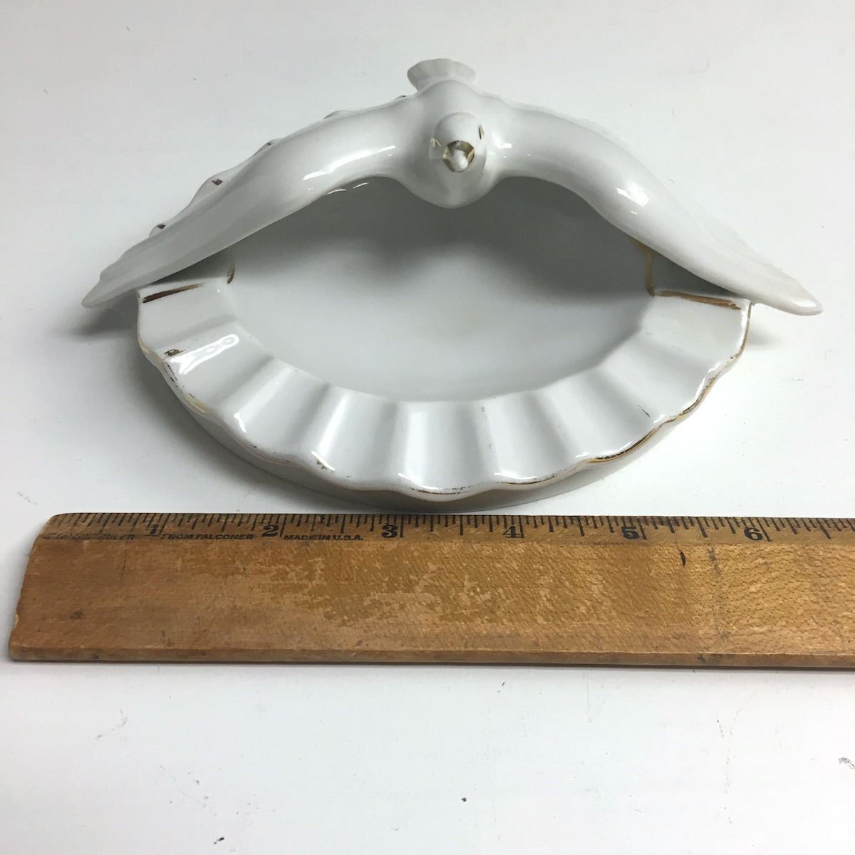 White china dove with it's wings spread over a scalloped dish. Stamped 4098 on the back under the tail. White china with metallic gold trim.