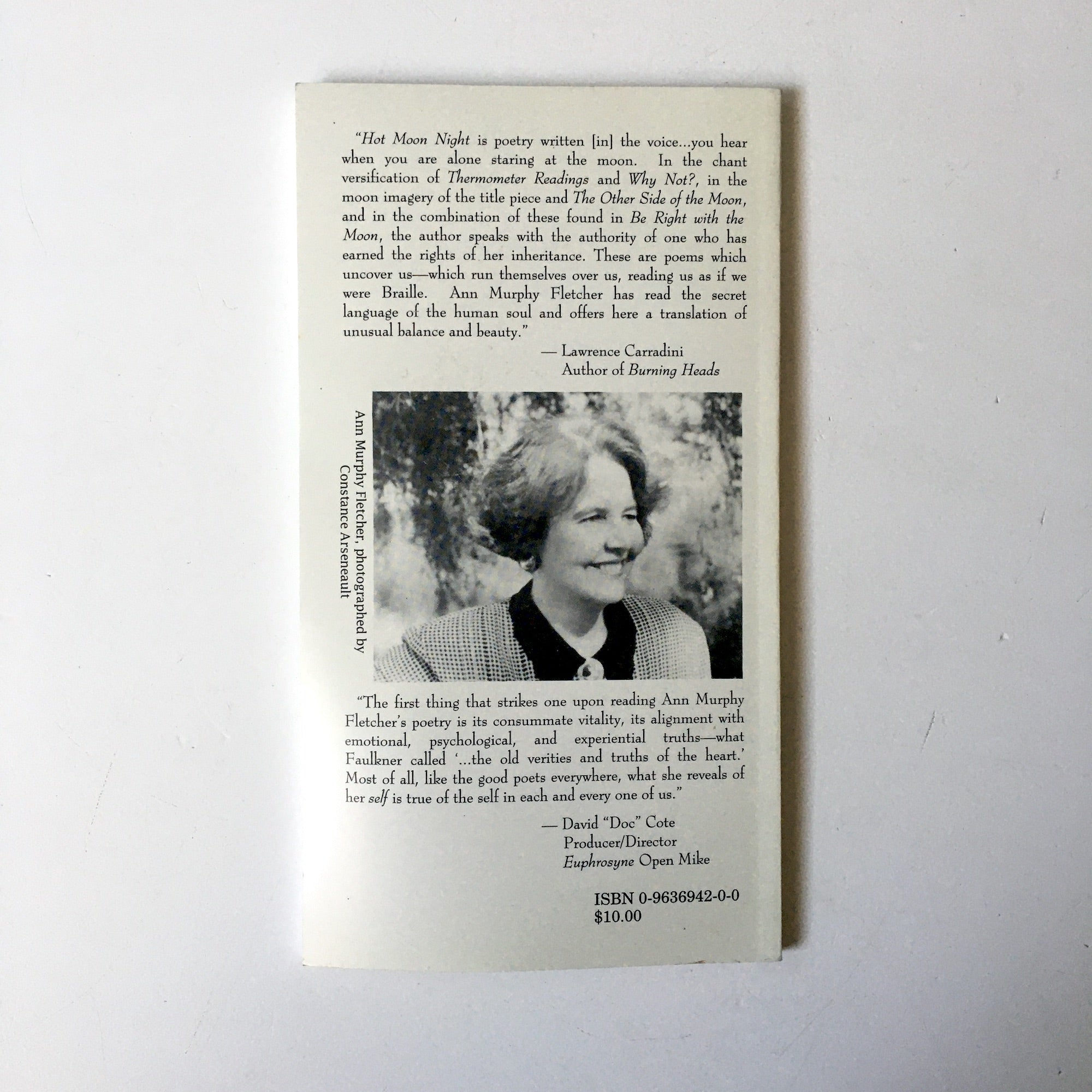 "Hot Moon Night" by Ann Murphy Fletcher. A slim volume of poetry published by VB Documentation Enterprises of Natick, MA. 1998. Paperback. Signed by the author on the title page.