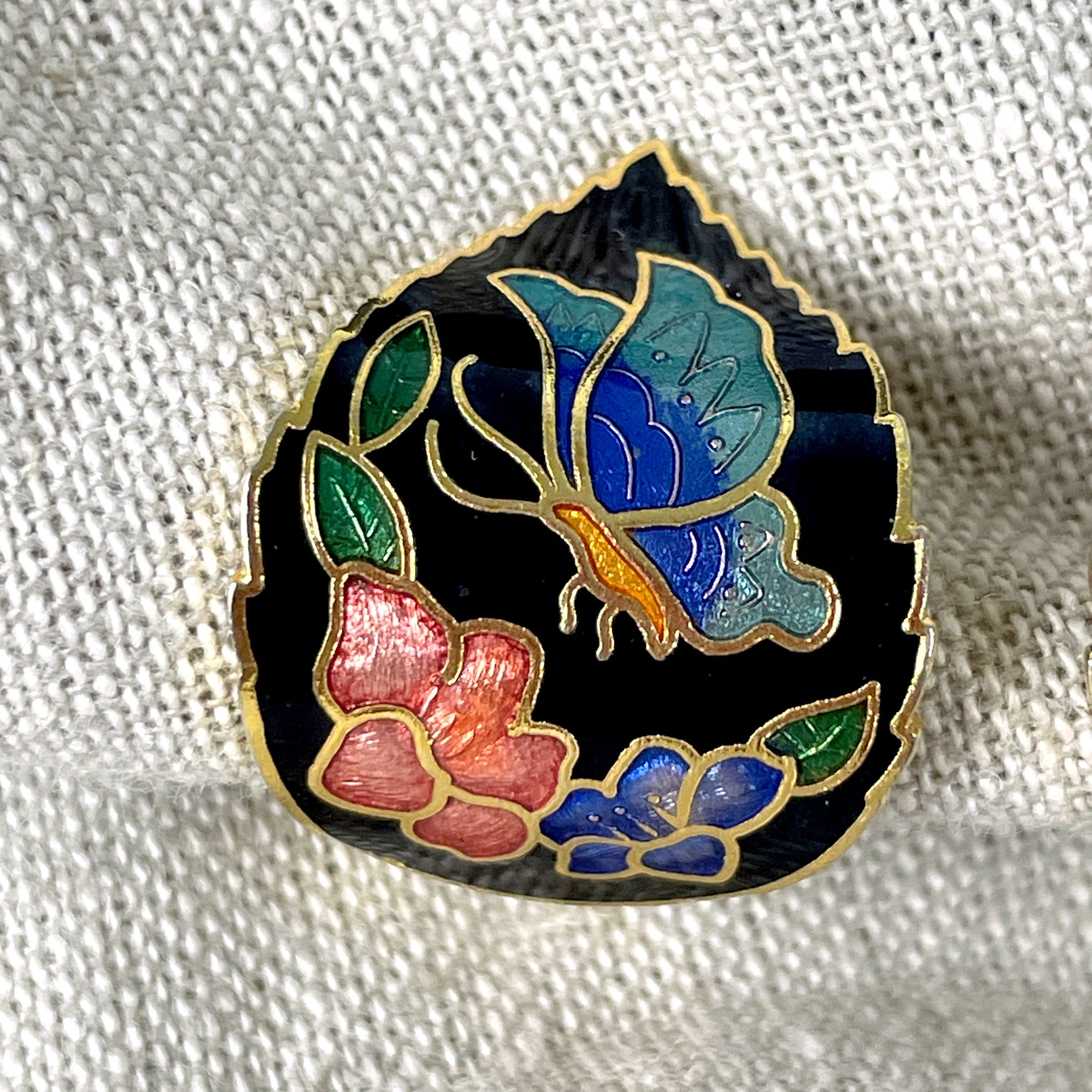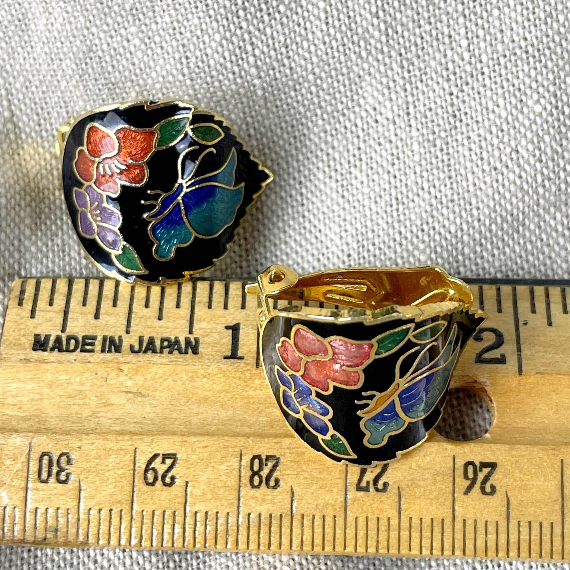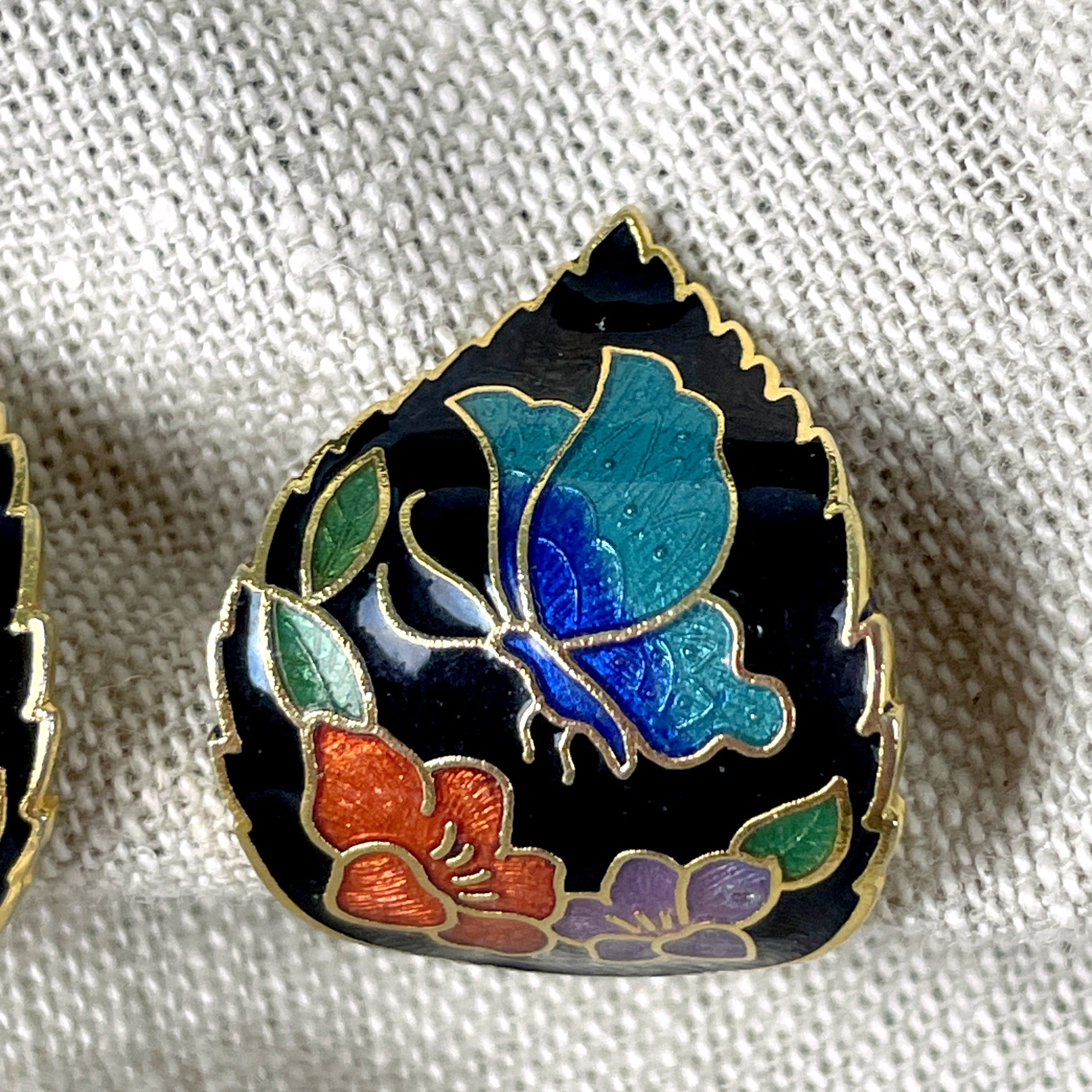 Vintage 1980s leaf-shaped closisonné clip on earrings Gold metal with a black leaf with a butterfly hovering over two flowers.