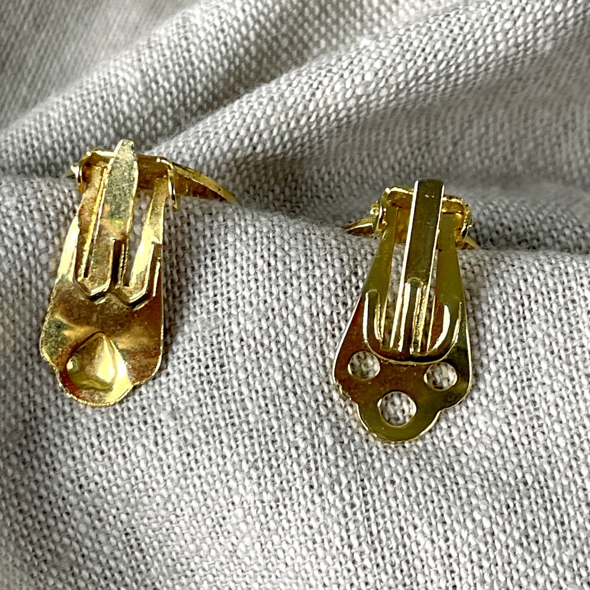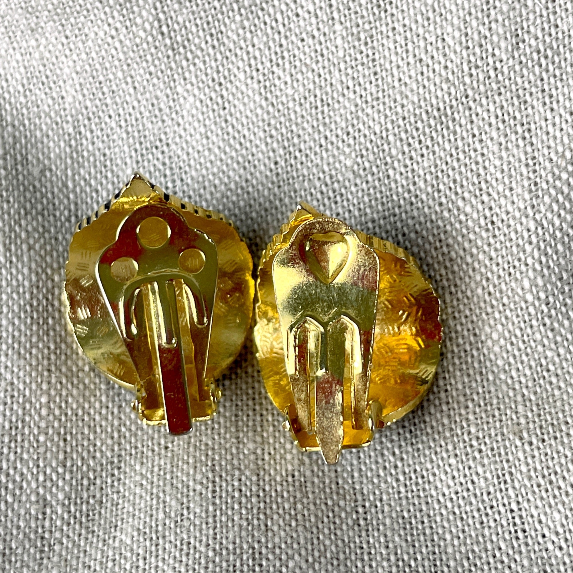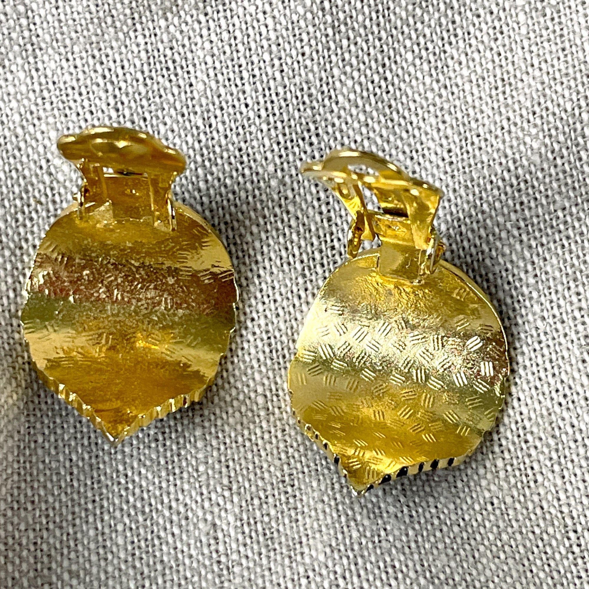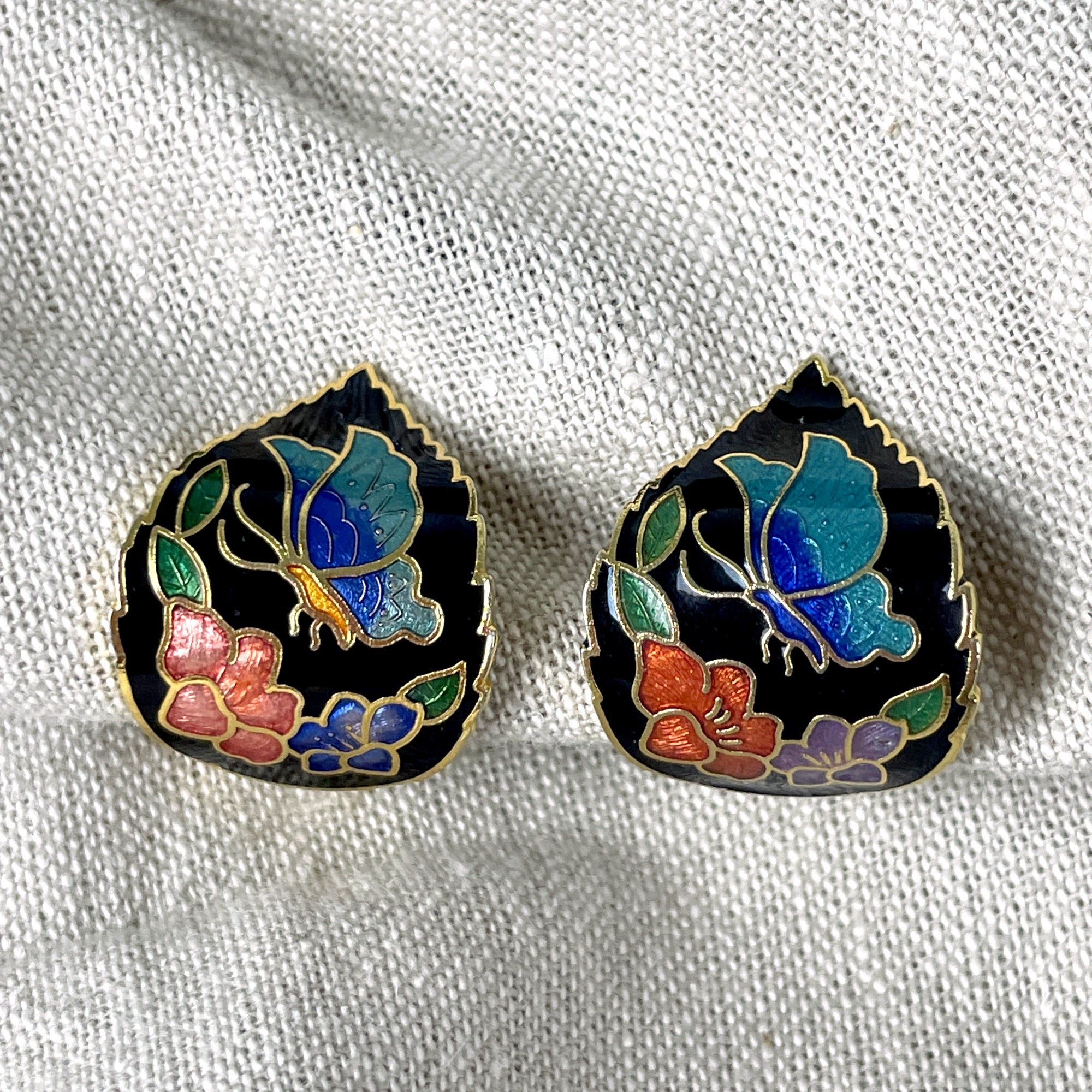 Vintage 1980s leaf-shaped closisonné clip on earrings Gold metal with a black leaf with a butterfly hovering over two flowers.