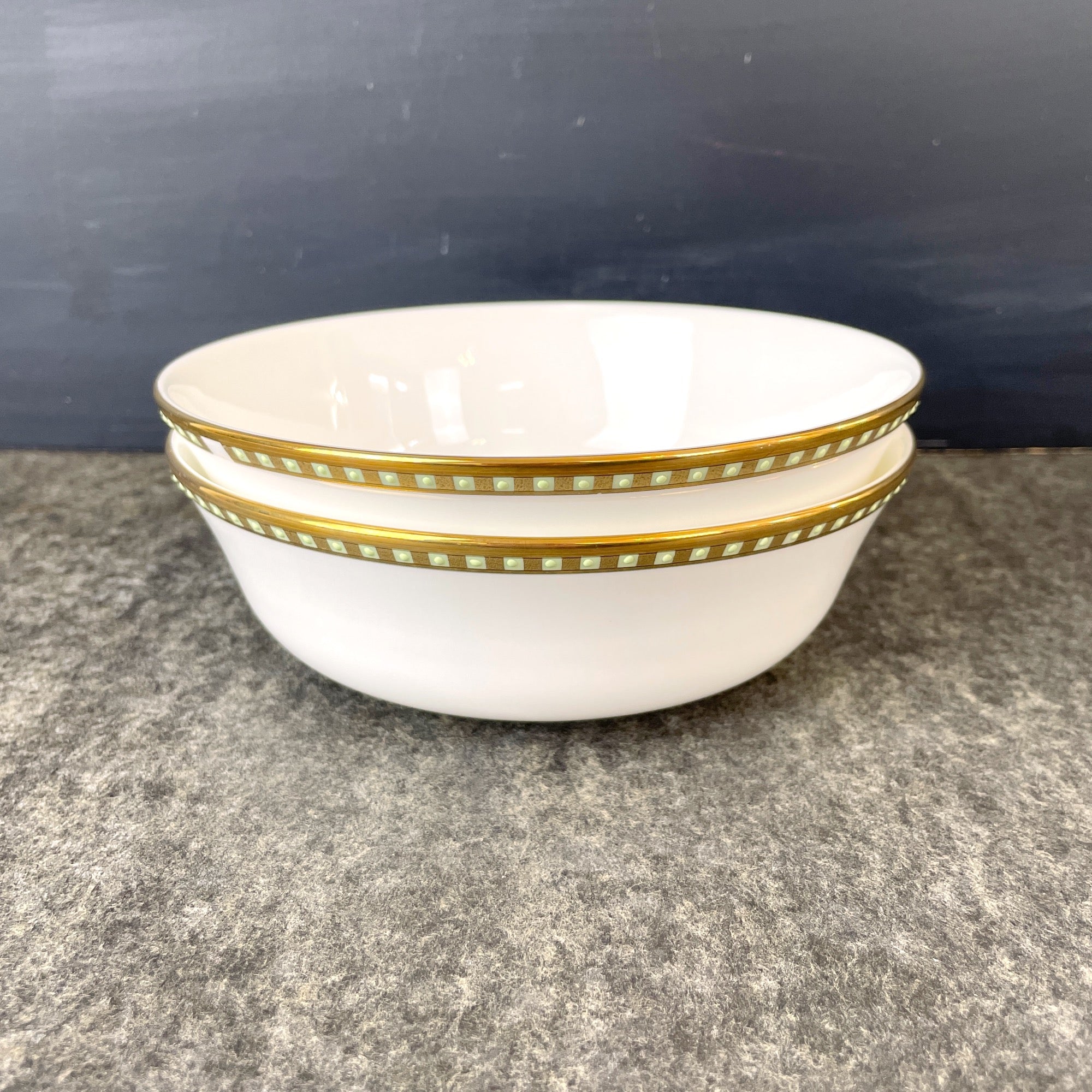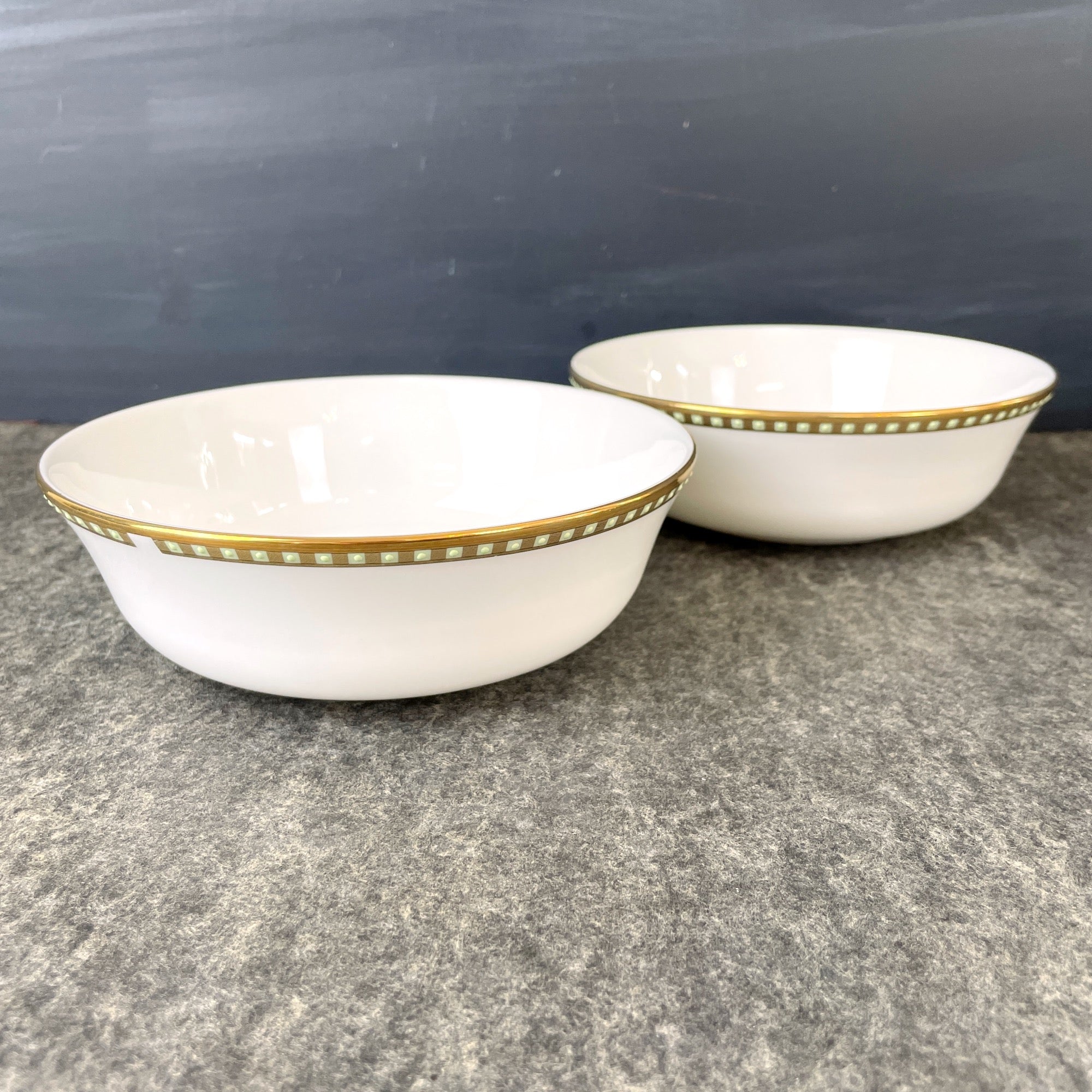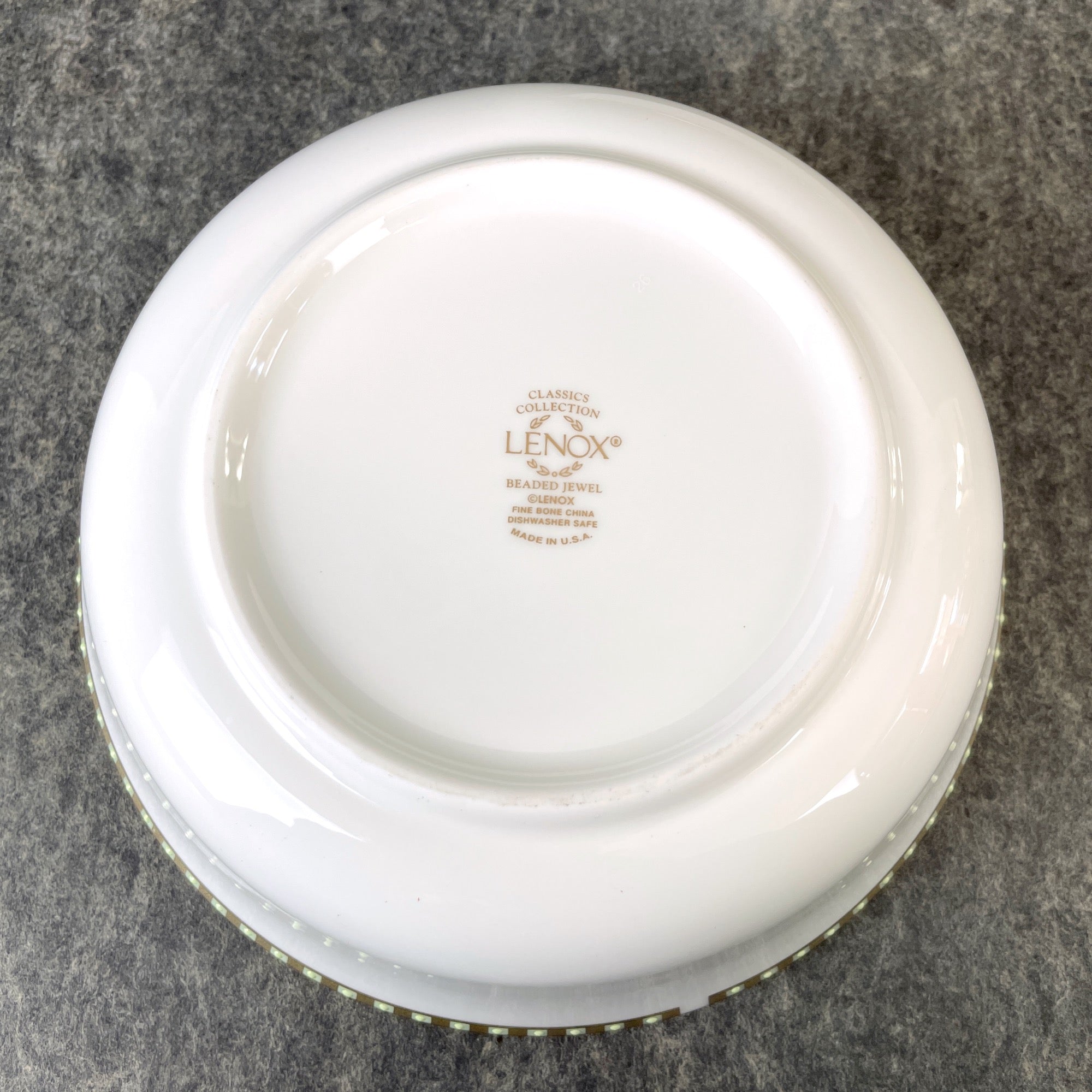 Pair of Lenox Beaded Jewel all purpose bowls, perfect for salad or cereal. White china with raised green dots on gold trim. From the Lenox Classics Collection. Made in USA.