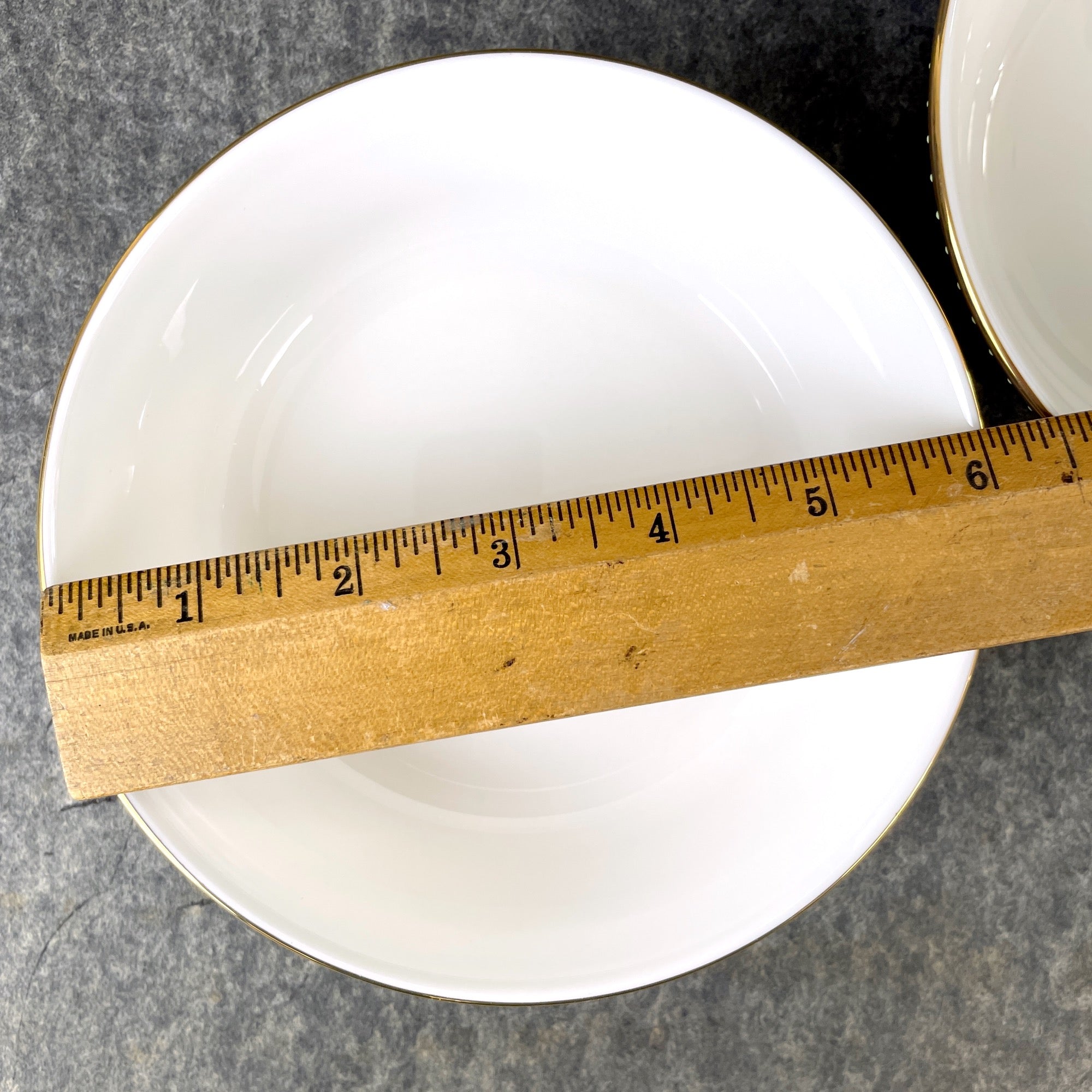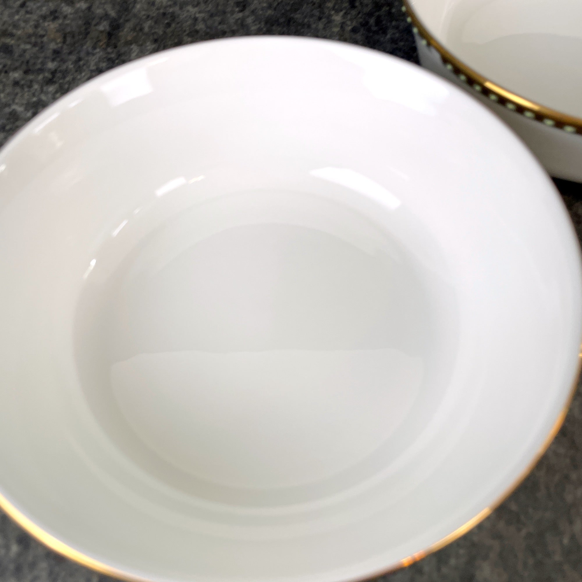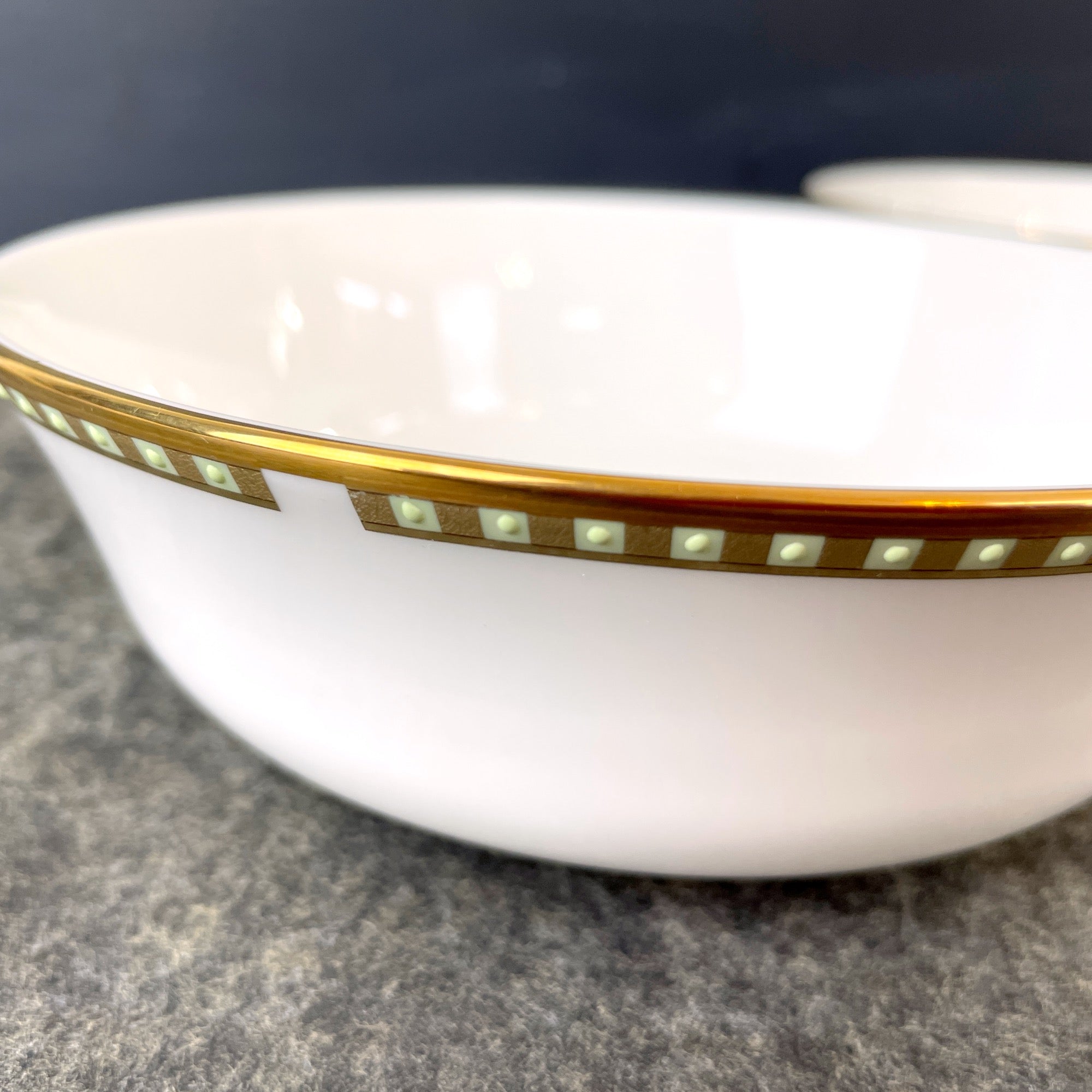 Pair of Lenox Beaded Jewel all purpose bowls, perfect for salad or cereal. White china with raised green dots on gold trim. From the Lenox Classics Collection. Made in USA.