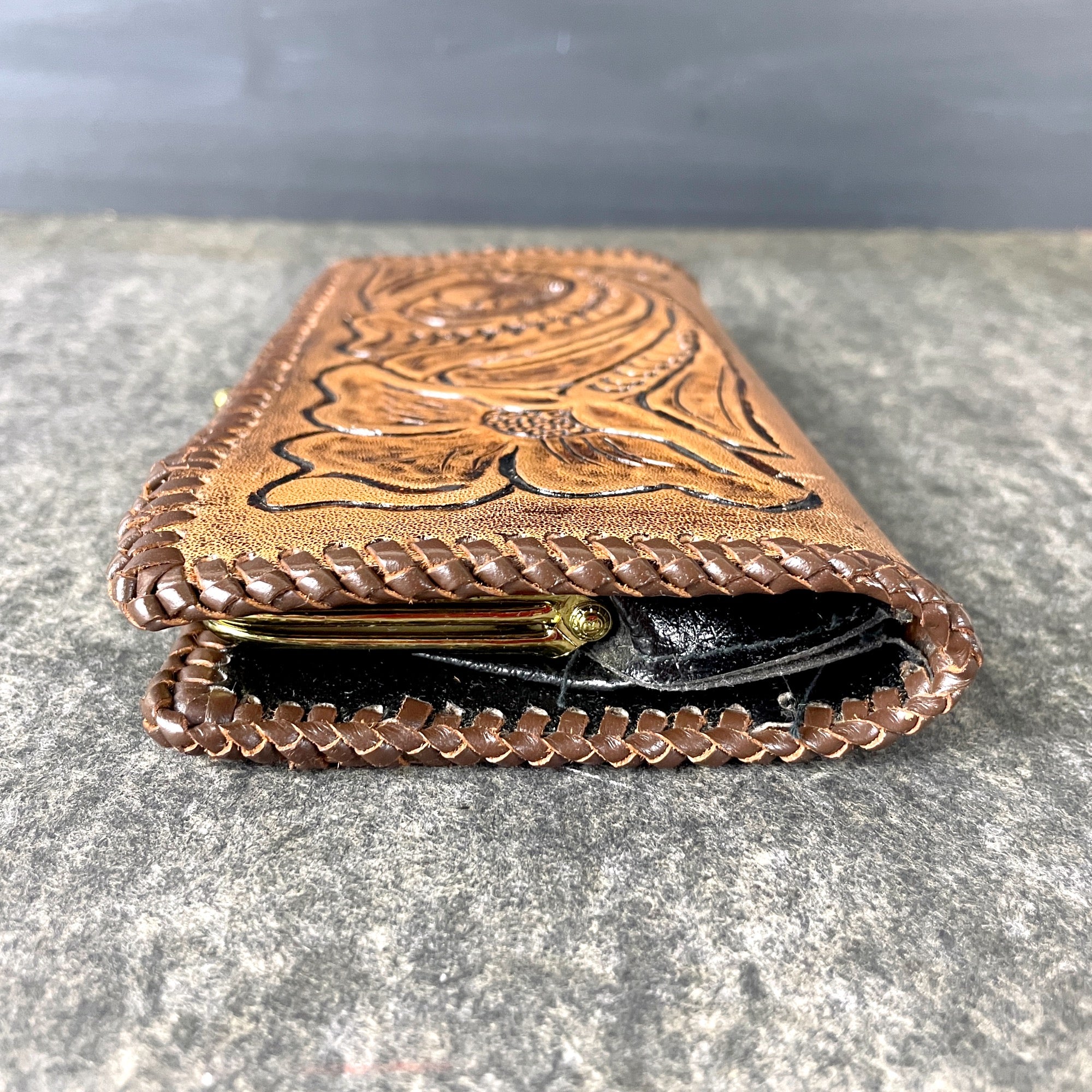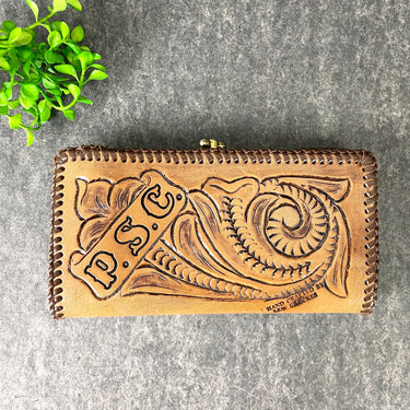 Vintage hand made brown tooled clutch/wallet. Hand tooled by Lew Crocker. Floral design, monogrammed with P.S.C. Brown leather laced edging. 2 gold tone metal framed interior compartments separated by framed clear plastic with tight kiss clasp. Snap closure sides, one with 2 bill pockets, the other with one bill pocket, a credit card pocket and a license pocket. Interior is black leather.
