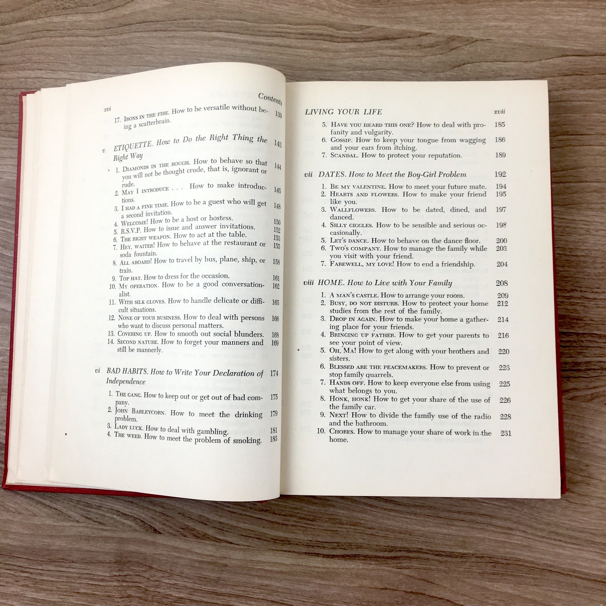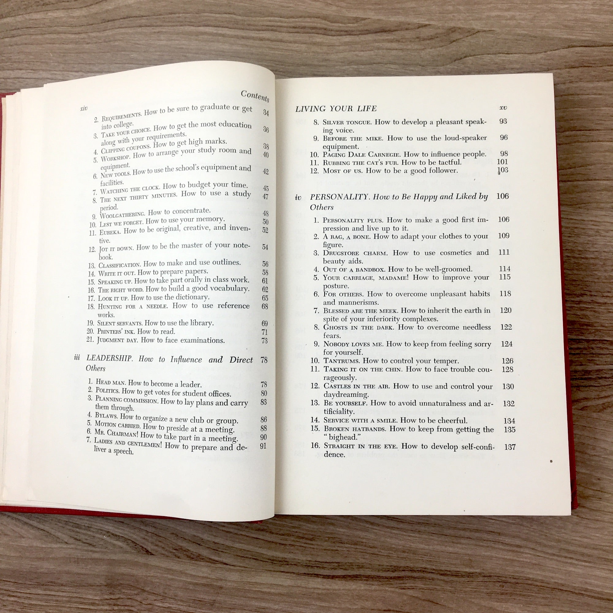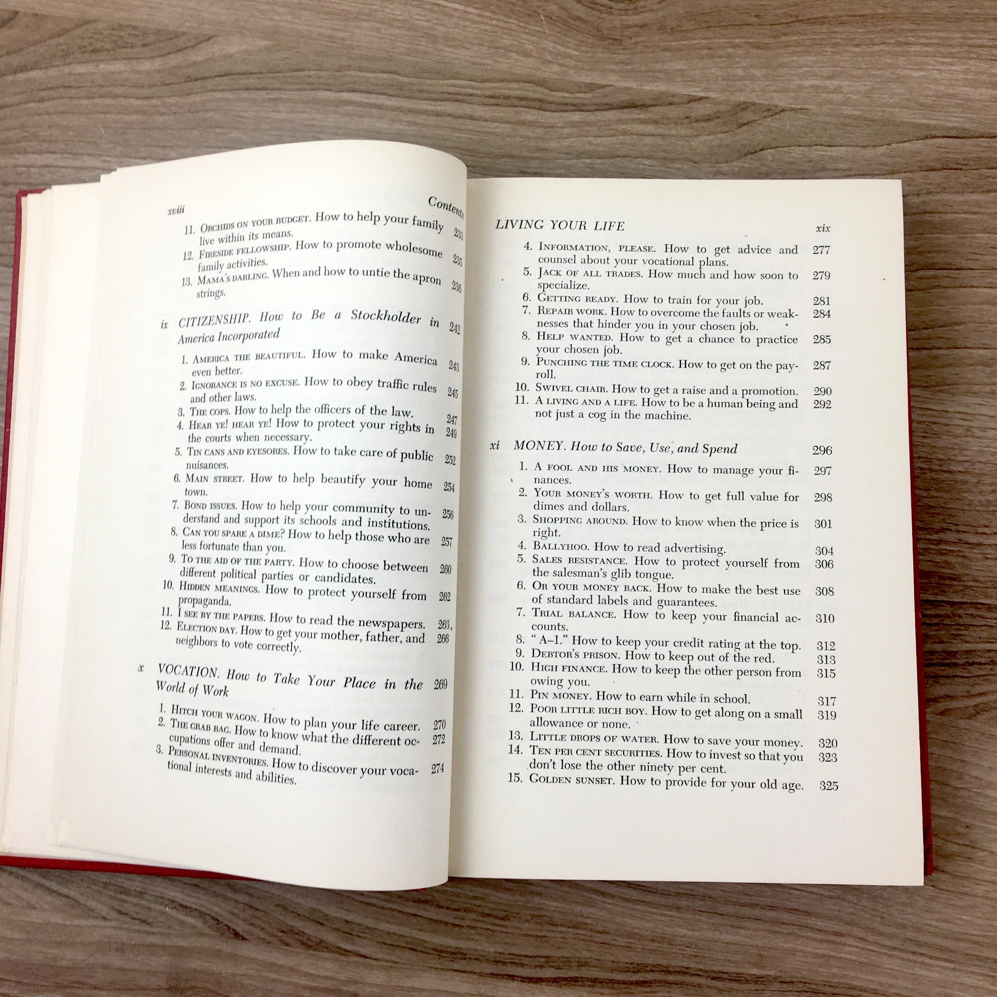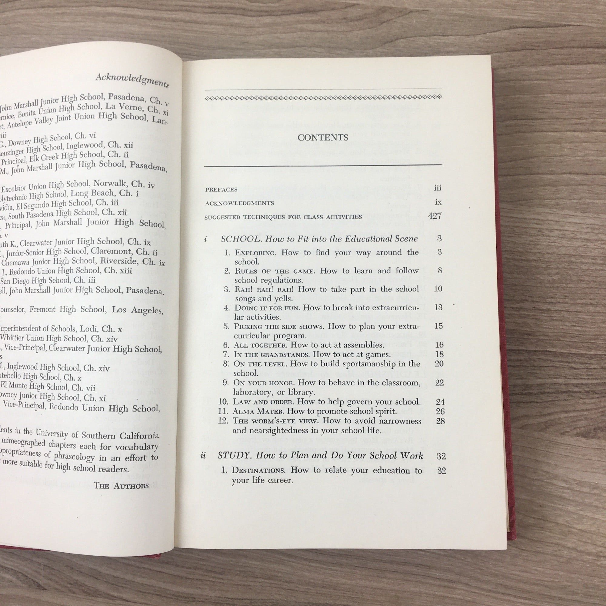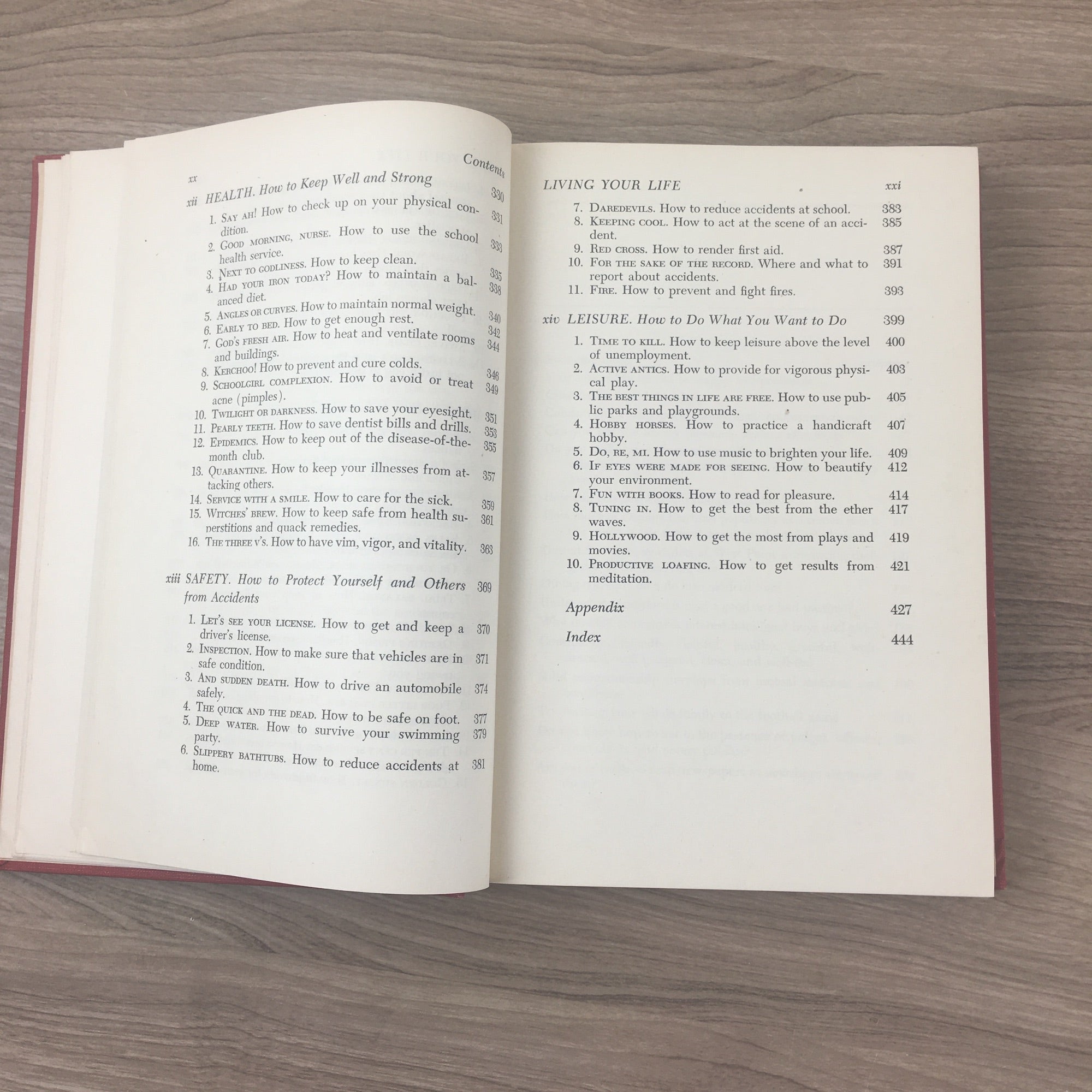High school textbook that "teaches you how to live effectively in relation to self, school, home, community and nation." Sections include: School, Study, Leadership, Personality, Etiquette, Bad Habits, Dates, Home, Citizenship, Vocation, Money, Health, Safety and Leisure.