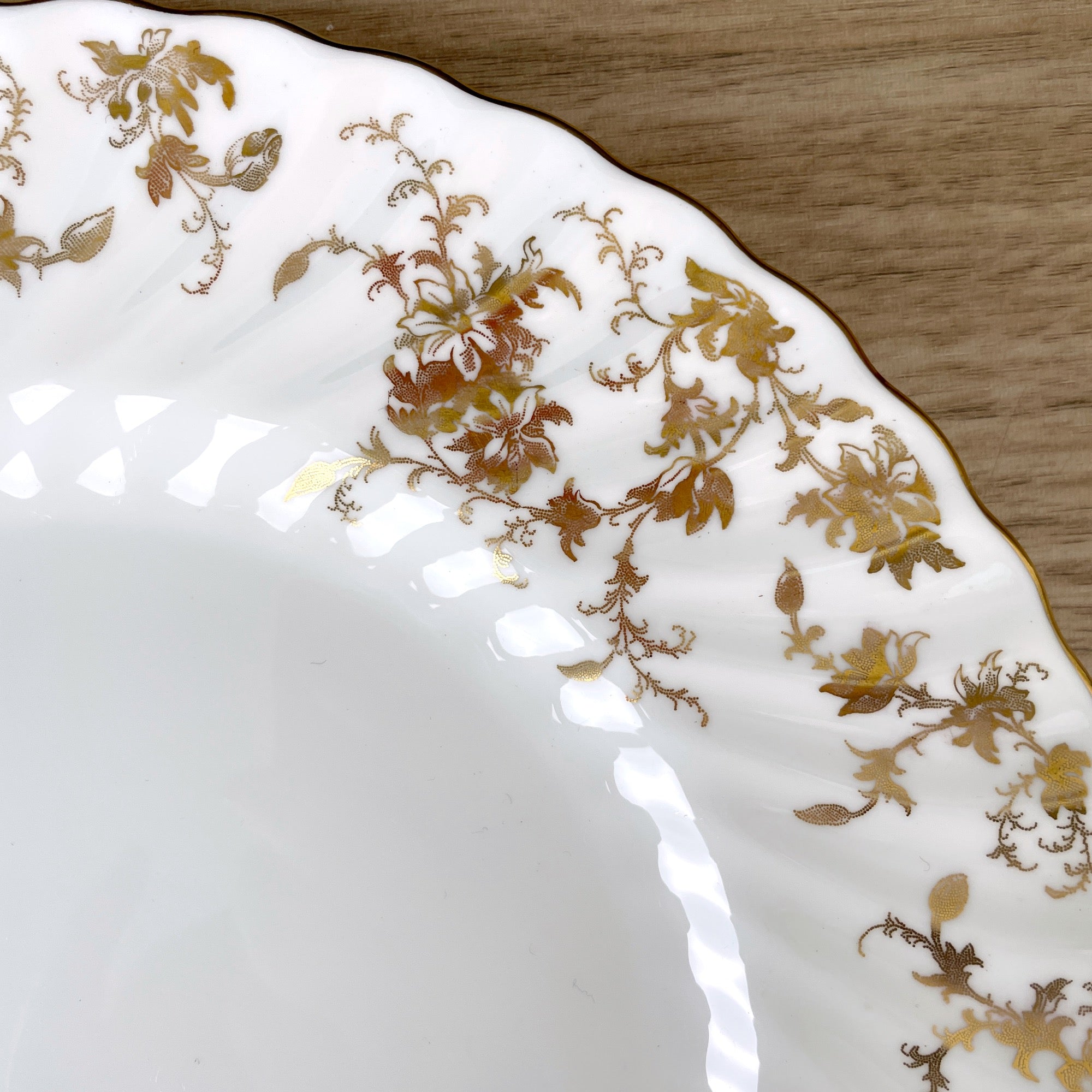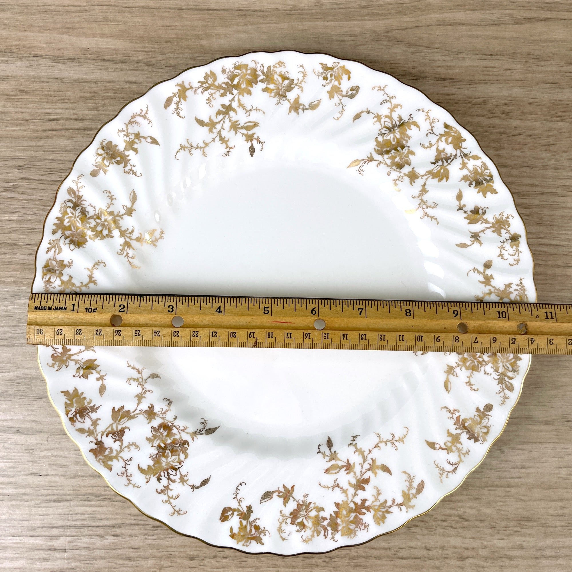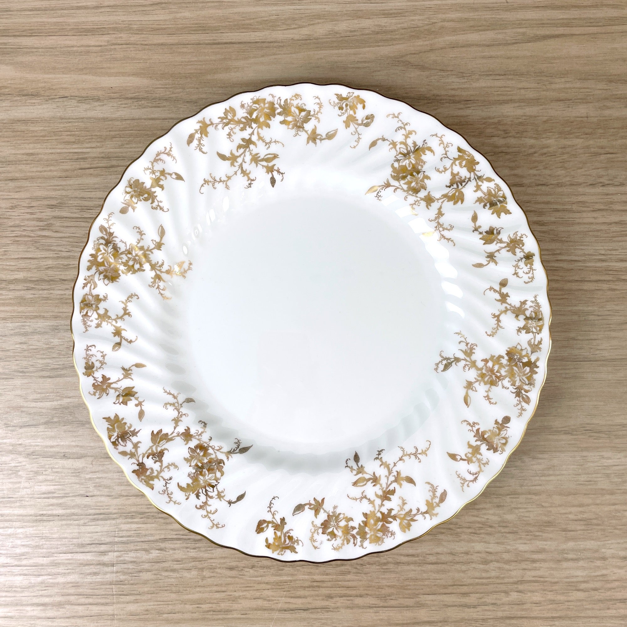 Minton Ancestral Gold dinner plate. White plate with scalloped swirl rim and gold flowers. Gold band on the outside. #S-595. Made in England.