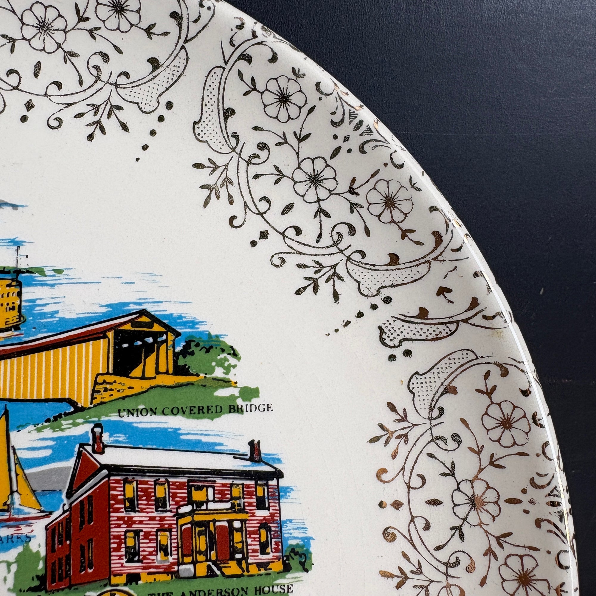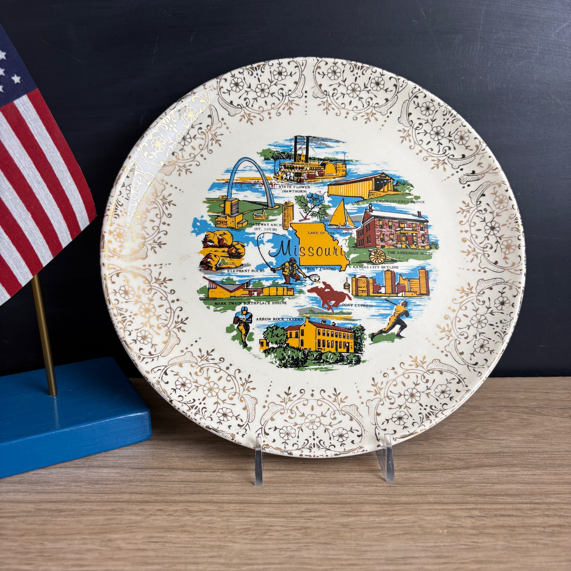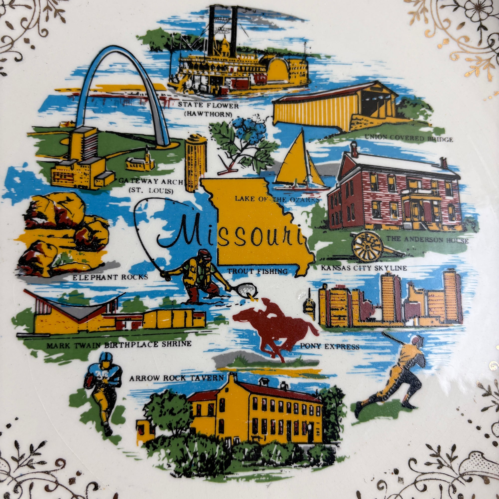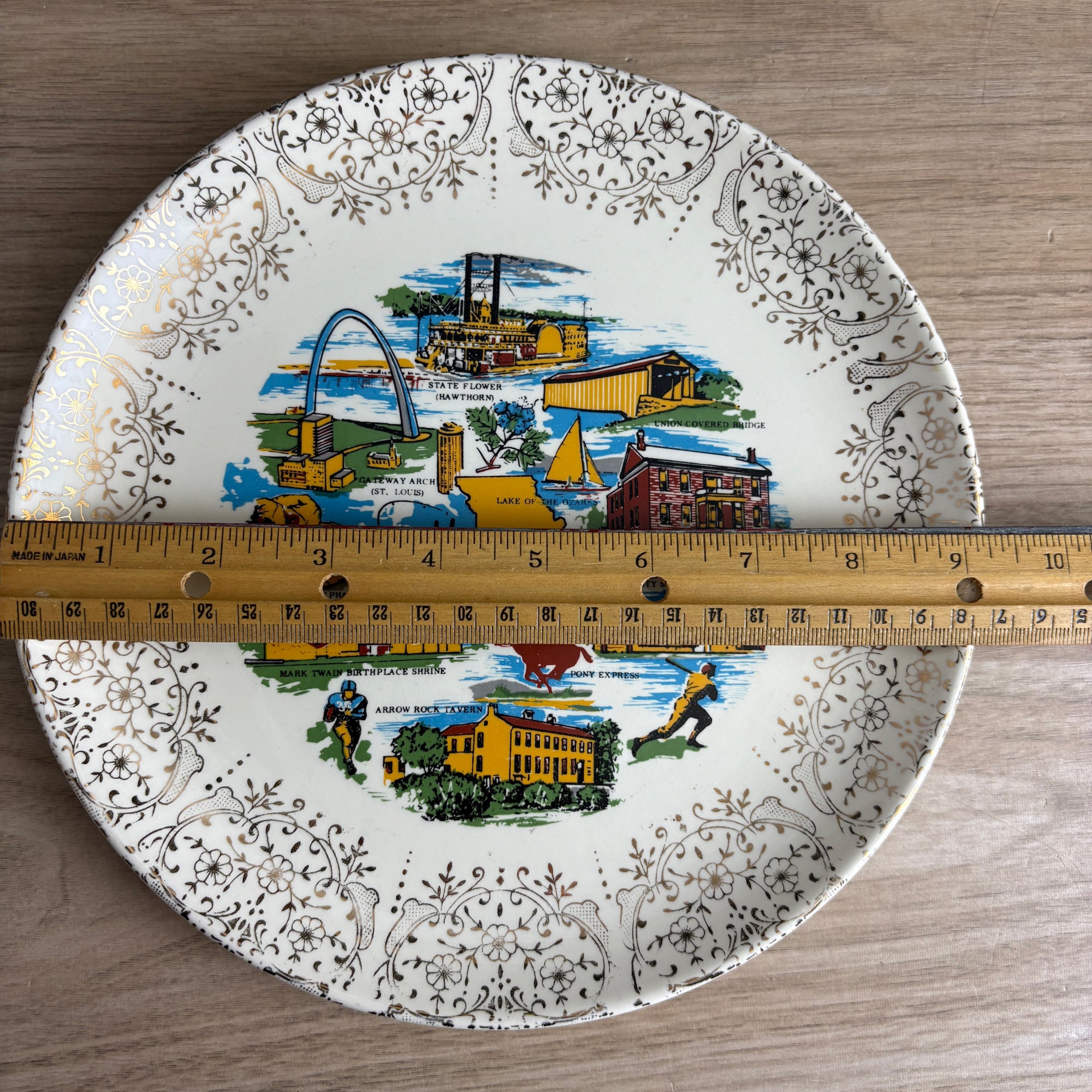Vintage Missouri souvenir state plate. Creamy white plate with gold filigree border.