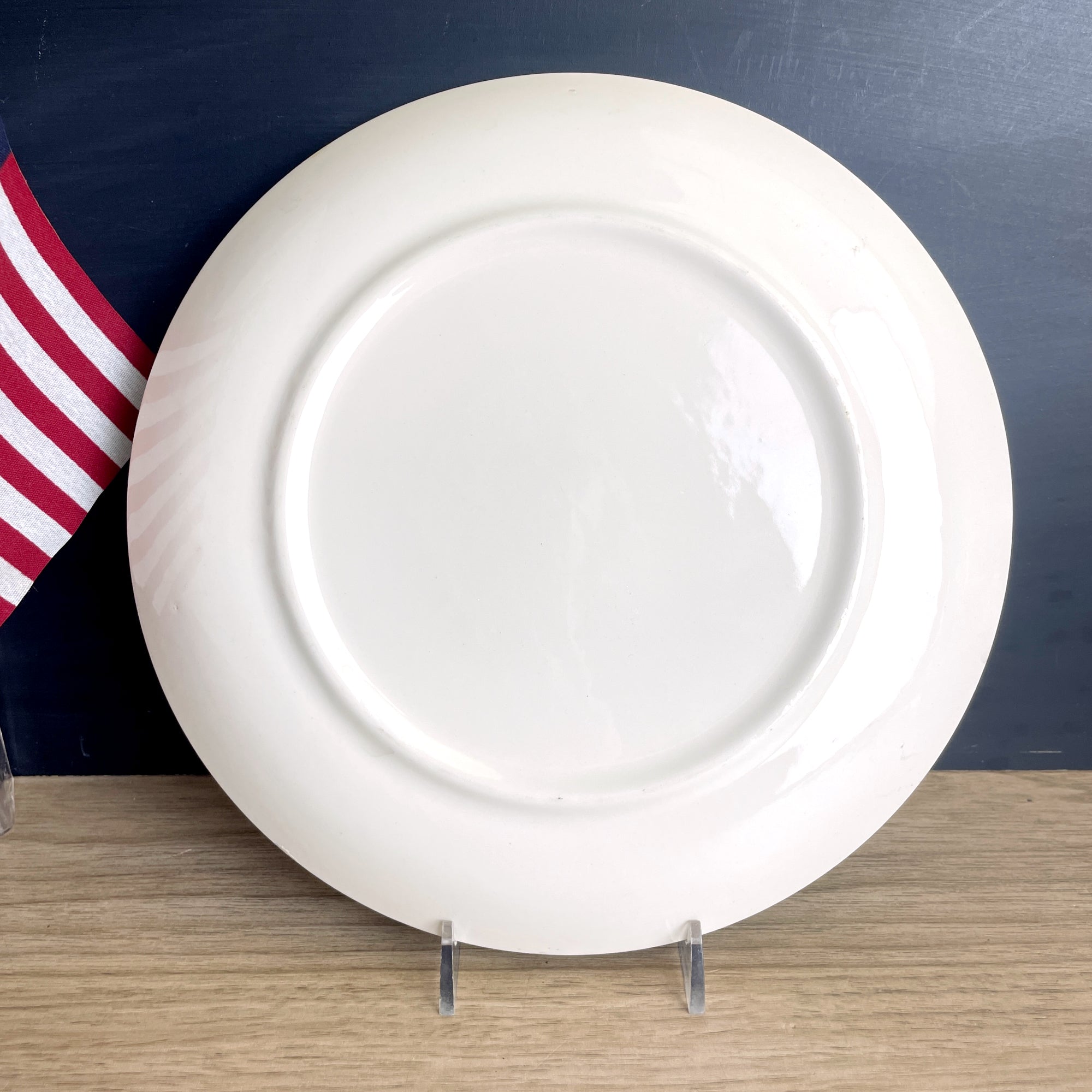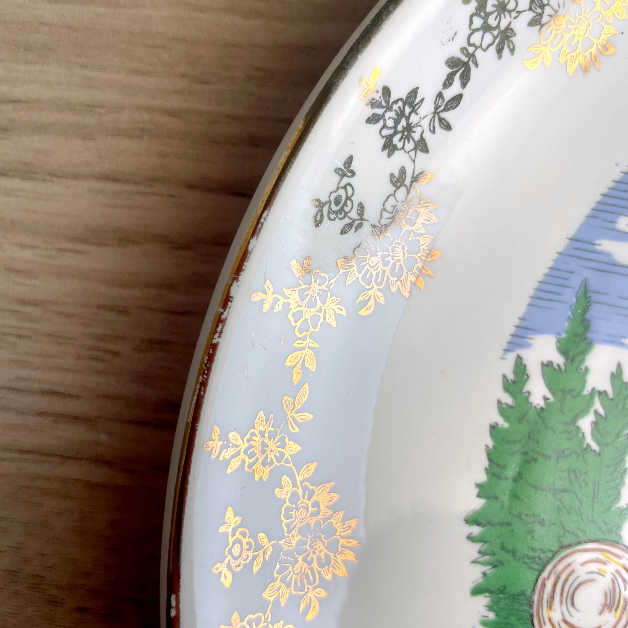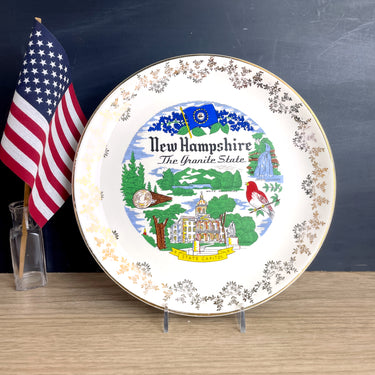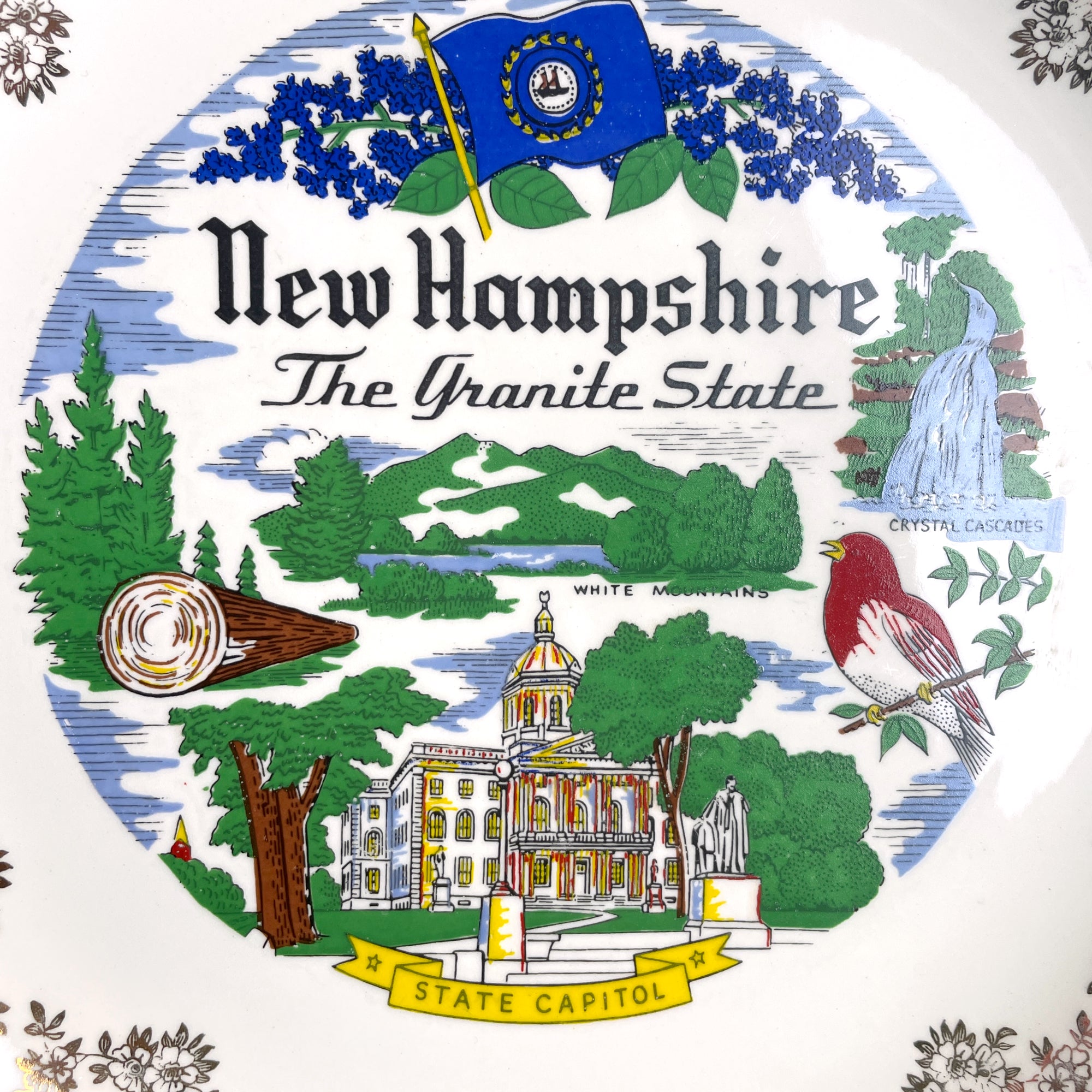 Vintage 1950s or 1960s souvenir plate from New Hampshire, The Granite State. Cream plate with gold floral border. Center printed images of New Hampshire landmarks including State Capitol, White Mountains, and Crystal Cascades, as well as the state bird and forests.