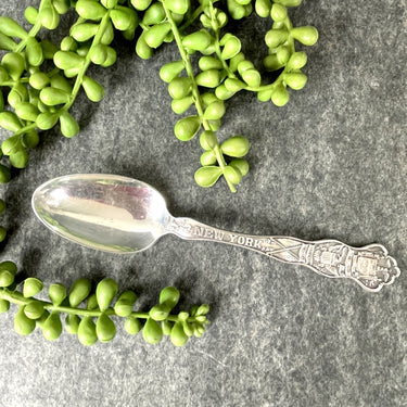 New York state seal spoon by Wallace Silversmiths. Silver plated spoon has the state name on the handle, an eagle with a shield and a shaped top with the state shield.