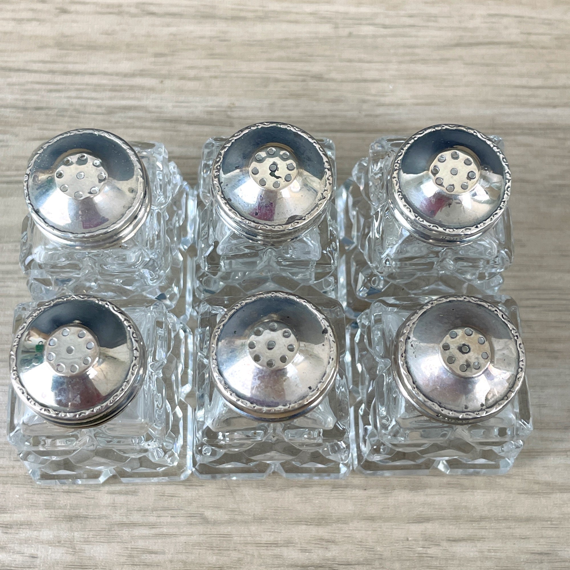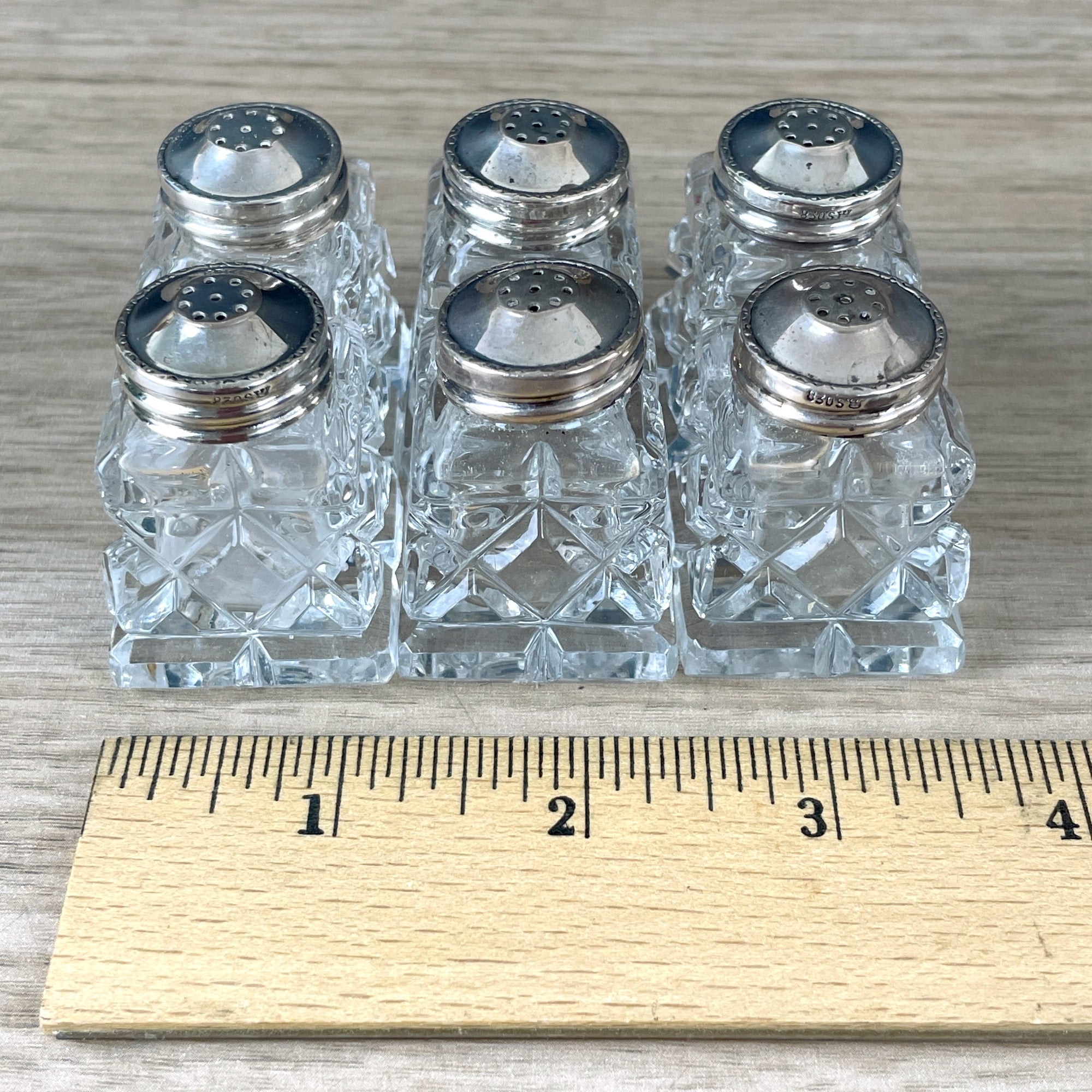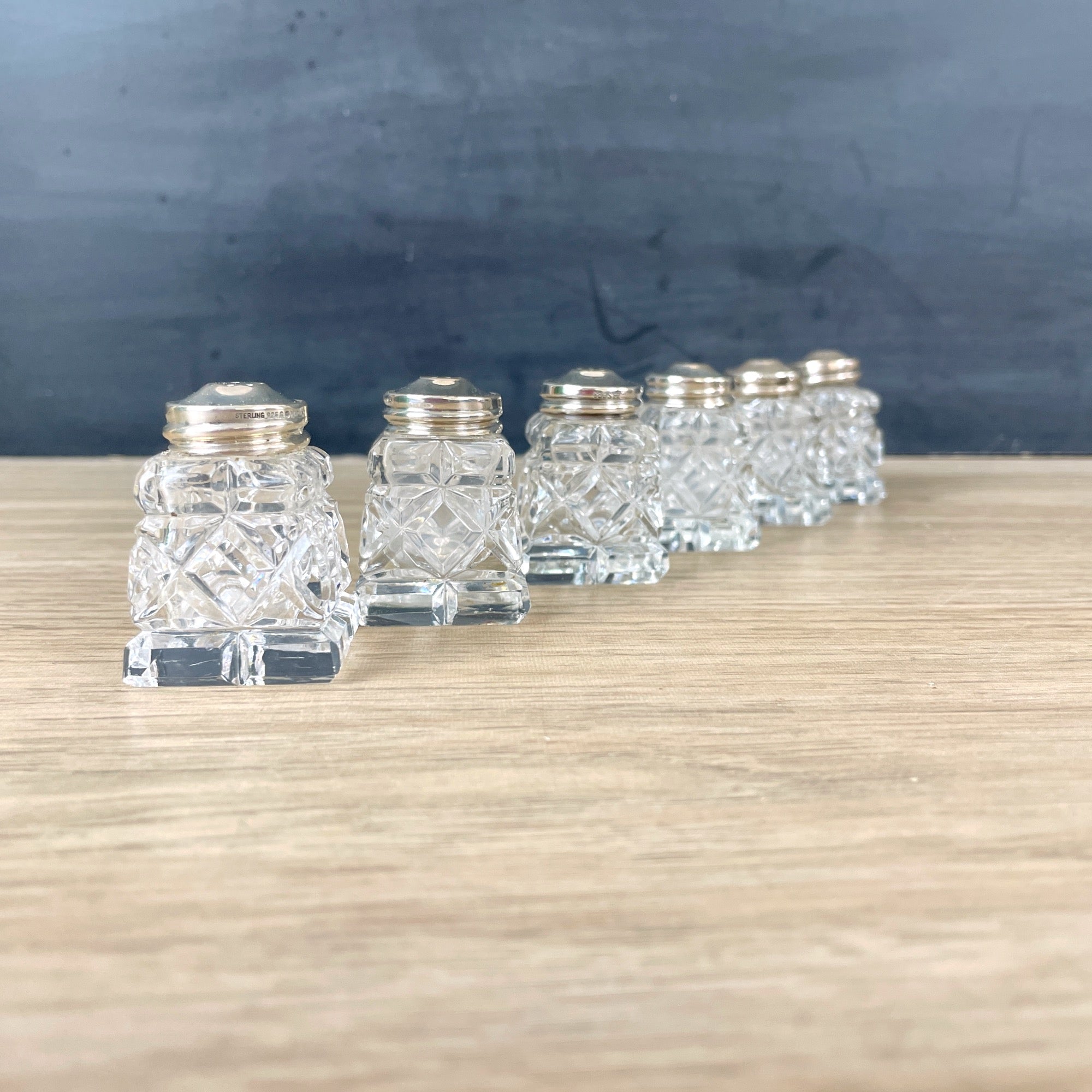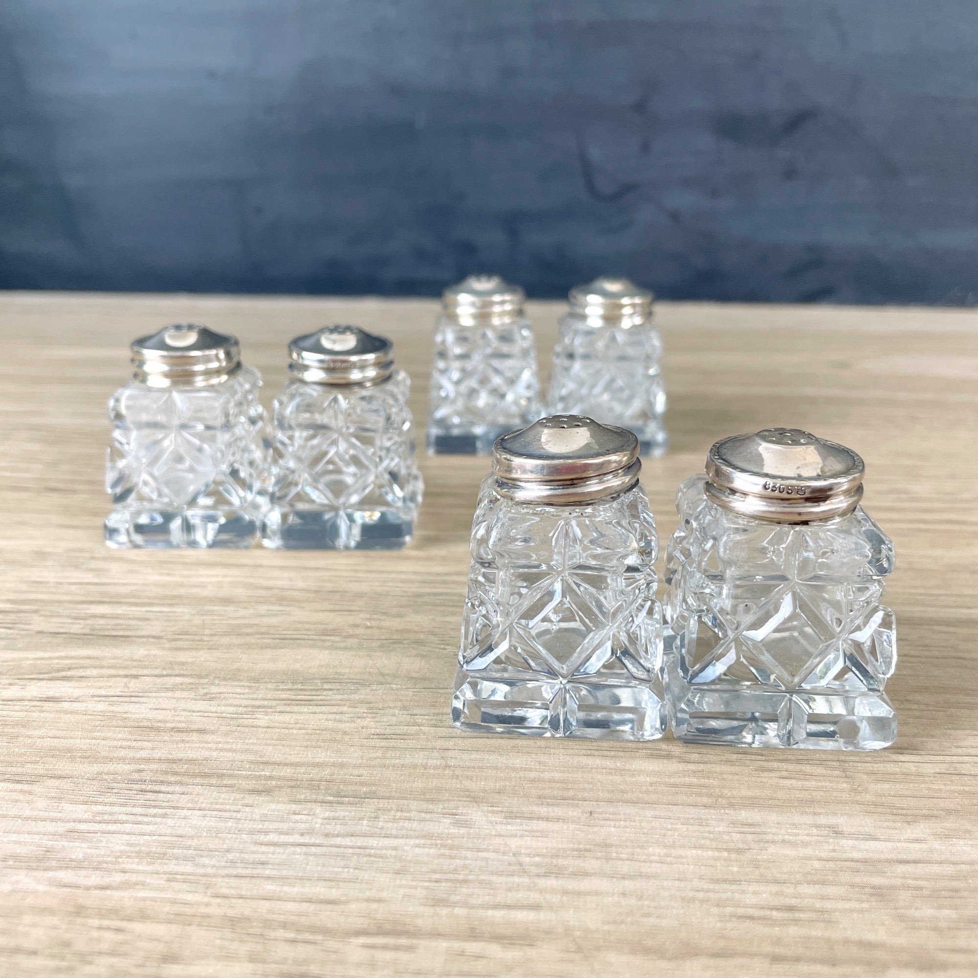 Three sets of small crystal salt and pepper shakers with sterling silver tops. From Norway, c1940. Marked 830S with single crown. Perfect for individual sets on the table.