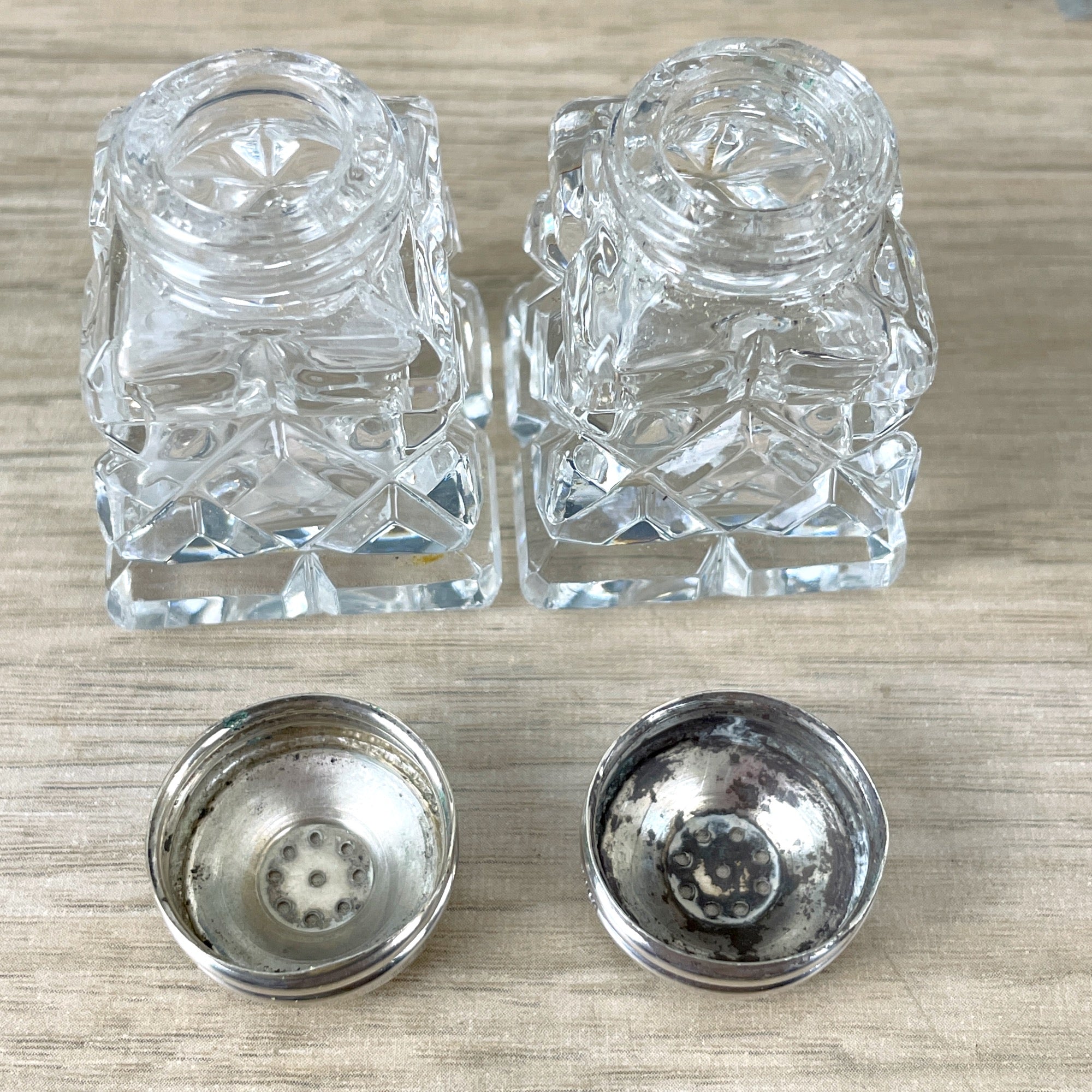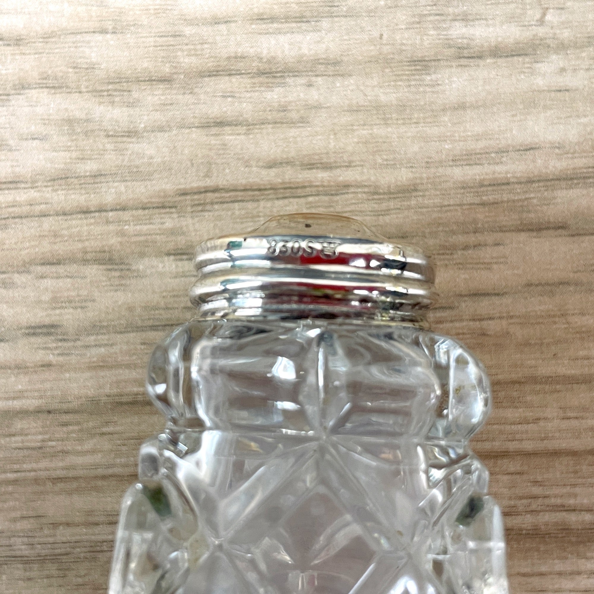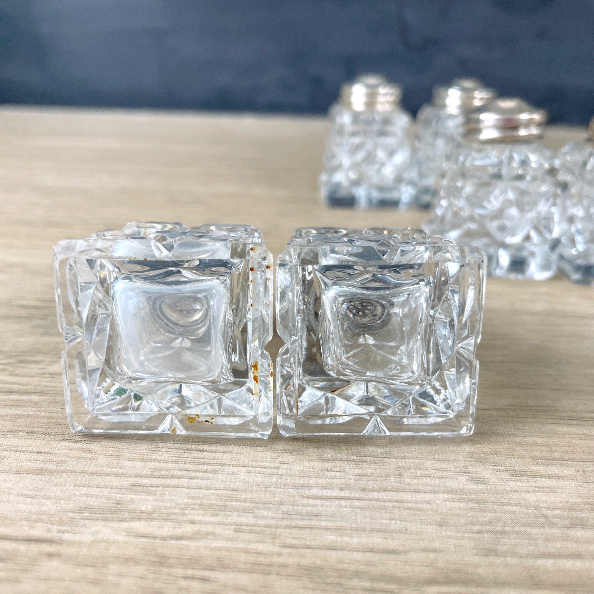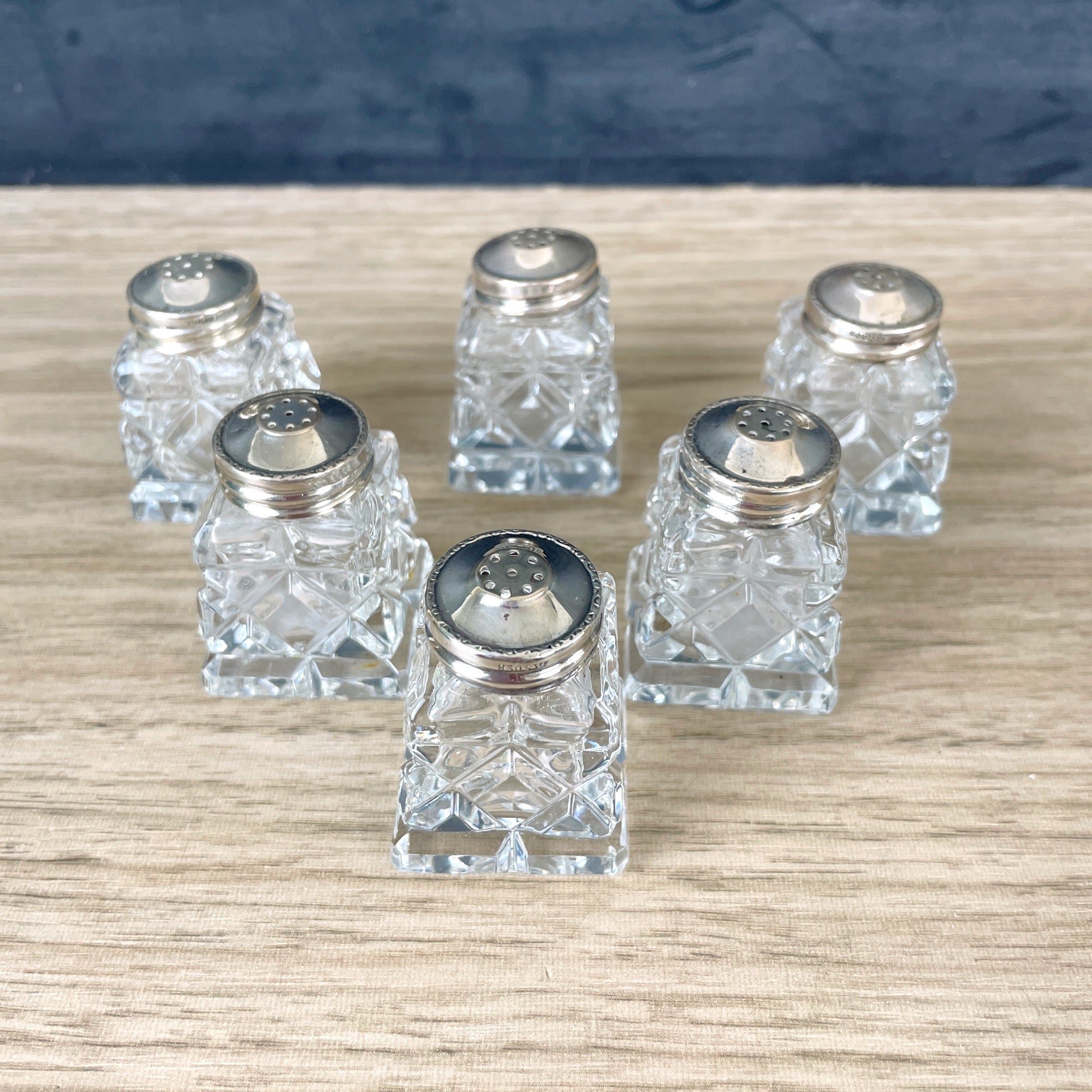 Three sets of small crystal salt and pepper shakers with sterling silver tops. From Norway, c1940. Marked 830S with single crown. Perfect for individual sets on the table.