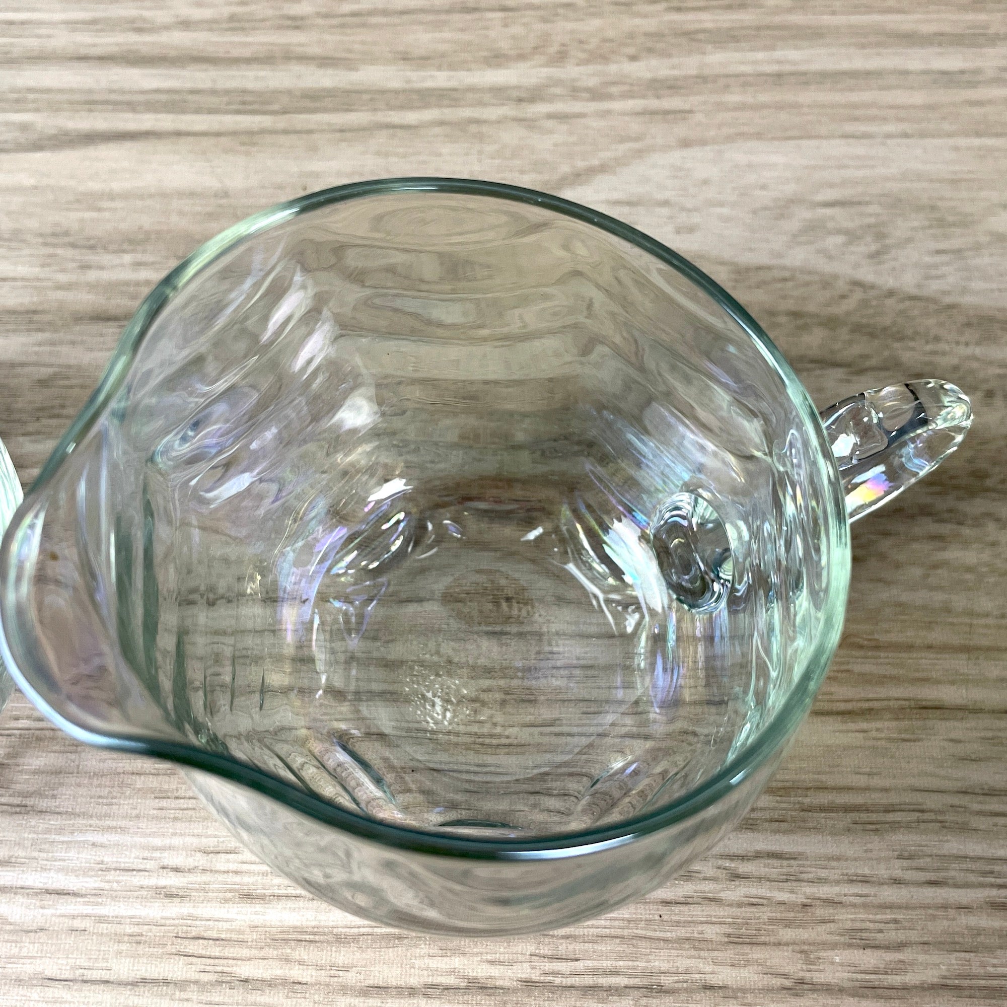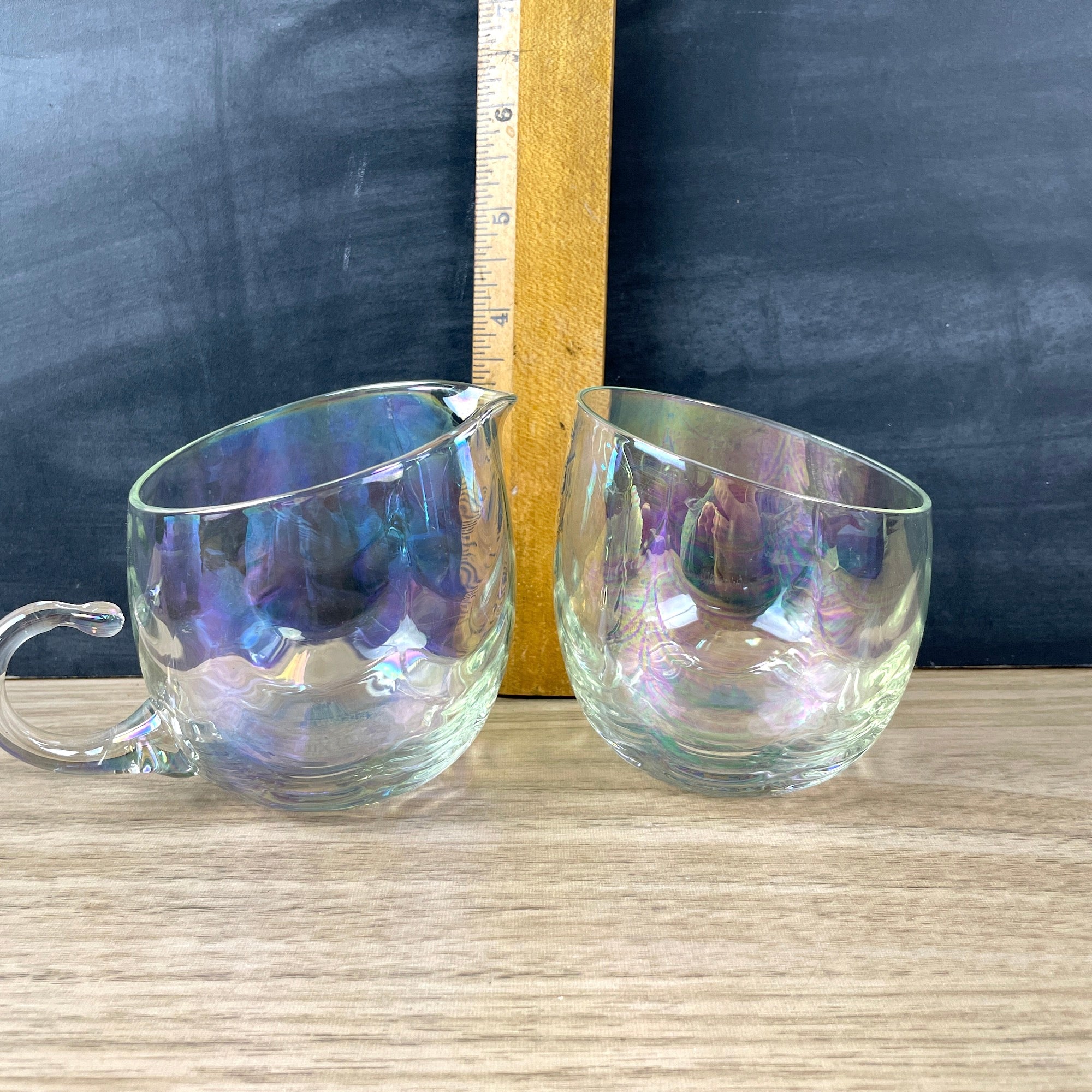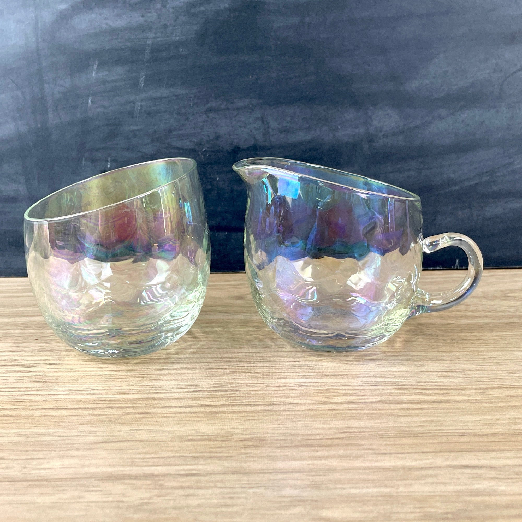 Vintage 1960s or earlier cream and sugar set of opalescent drapery glass. Angled tops. No maker's marks.