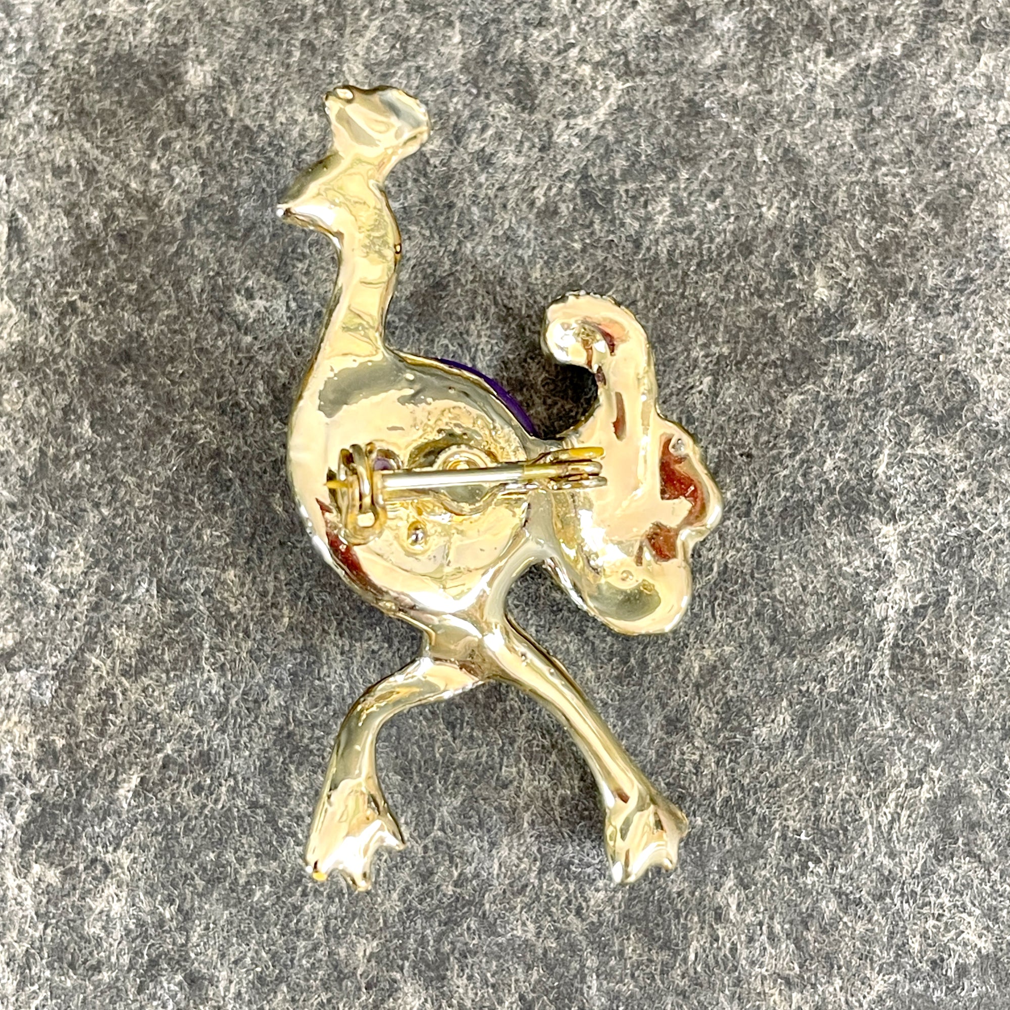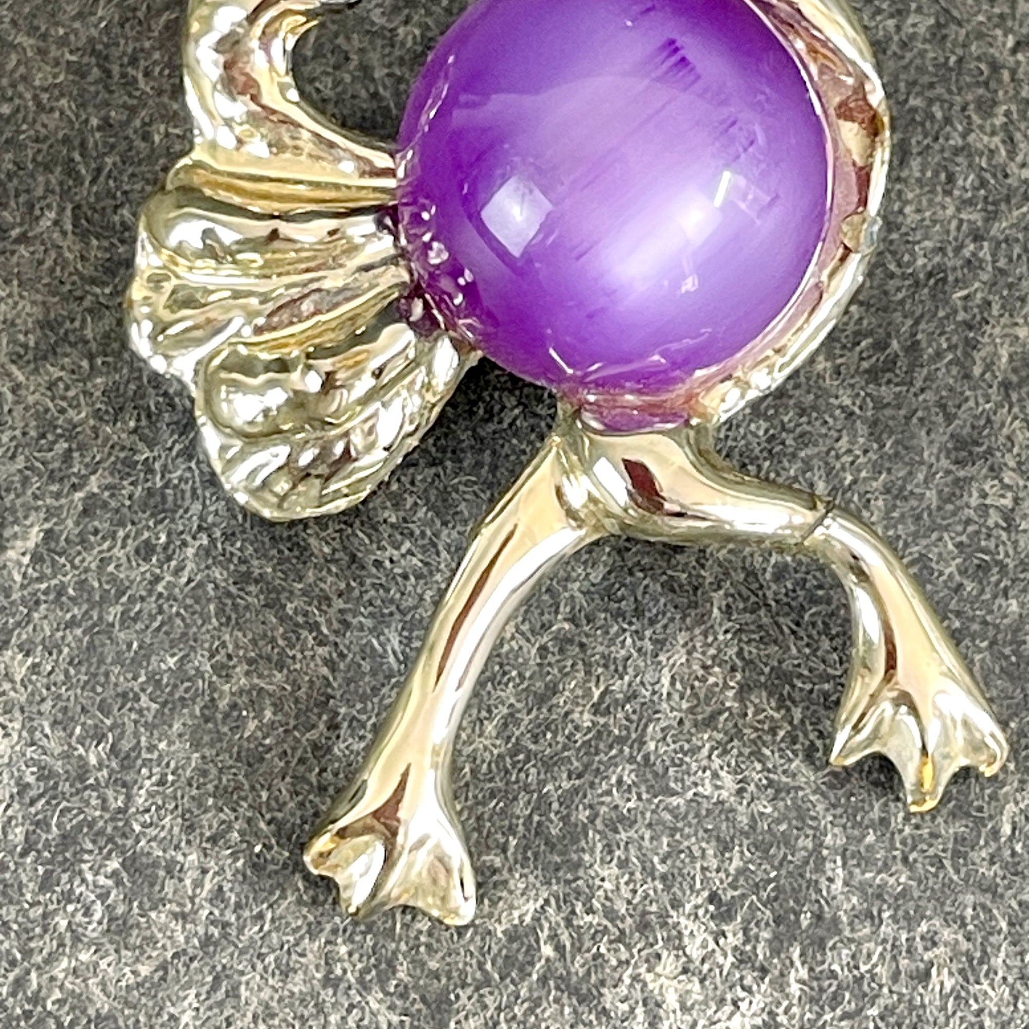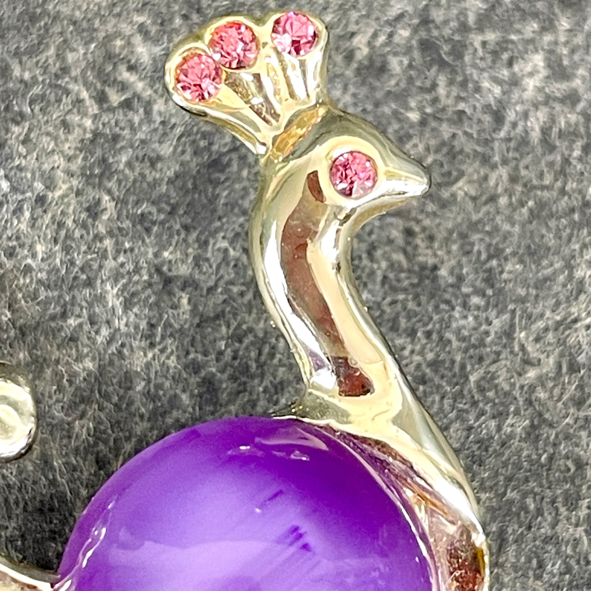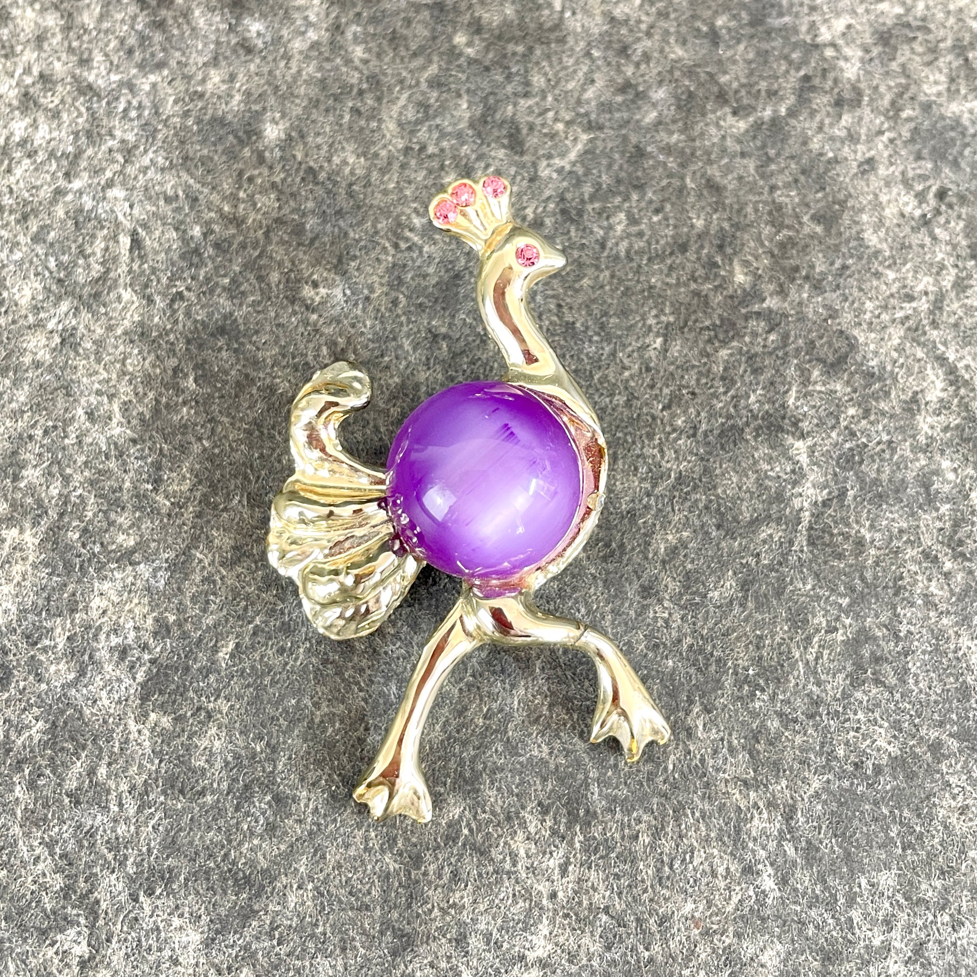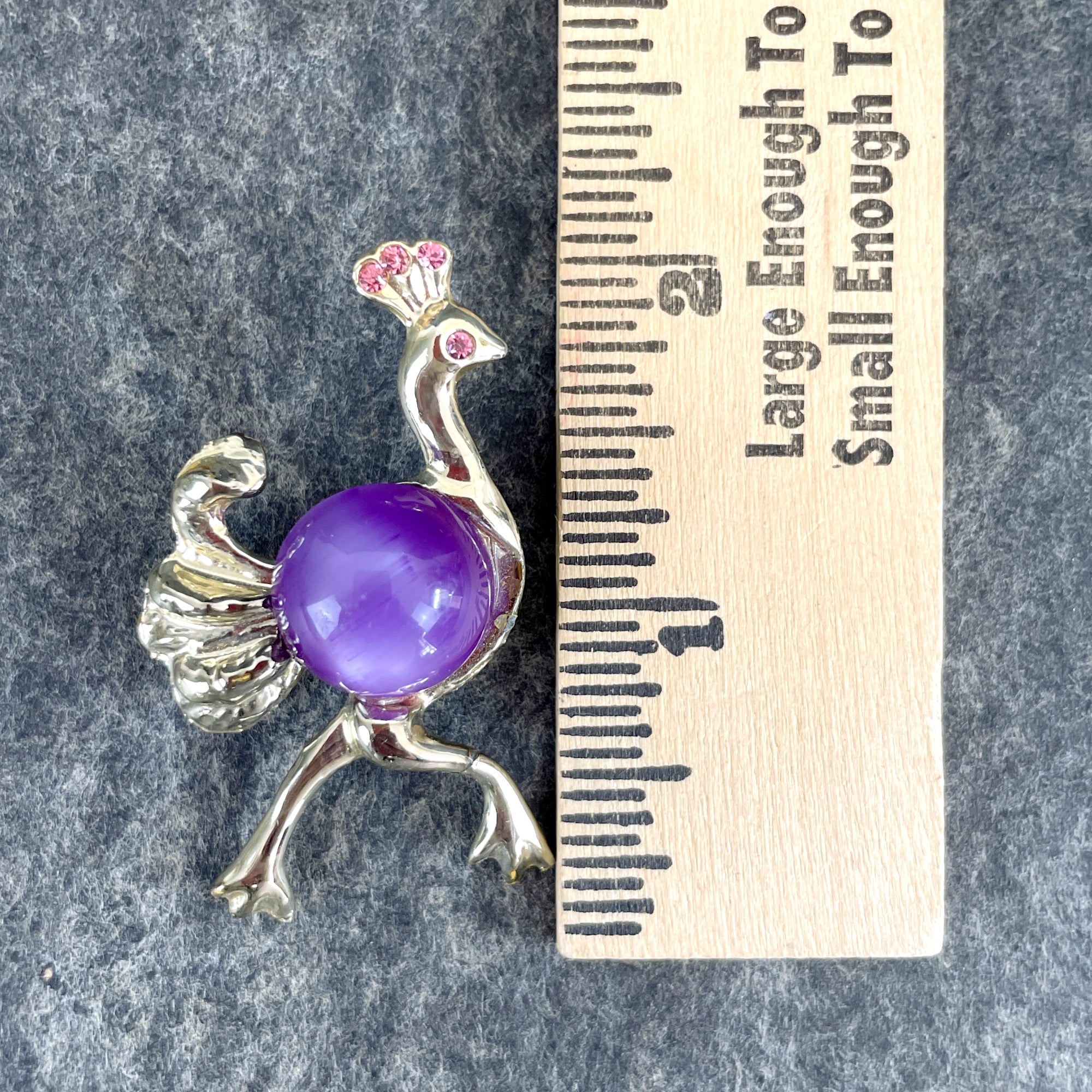 Vintage 1950s peacock brooch. Goldtone metal with purple acrylic cat's eye belly and tiny pink rhinestones on crown and as an eye. No makers mark. Likely from the 1950s.