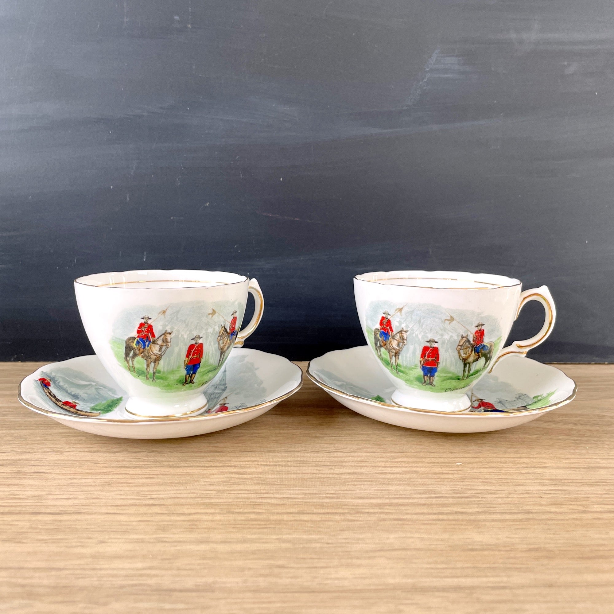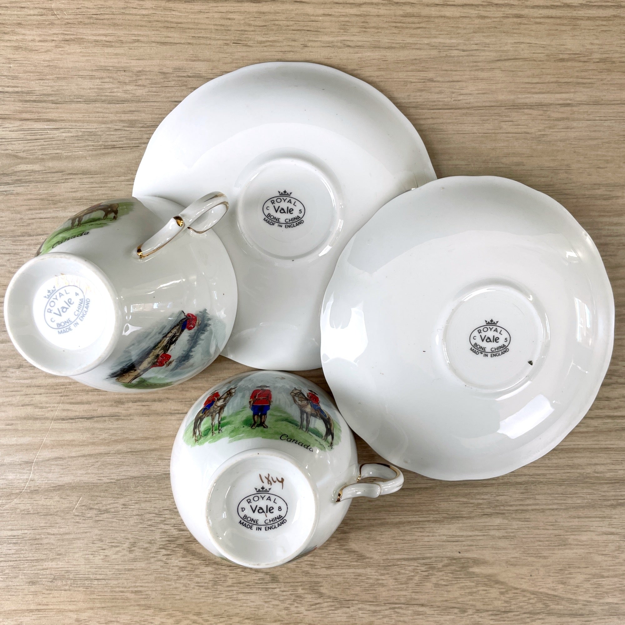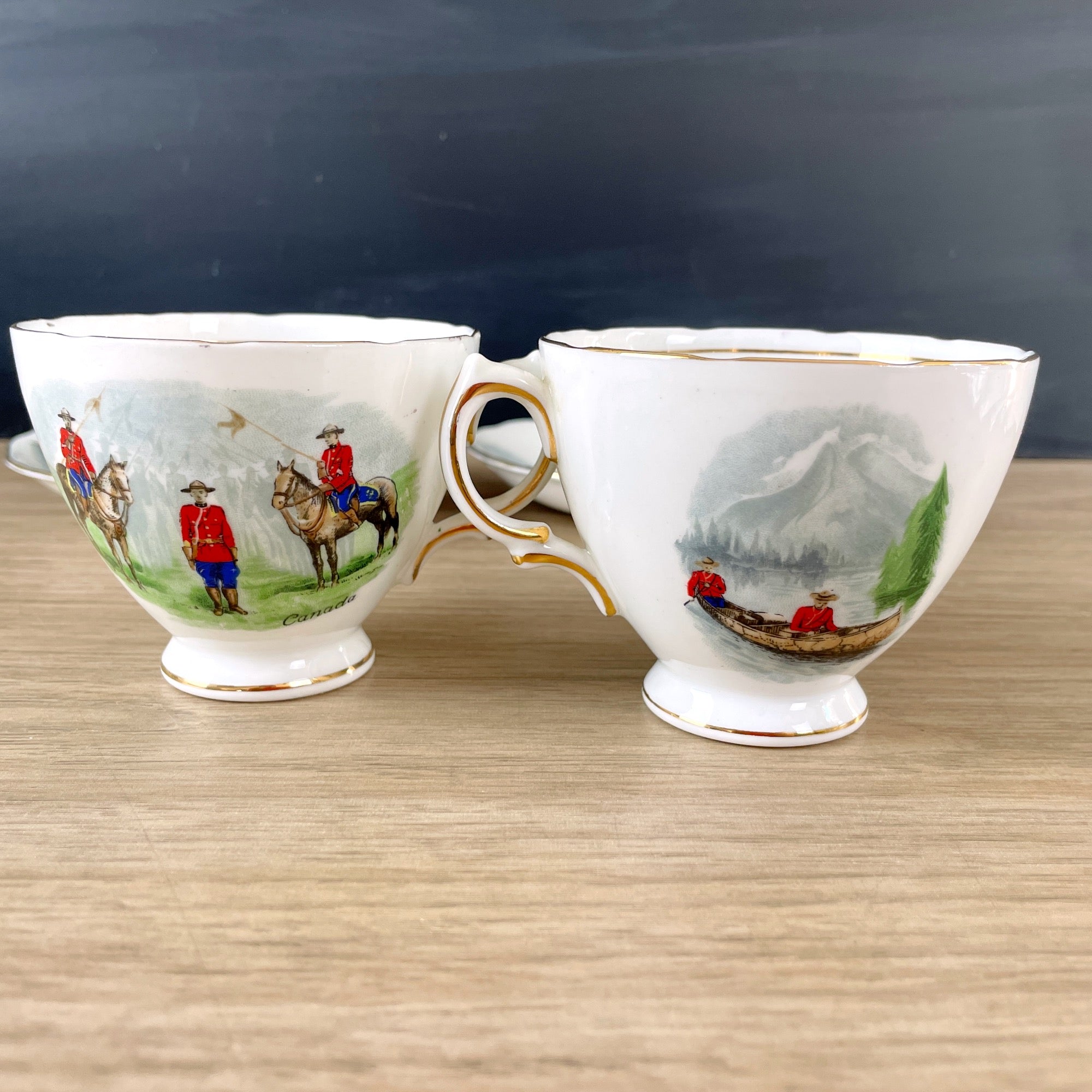 Vintage pair of matching Royal Vale footed tea cups and saucers, made in England. Three Mounties on one side, one standing in the middle of 2 on horseback with an "echo" of them fading into the background. Two in a canoe on the other side with a mountain in the background. Done in red, blue, brown, green and gray. Saucer has the same canoe picture and a single Mountie on horseback with the Canadian Parliament building in the background. Double gold banding on cup. Gold banding on saucer and cup handle.