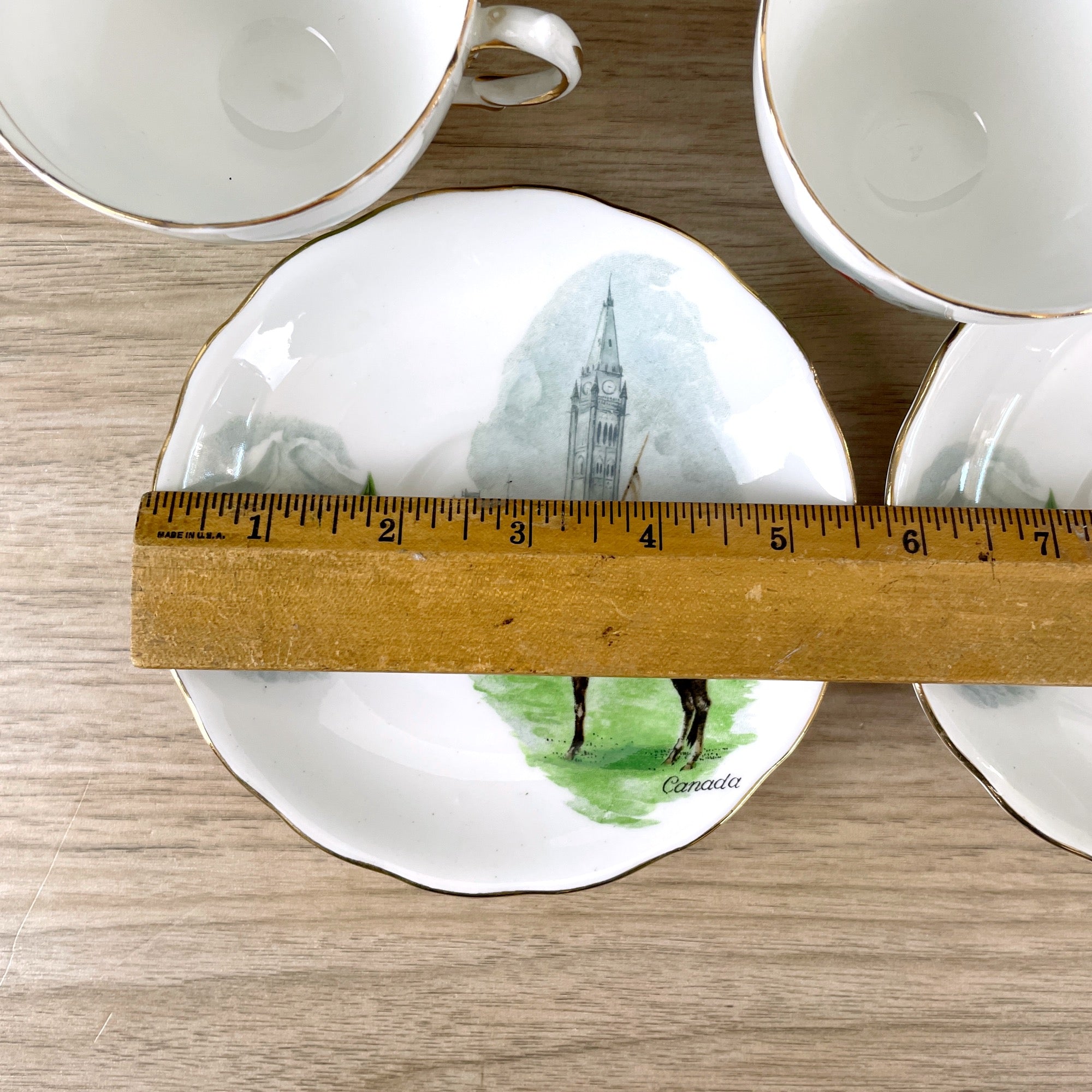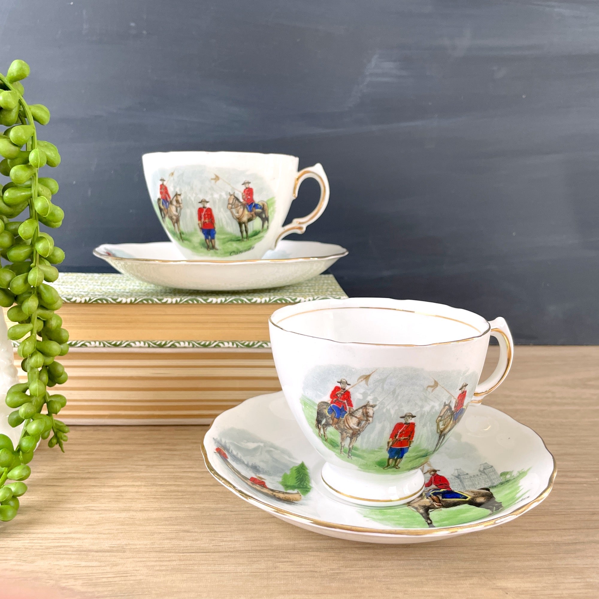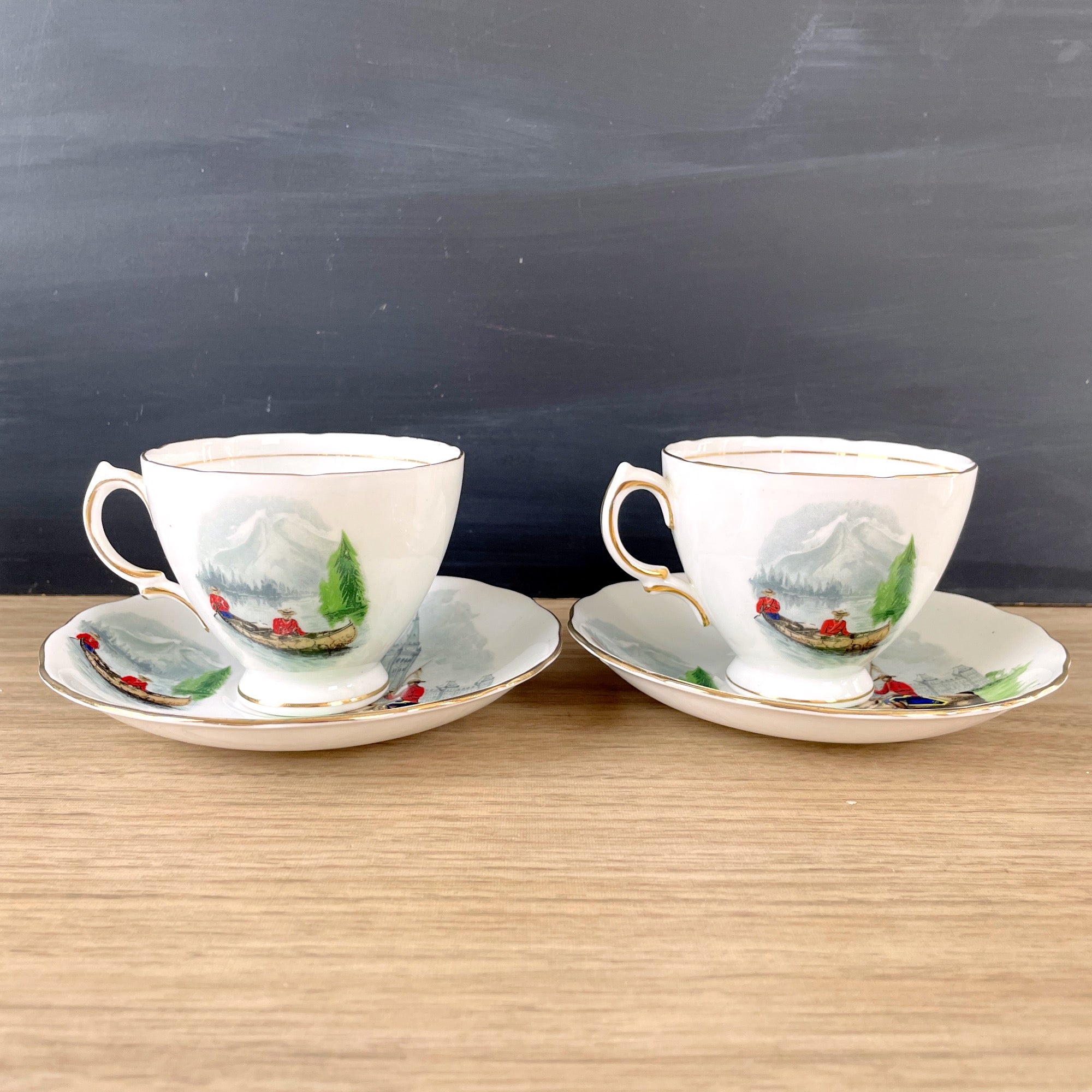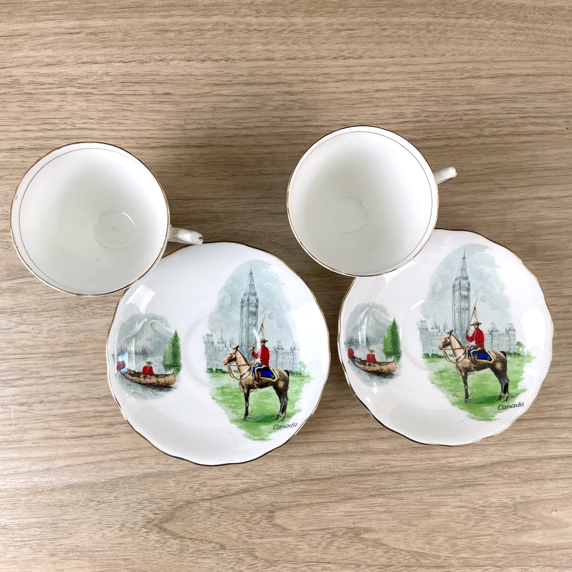 Vintage pair of matching Royal Vale footed tea cups and saucers, made in England. Three Mounties on one side, one standing in the middle of 2 on horseback with an "echo" of them fading into the background. Two in a canoe on the other side with a mountain in the background. Done in red, blue, brown, green and gray. Saucer has the same canoe picture and a single Mountie on horseback with the Canadian Parliament building in the background. Double gold banding on cup. Gold banding on saucer and cup handle.