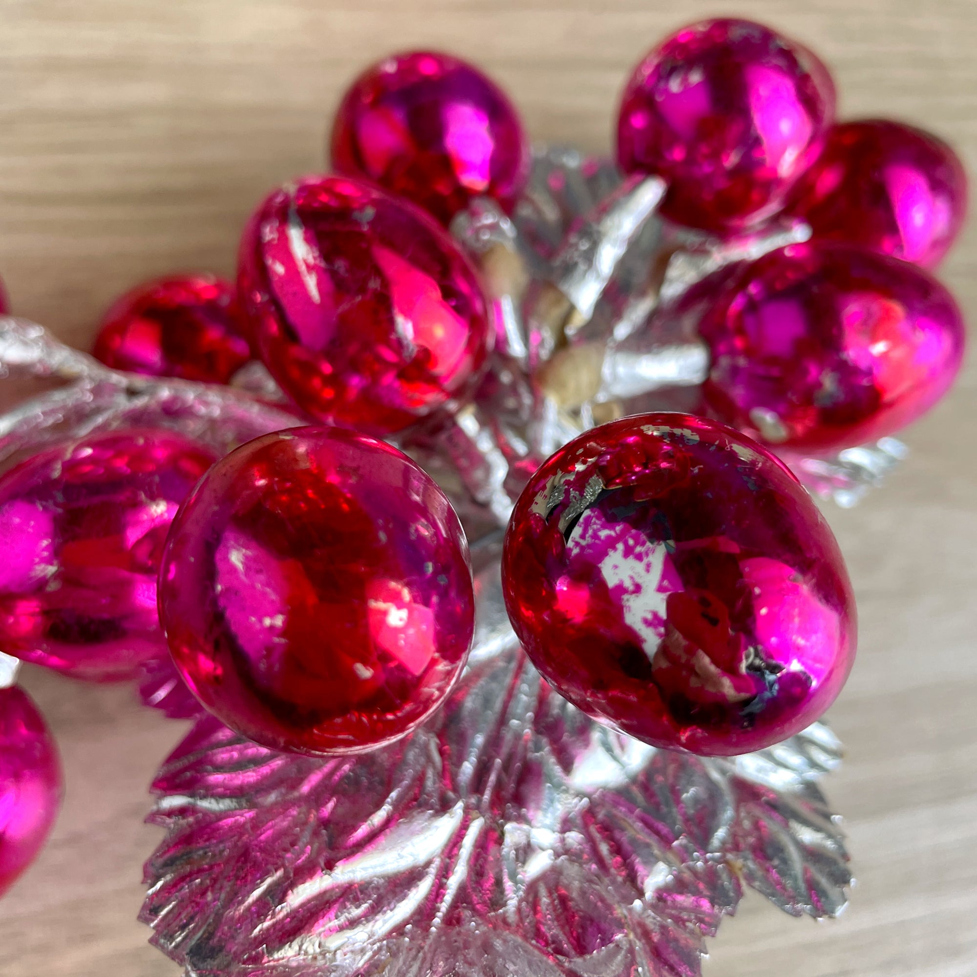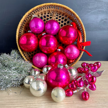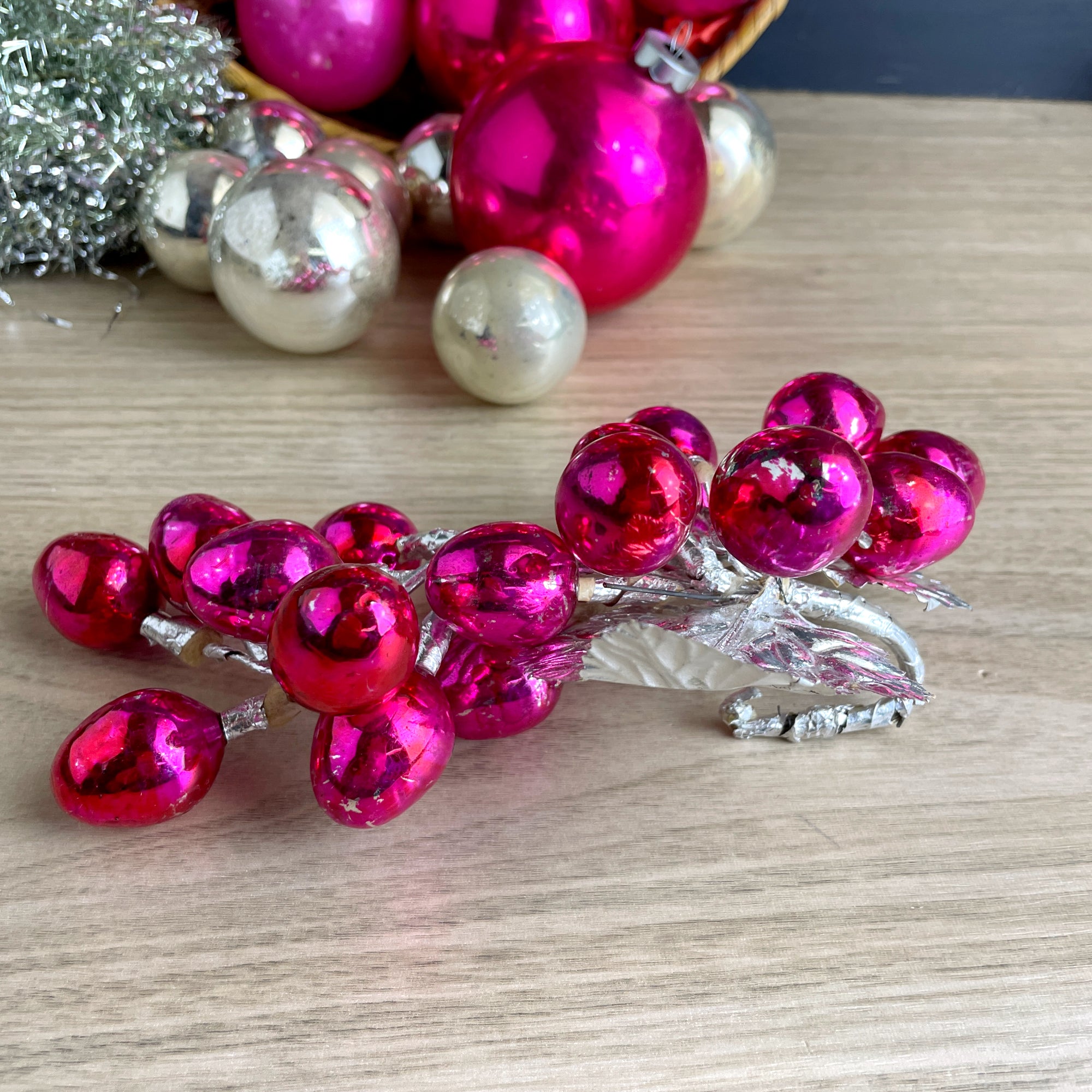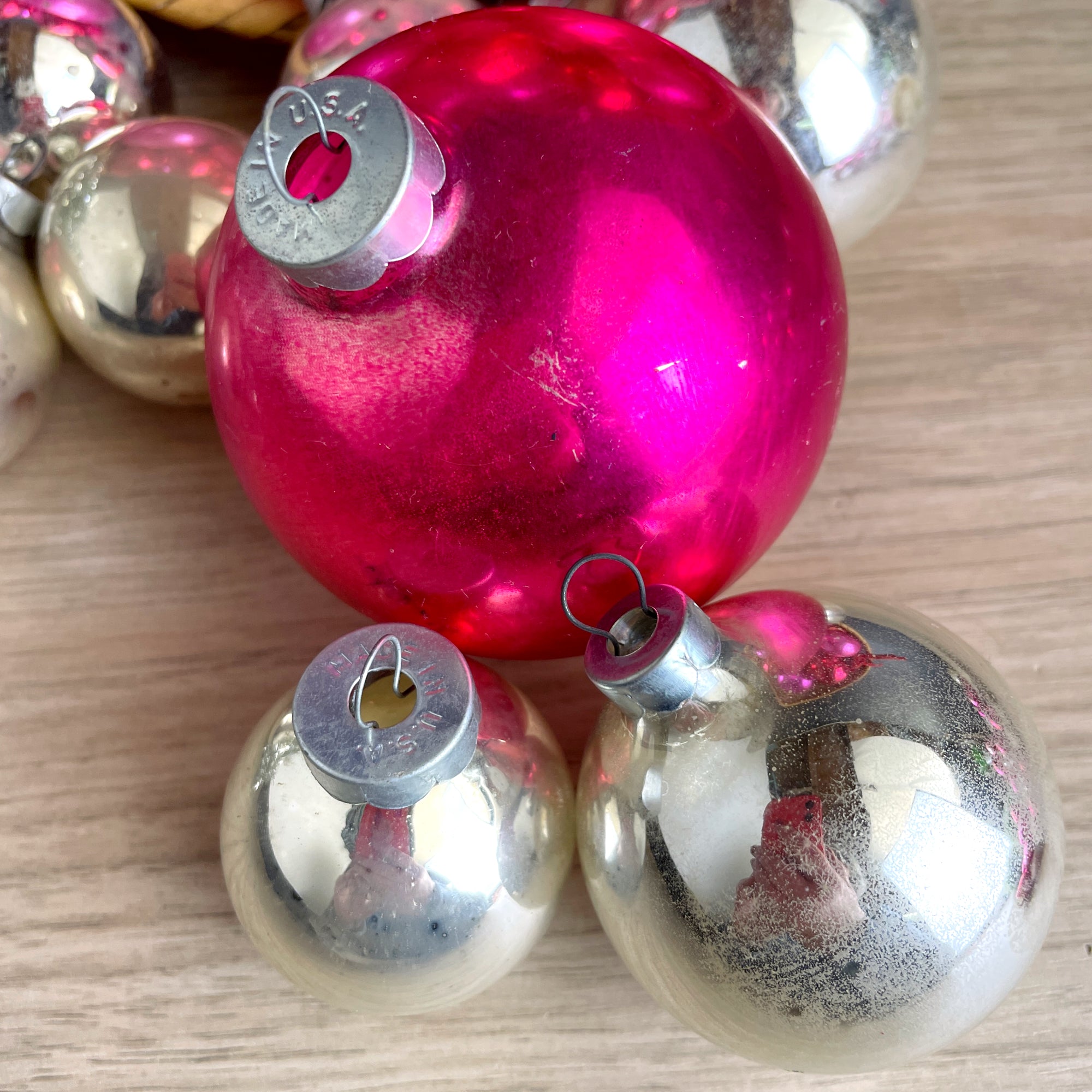 Pink and silver Christmas balls, garland, berries, incl Shiny Brite- set of 18 - vintage 50s 60s