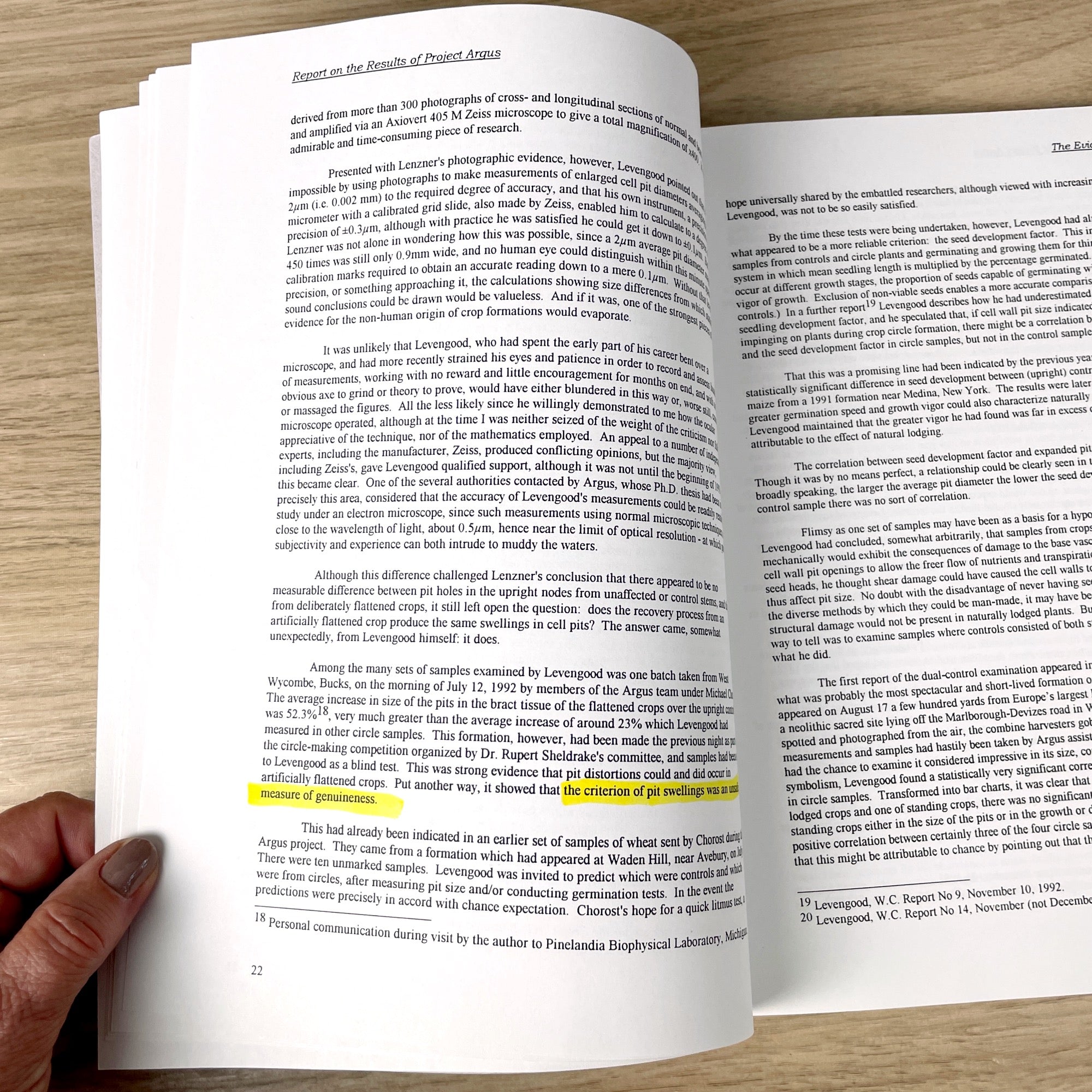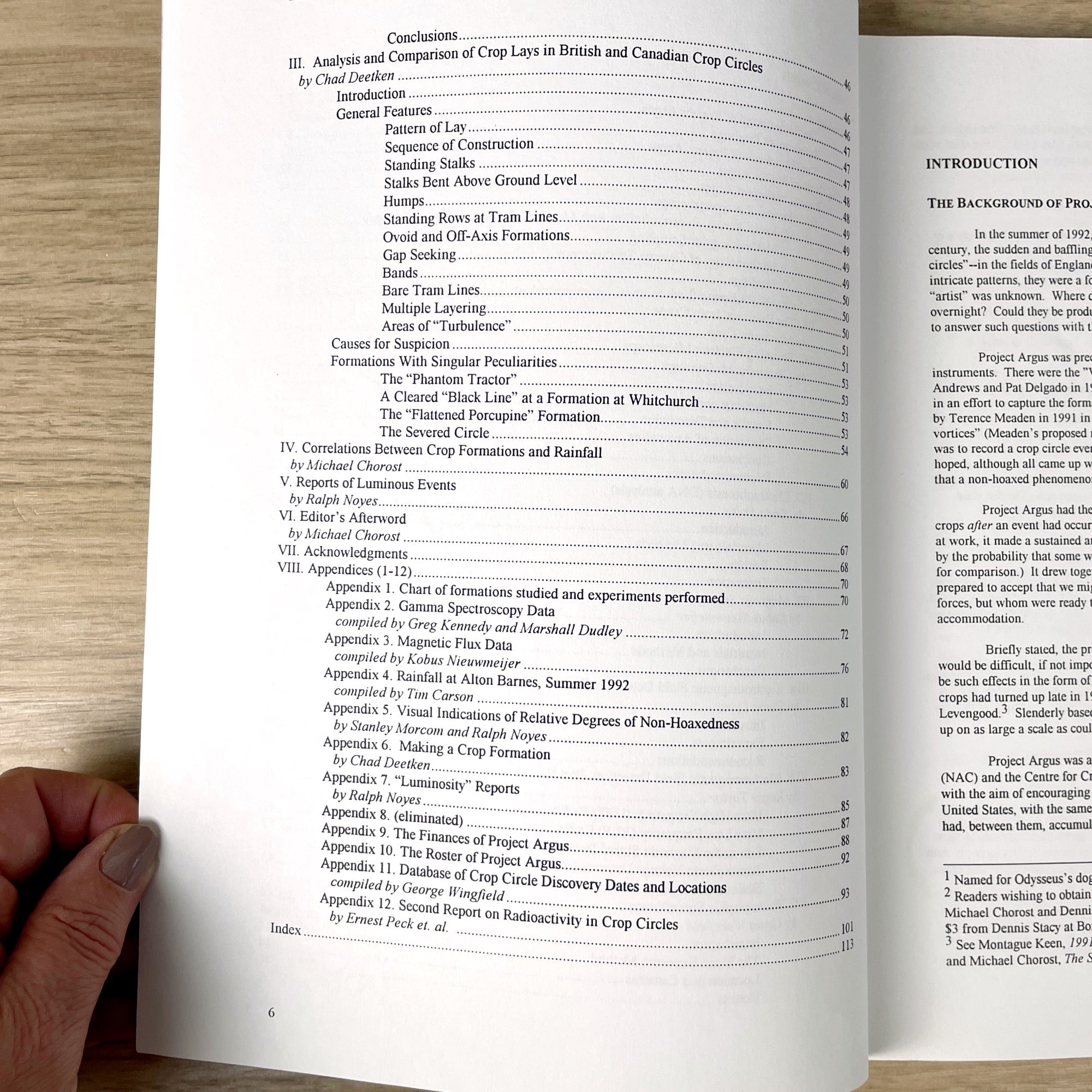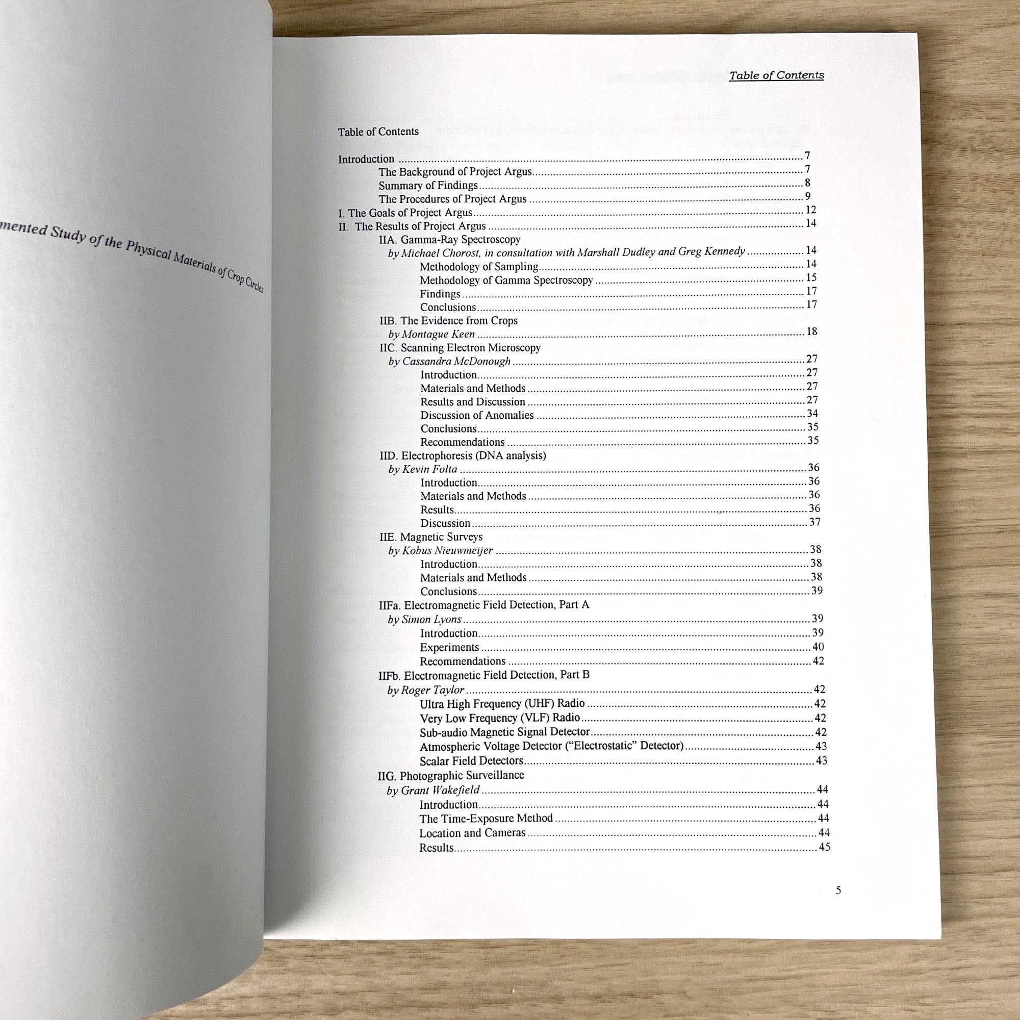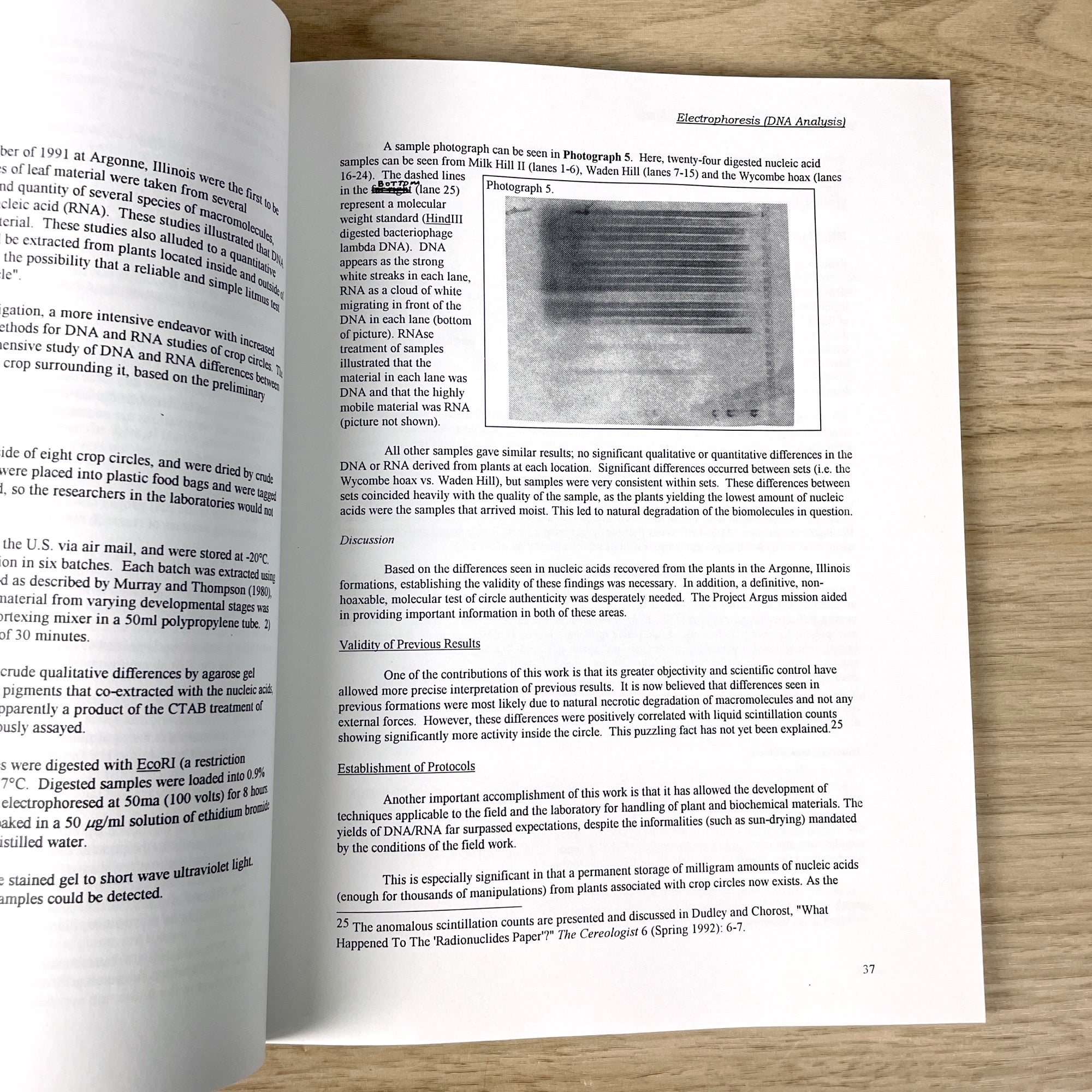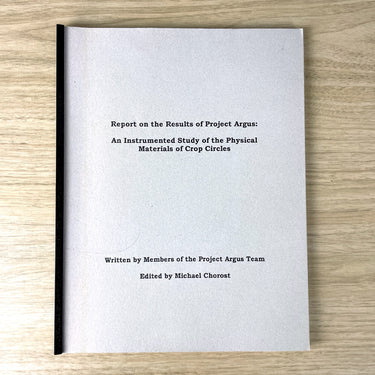 "Report on the Results of Project Argus: An Instrumental Study of the Physical Materials of Crop Circles" written by Members of the Project Argus Team. Edited by Michael Chorost. 1993 paperback with pin binding.