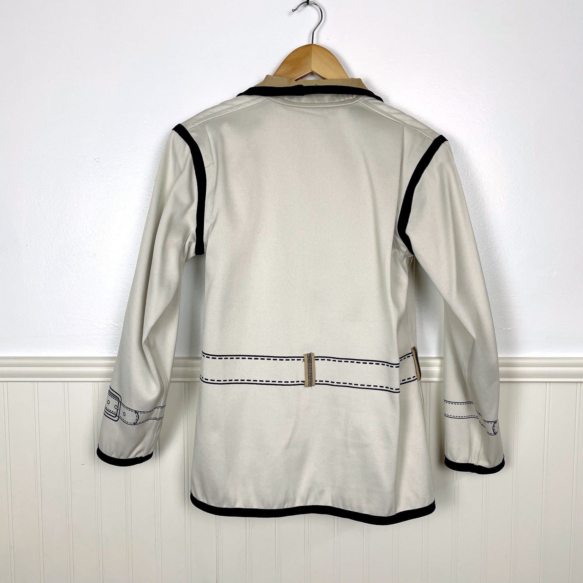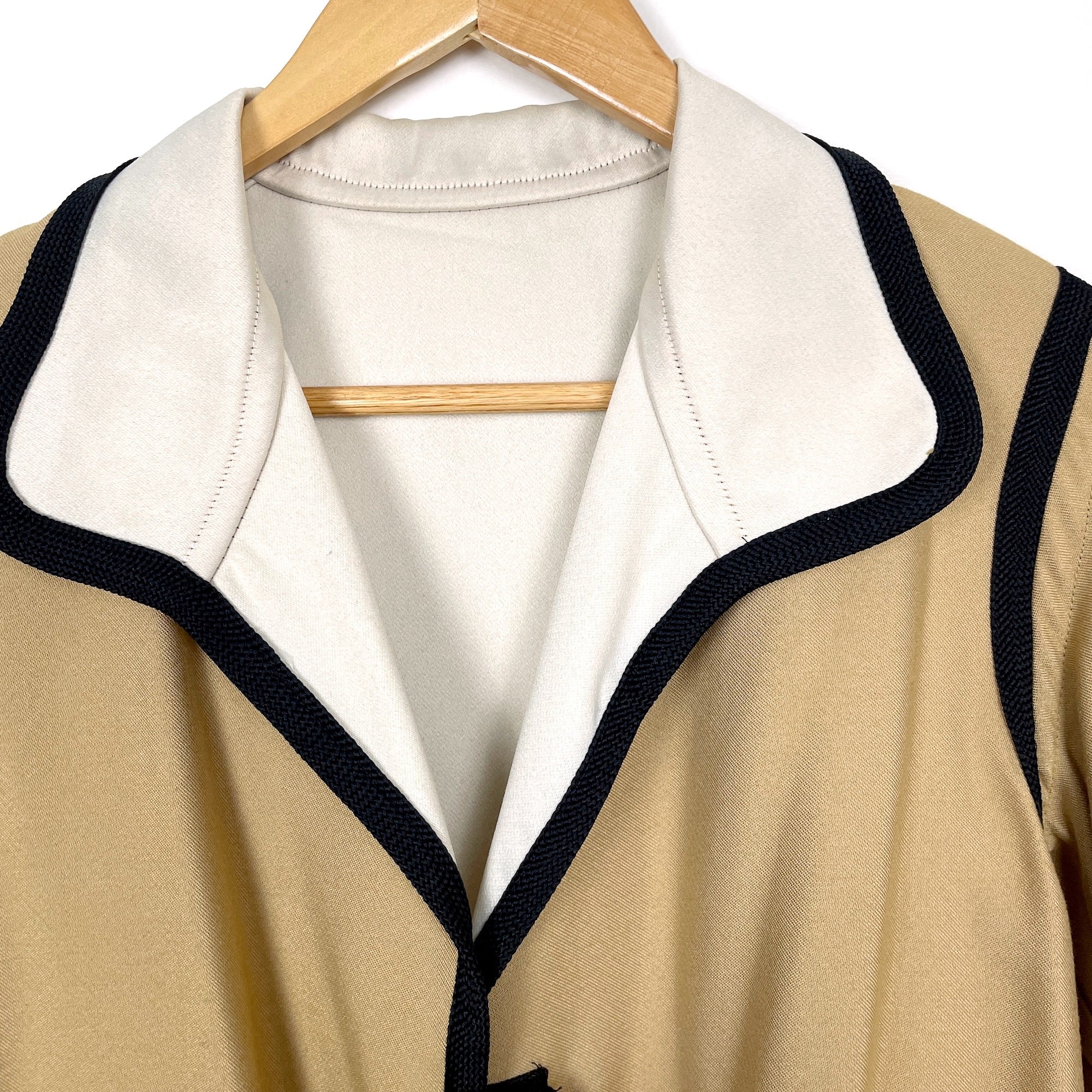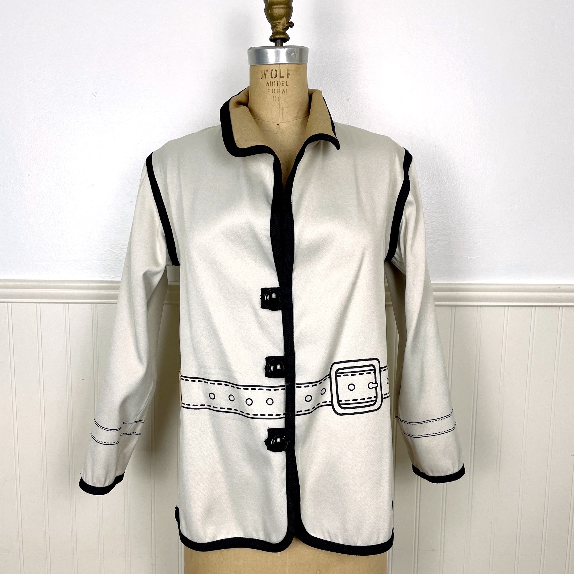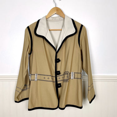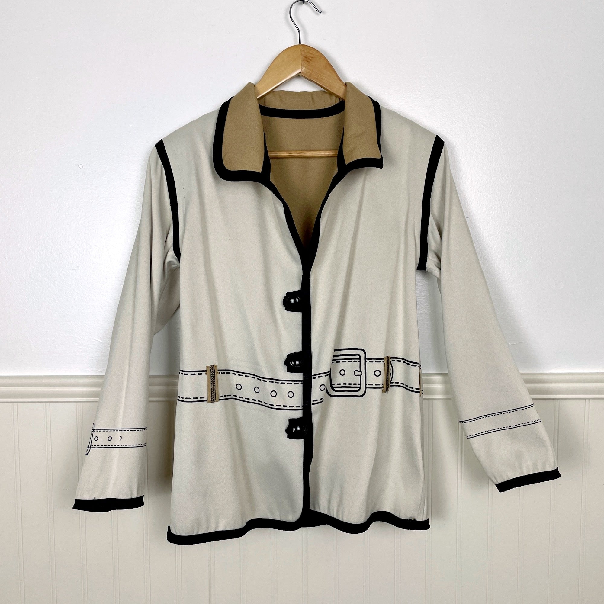 Eyecatching novelty reversible jacket with jacket details on both sides. Tan side or ecru side, you decide. Trimmed with a black braid. Black buttons on each side. No labels or care information.