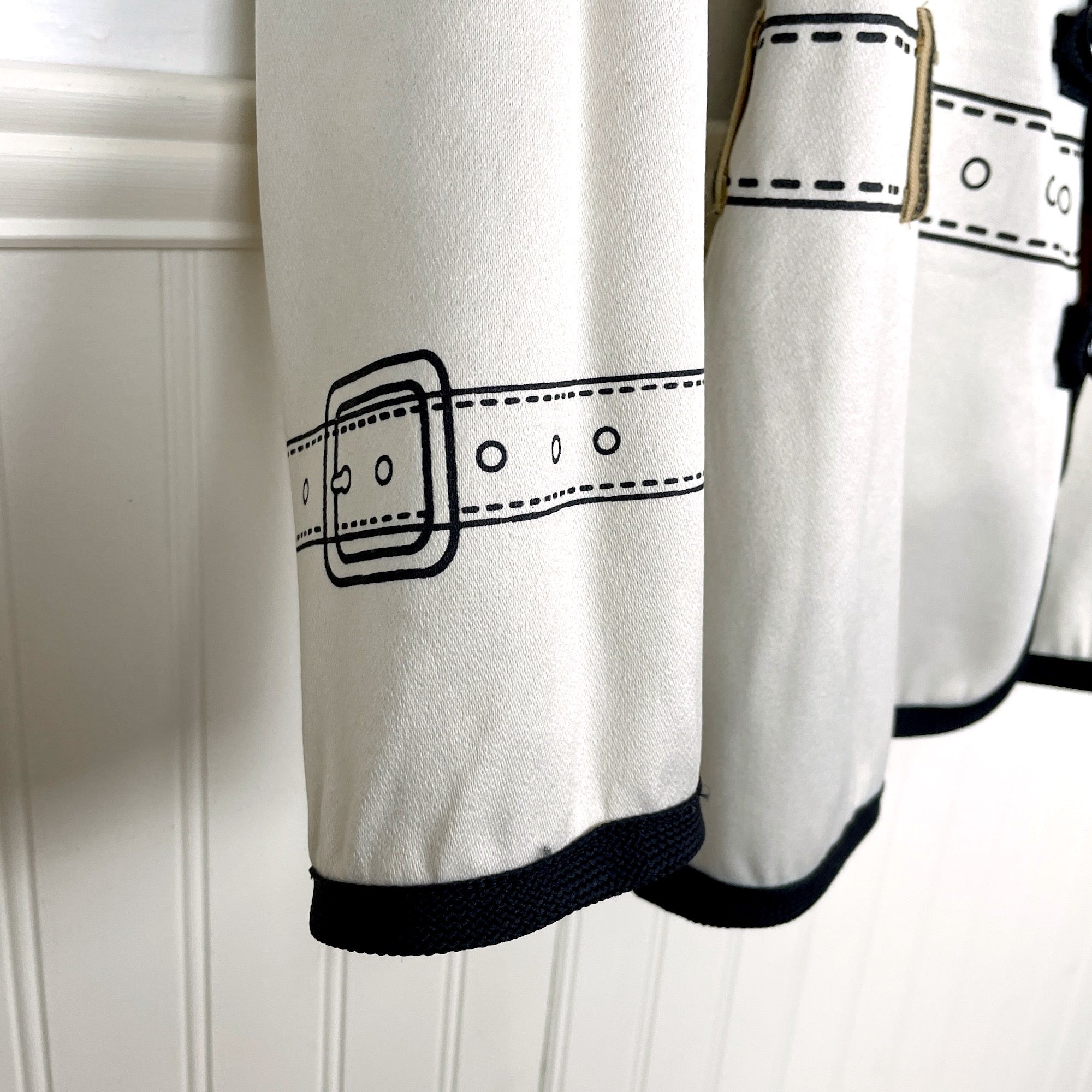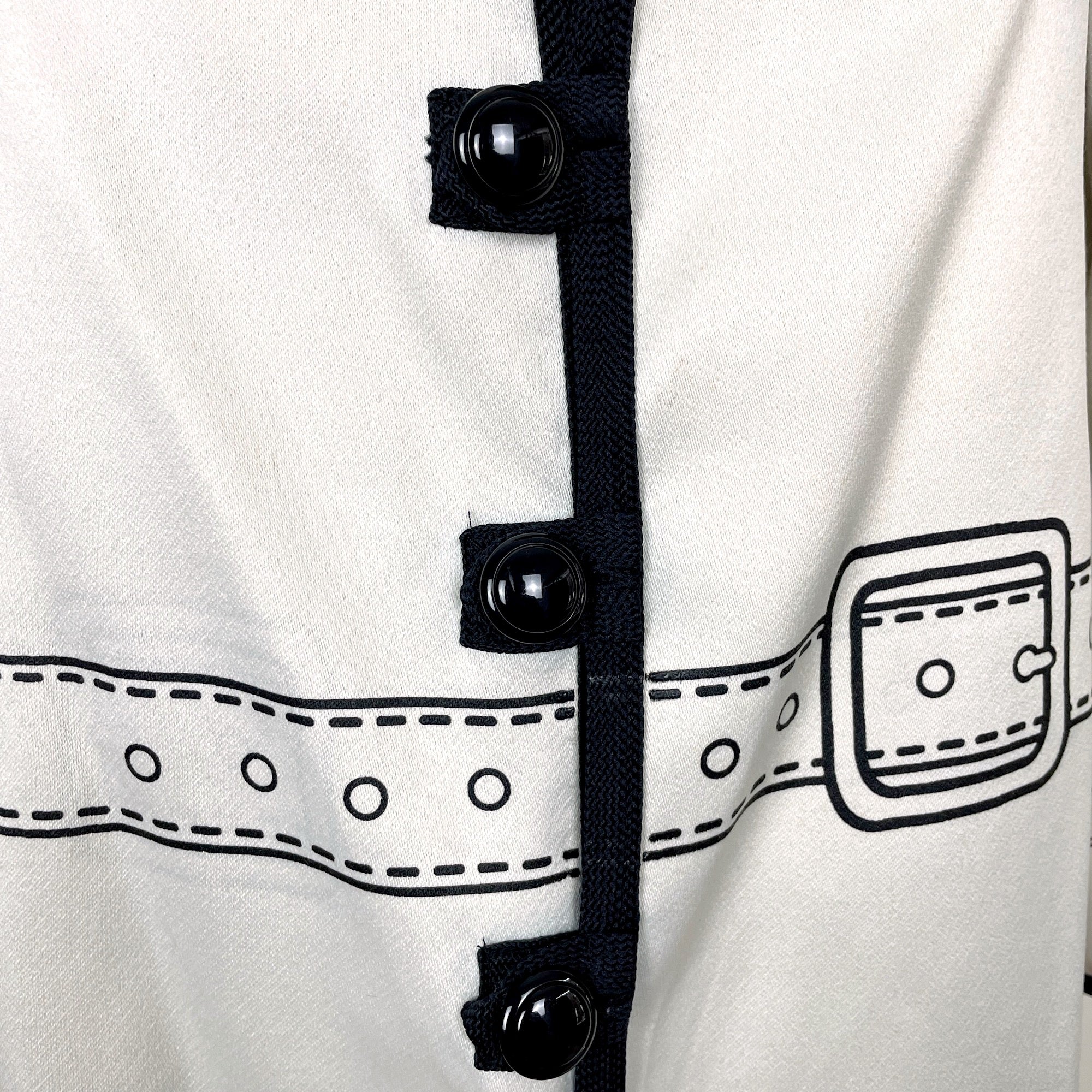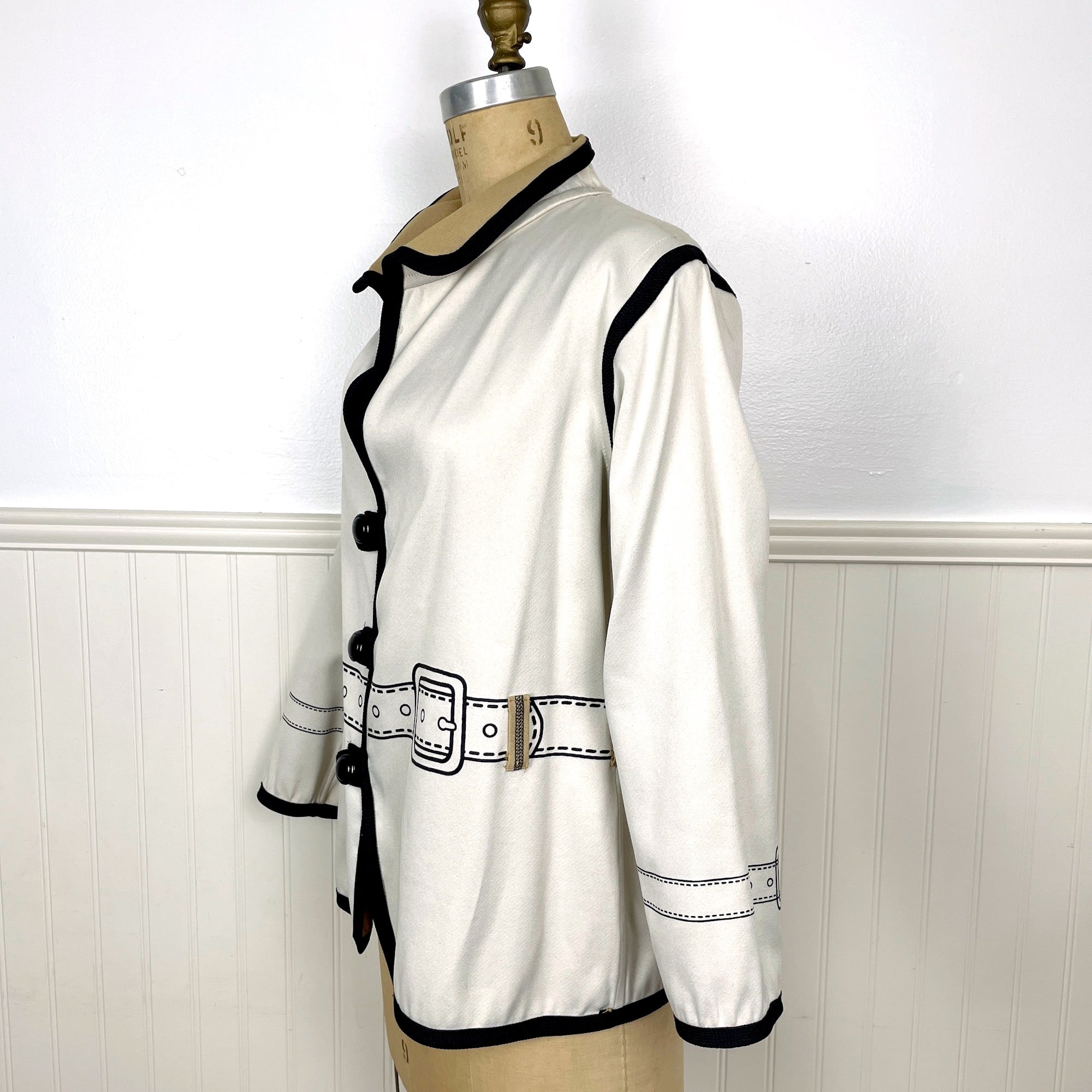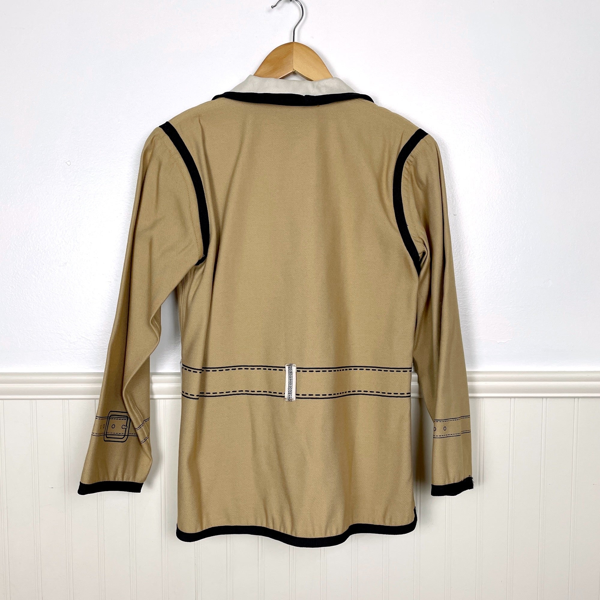 Eyecatching novelty reversible jacket with jacket details on both sides. Tan side or ecru side, you decide. Trimmed with a black braid. Black buttons on each side. No labels or care information.