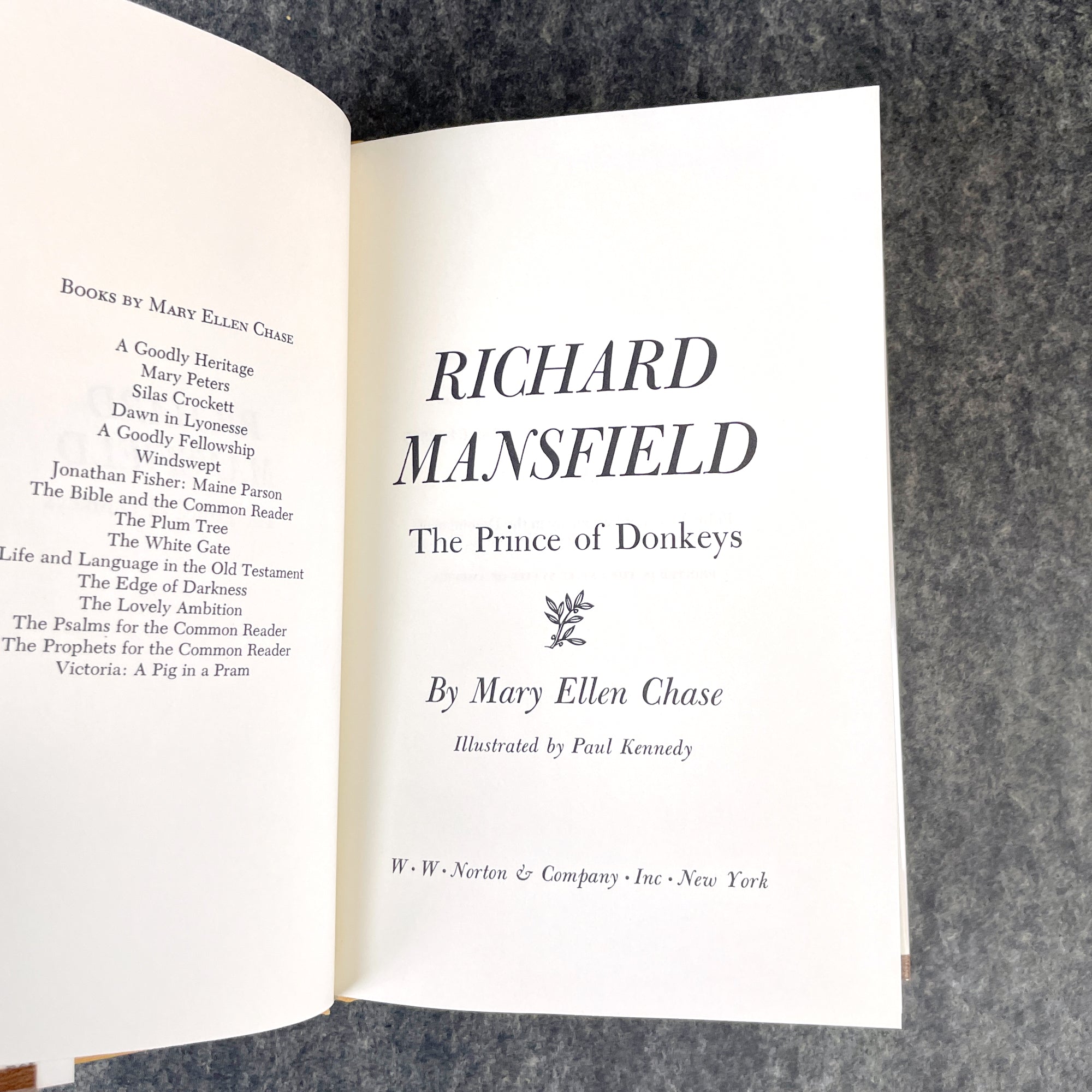 "Richard Mansfield: the Prince of Donkeys" by Mary Ellen Chase. Illustrated by Paul Kennedy. 1964. W. W. Norton & Co. Hardcover reinforced library edition with acetate covered dust jacket.