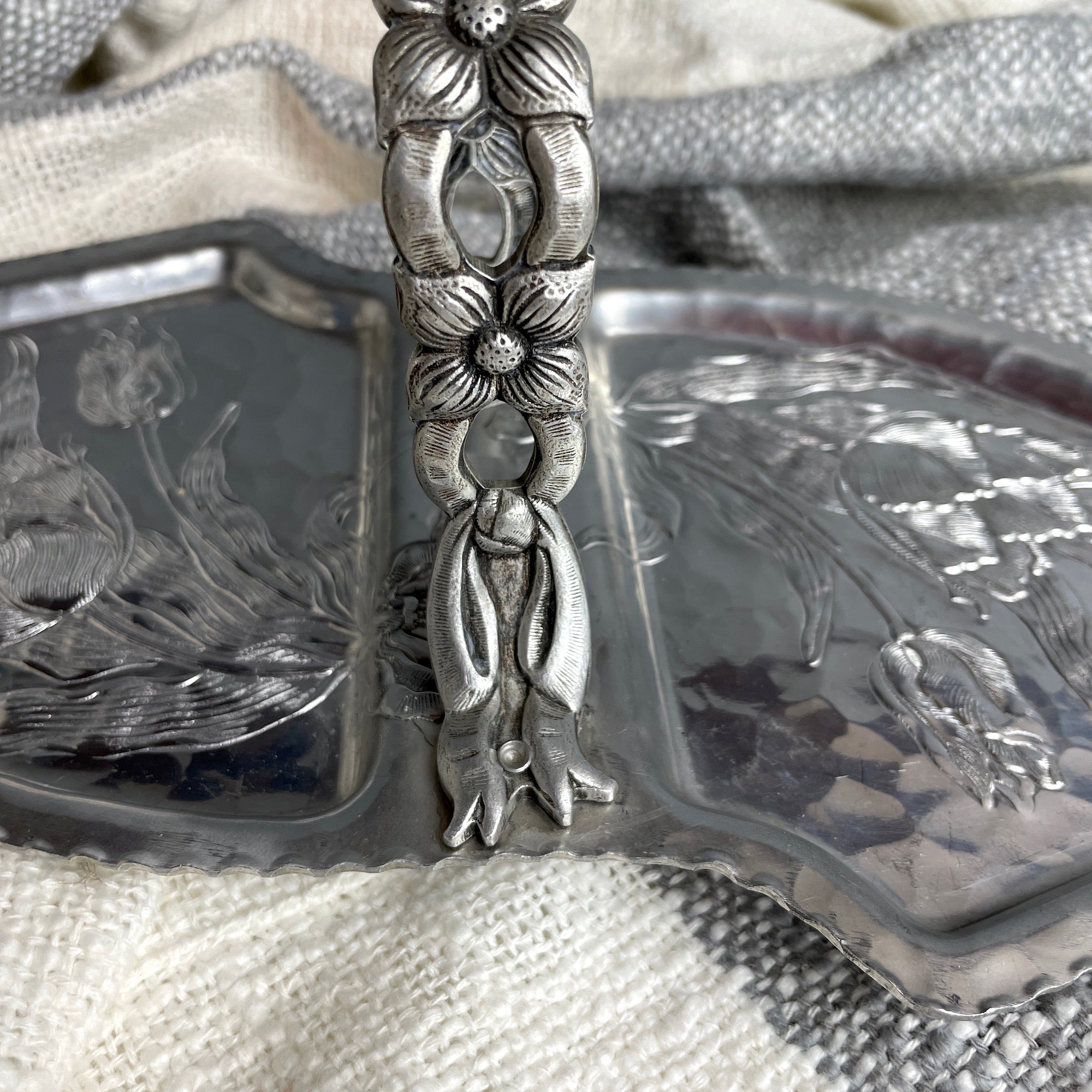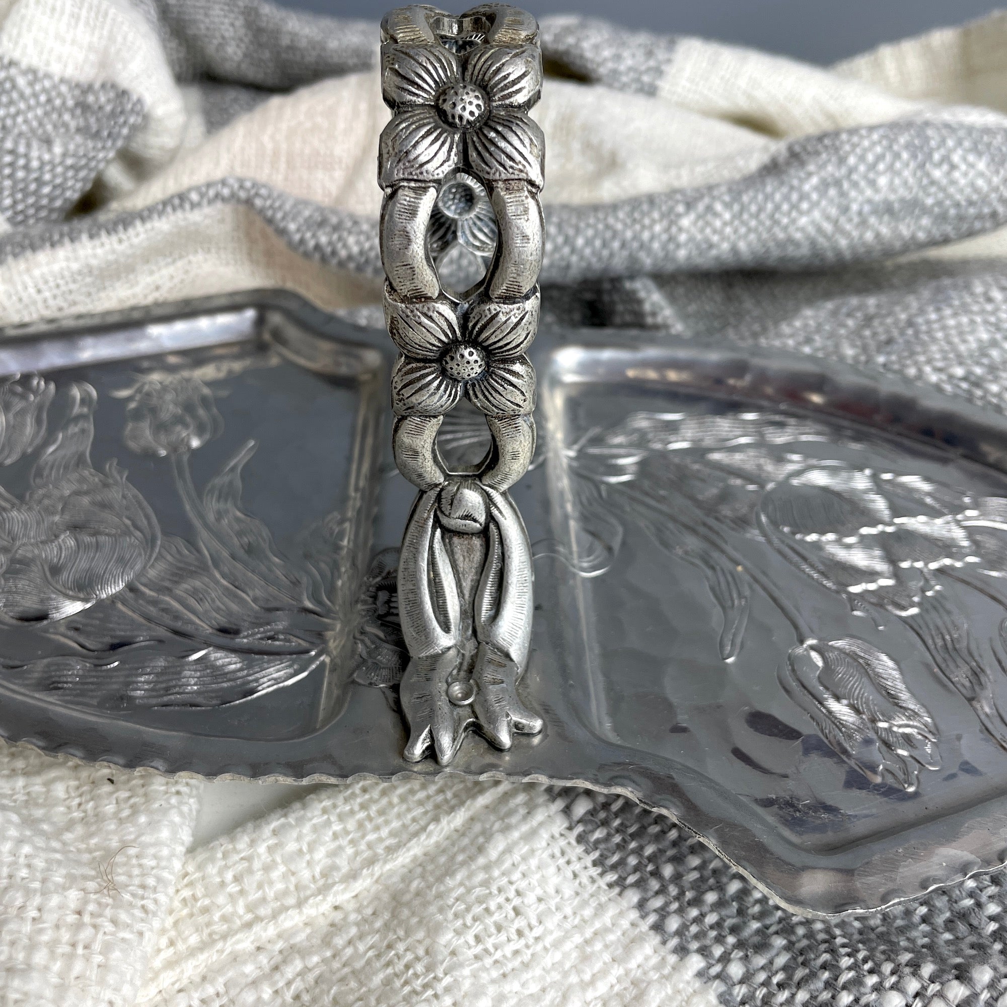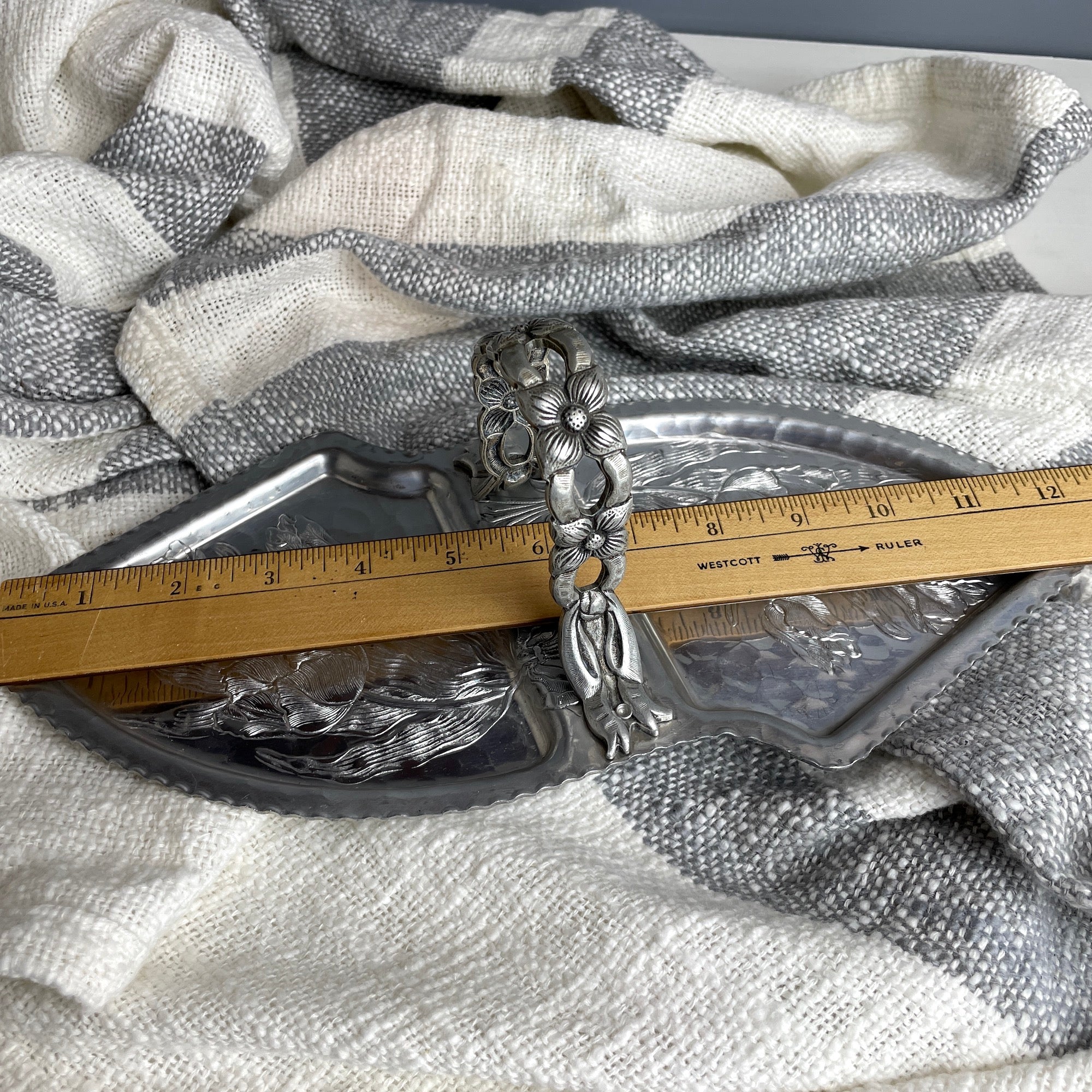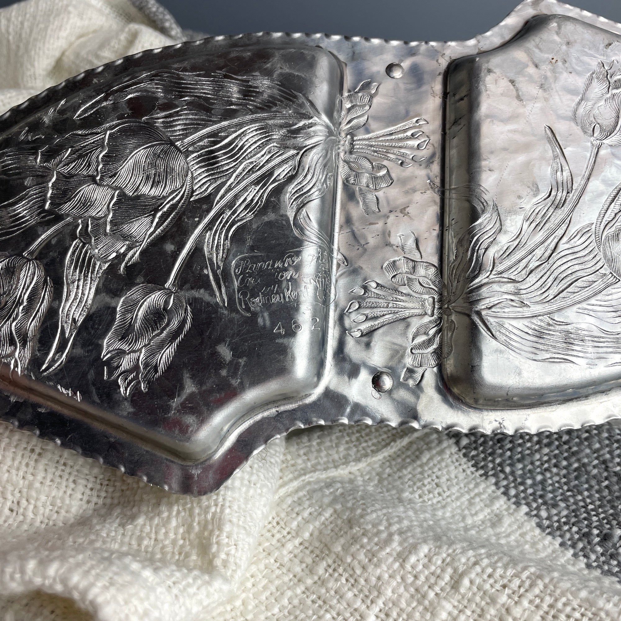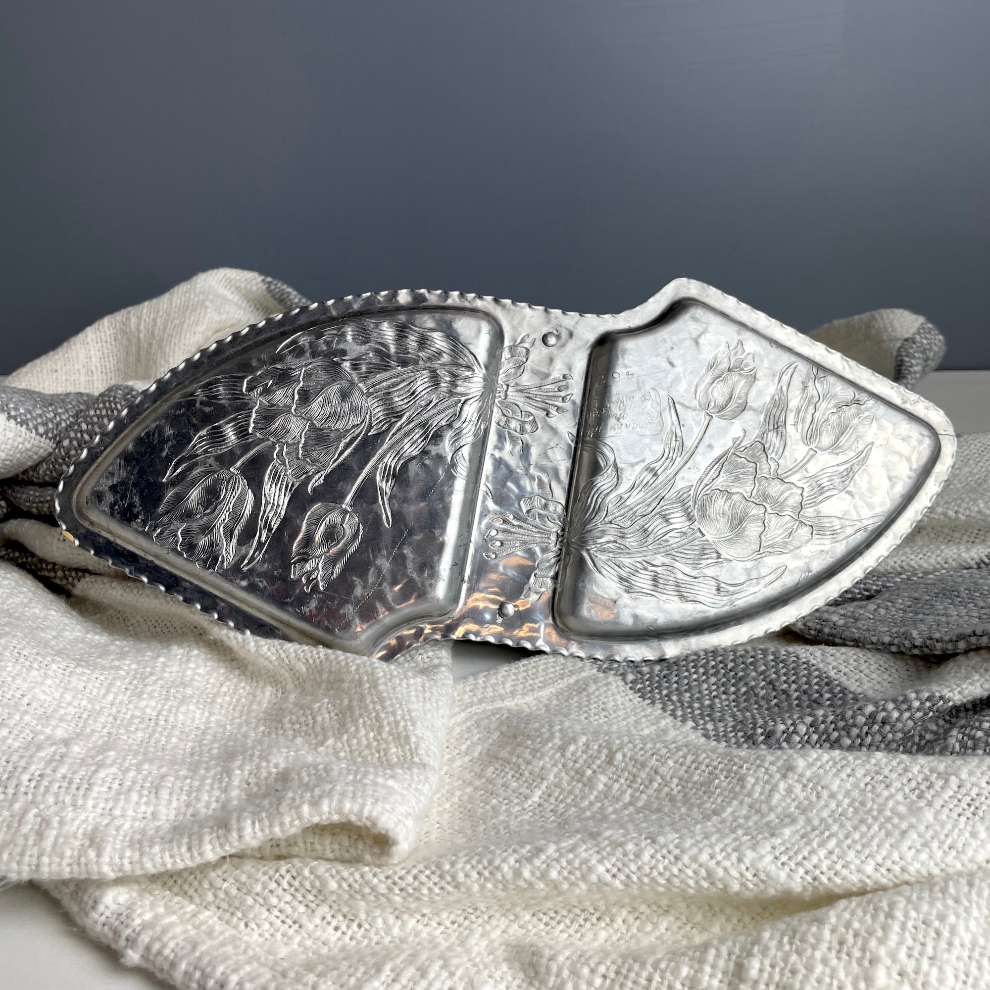 Rodney Kent hammered aluminum server with tulip pattern #462 - 1950s vintage