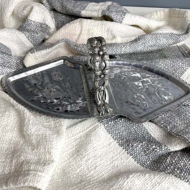 Vintage 1950s Rodney Kent #462 curved hammered aluminum server with floral handle and popular tulip pattern. Scalloped edge. Handle is riveted on. Heavyweight aluminum, made in the USA. Useful for serving charcuterie or olives.