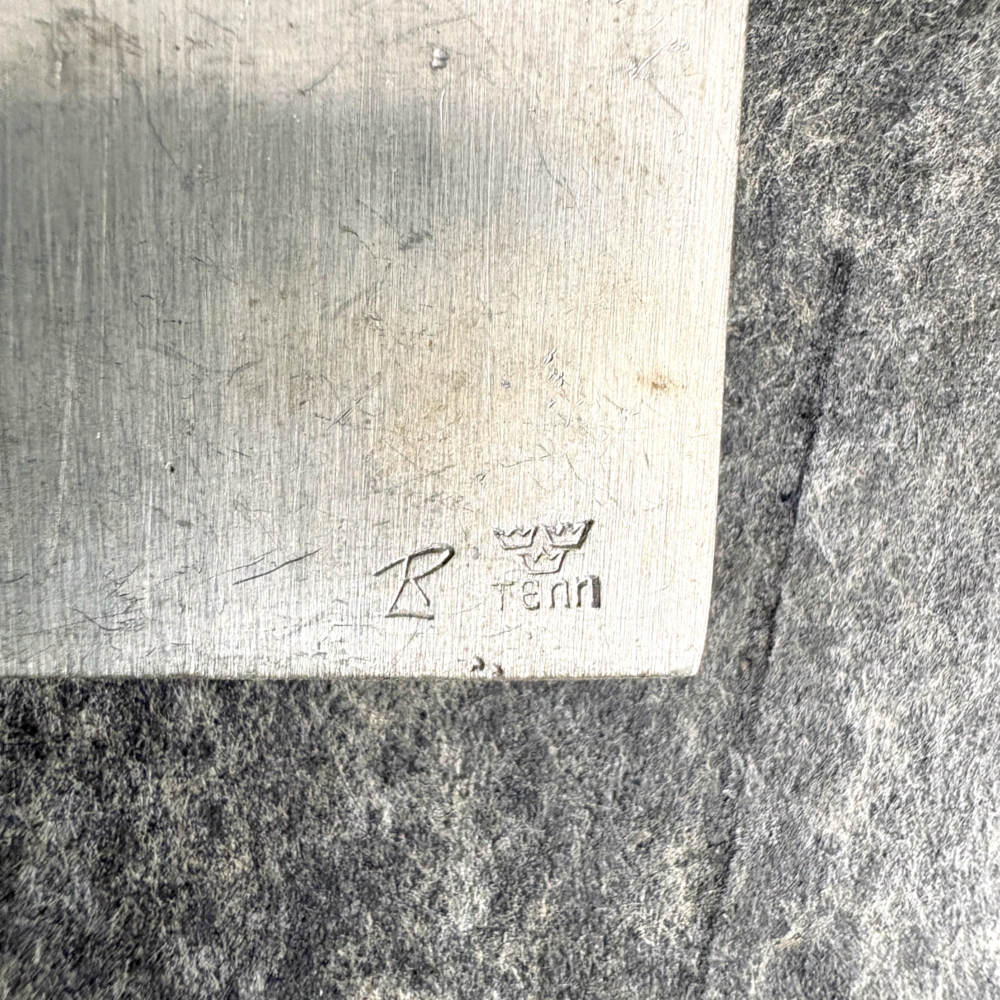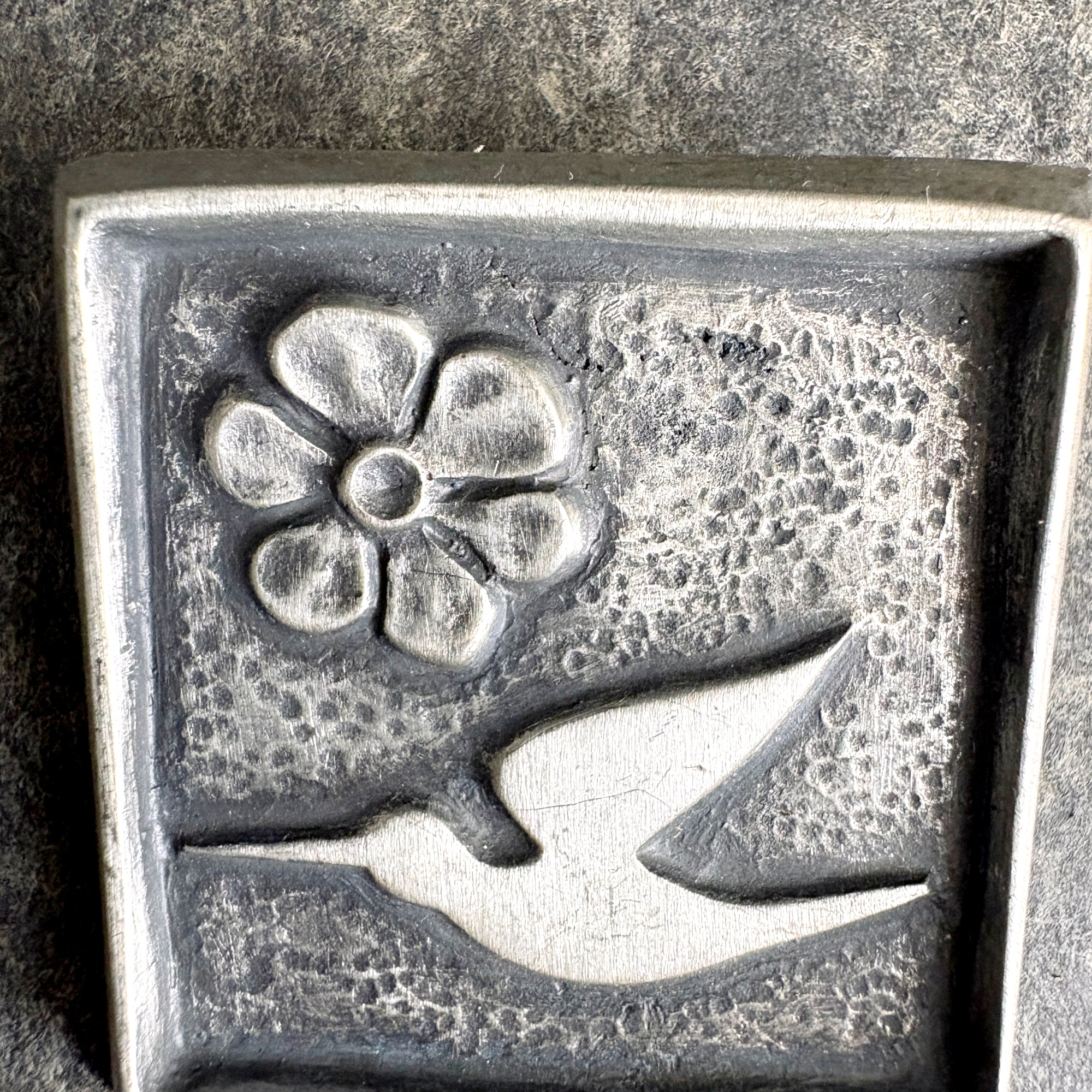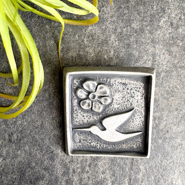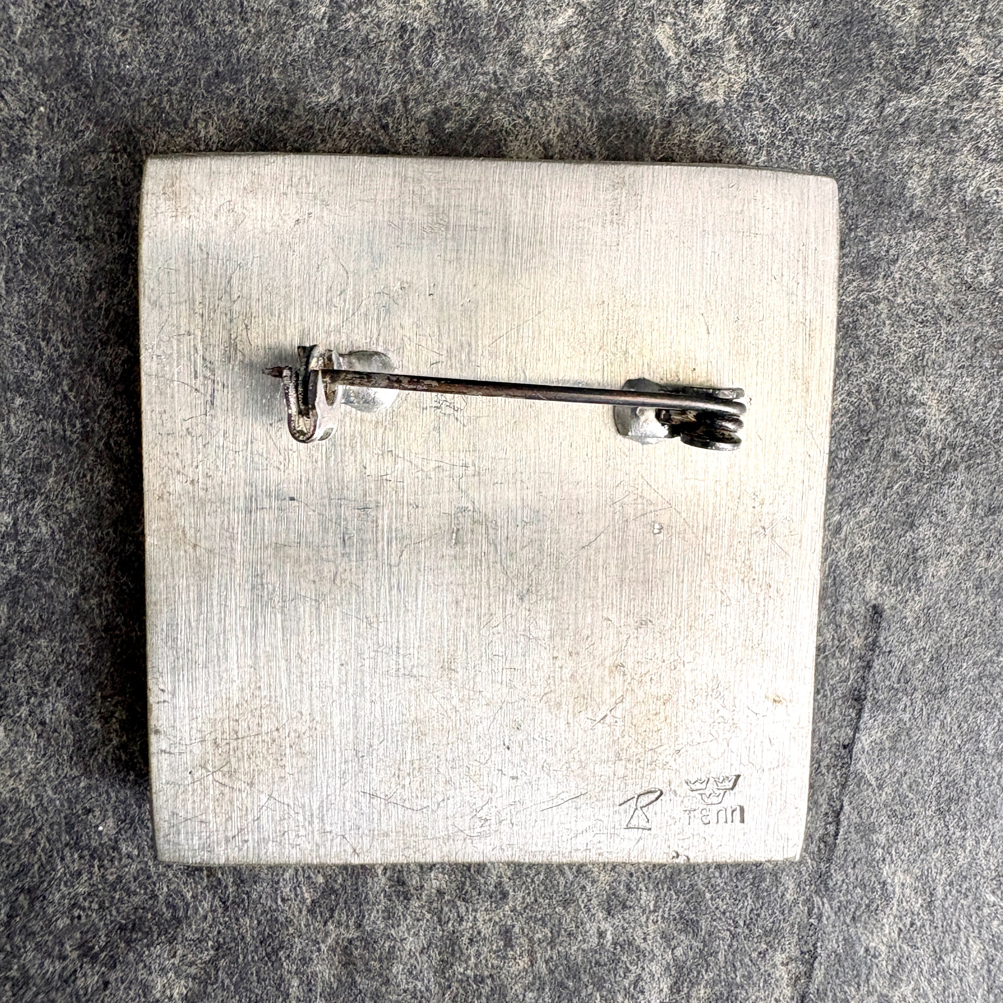 Vintage 1960s Roland Landerholm modernist pewter brooch featuring a hummingbird and a flower. Square brooch has raised design. Signed on the back with an underlined capital R, and marked TENN, the Swedish term for tin/pewter.