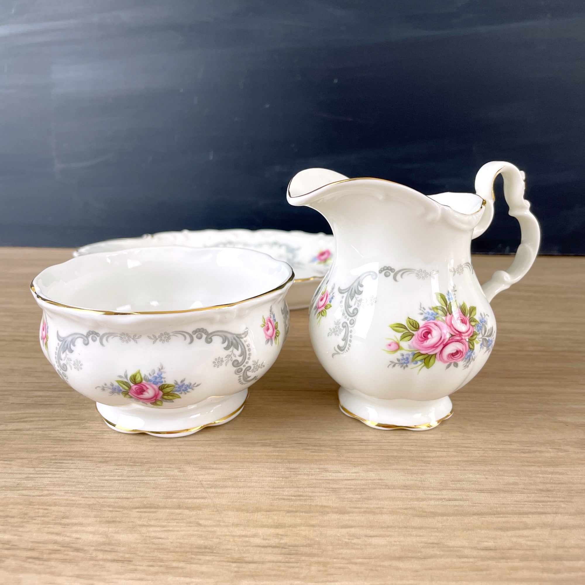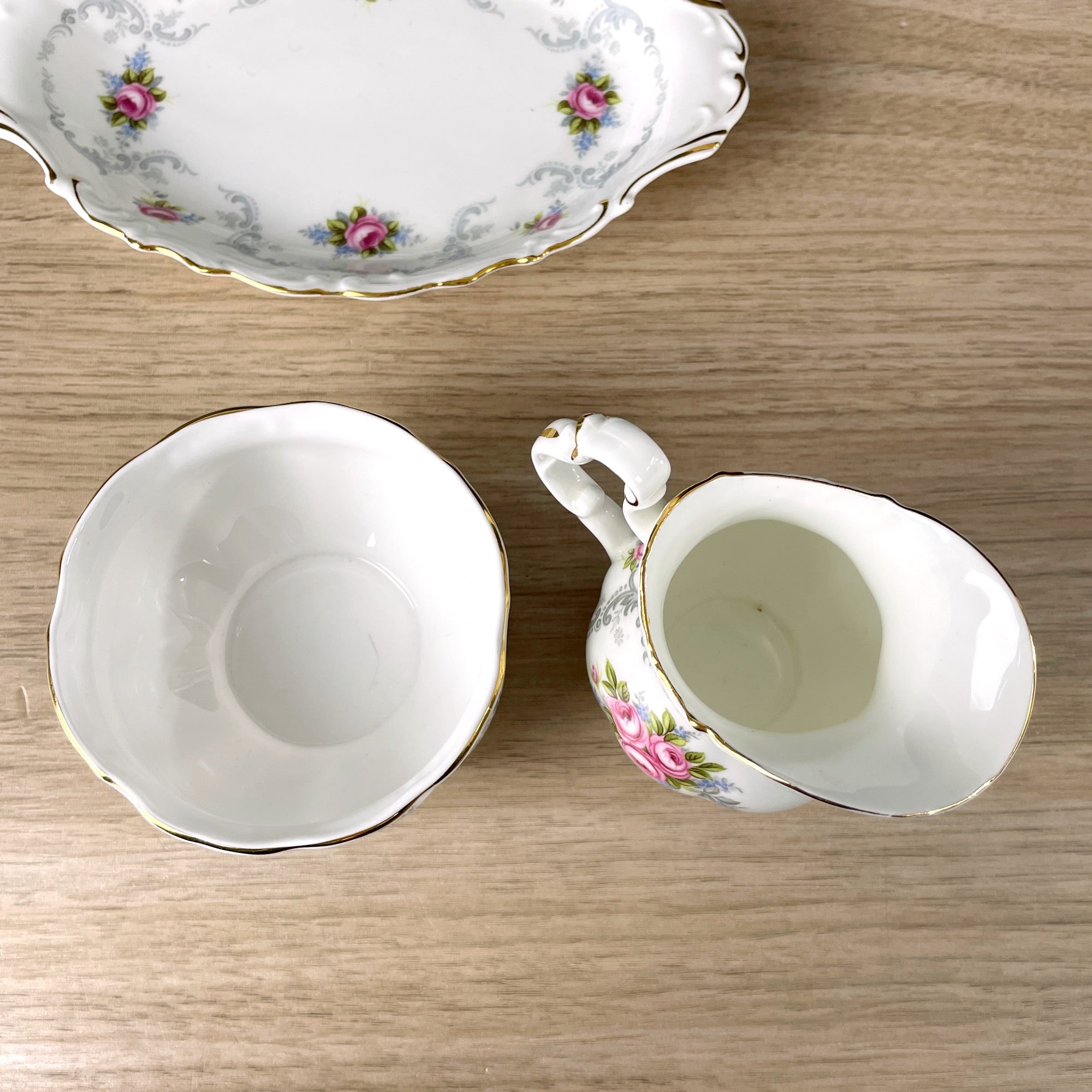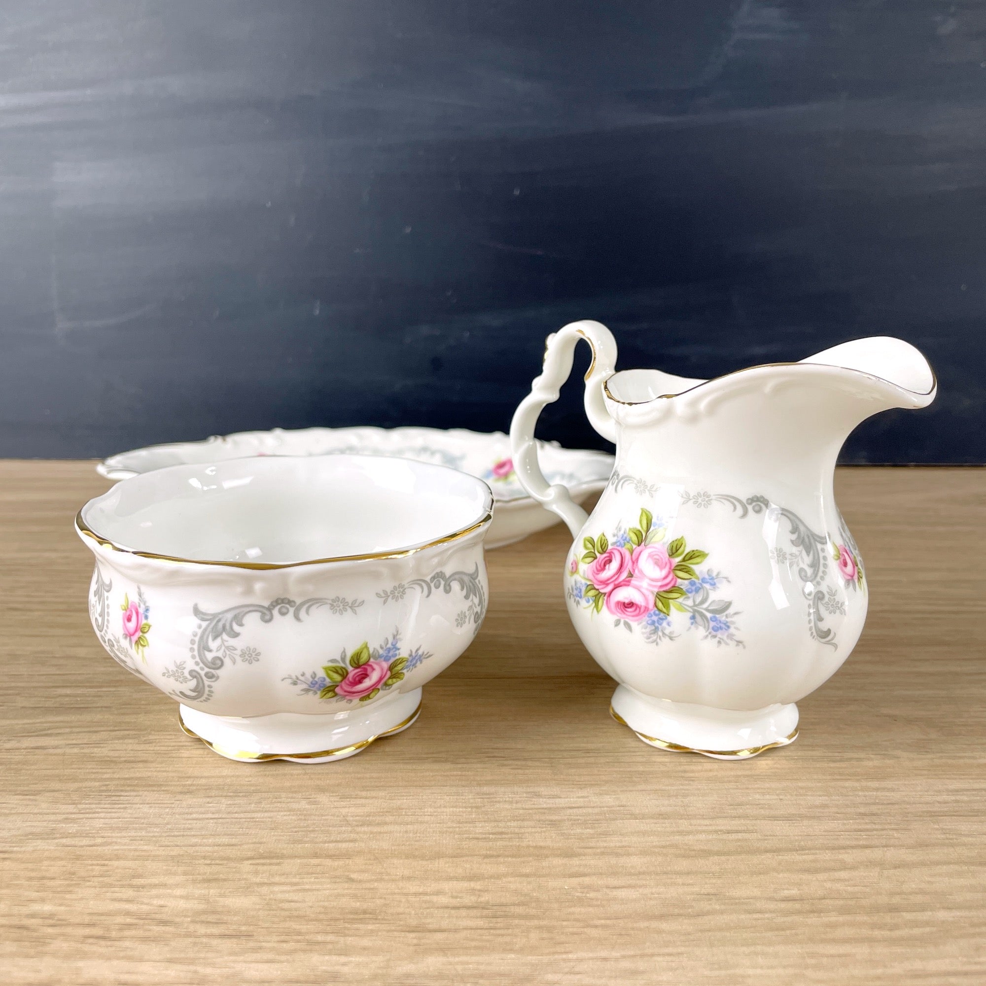 Royal Albert Tranquility pattern set of three pieces: a mini creamer, open sugar bowl and tray.