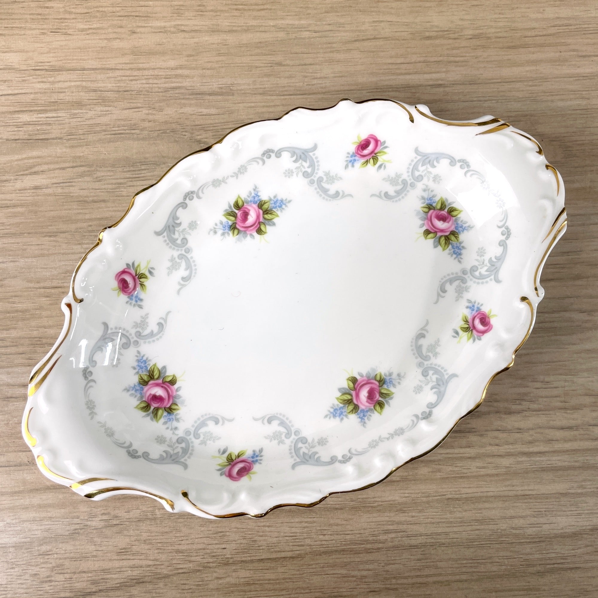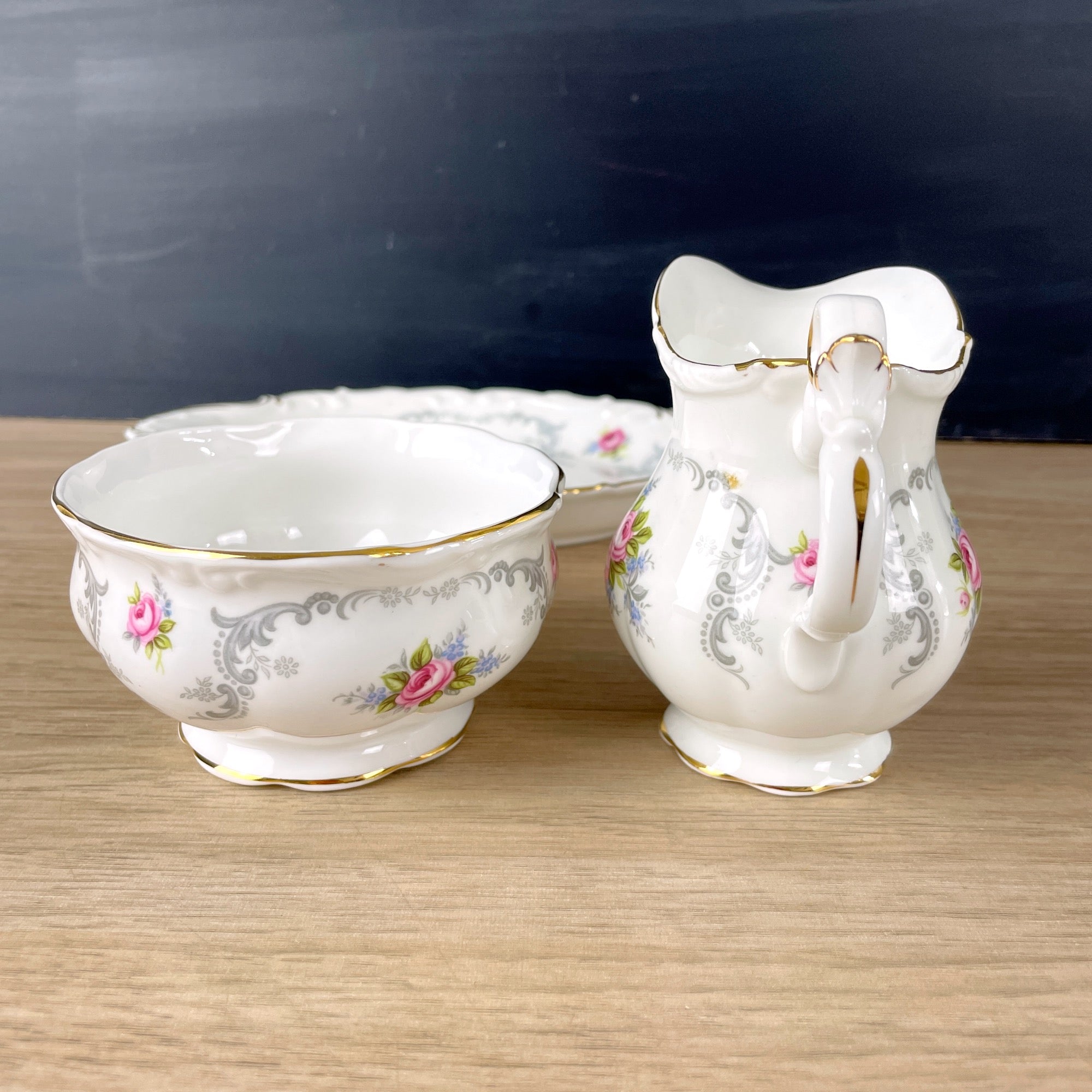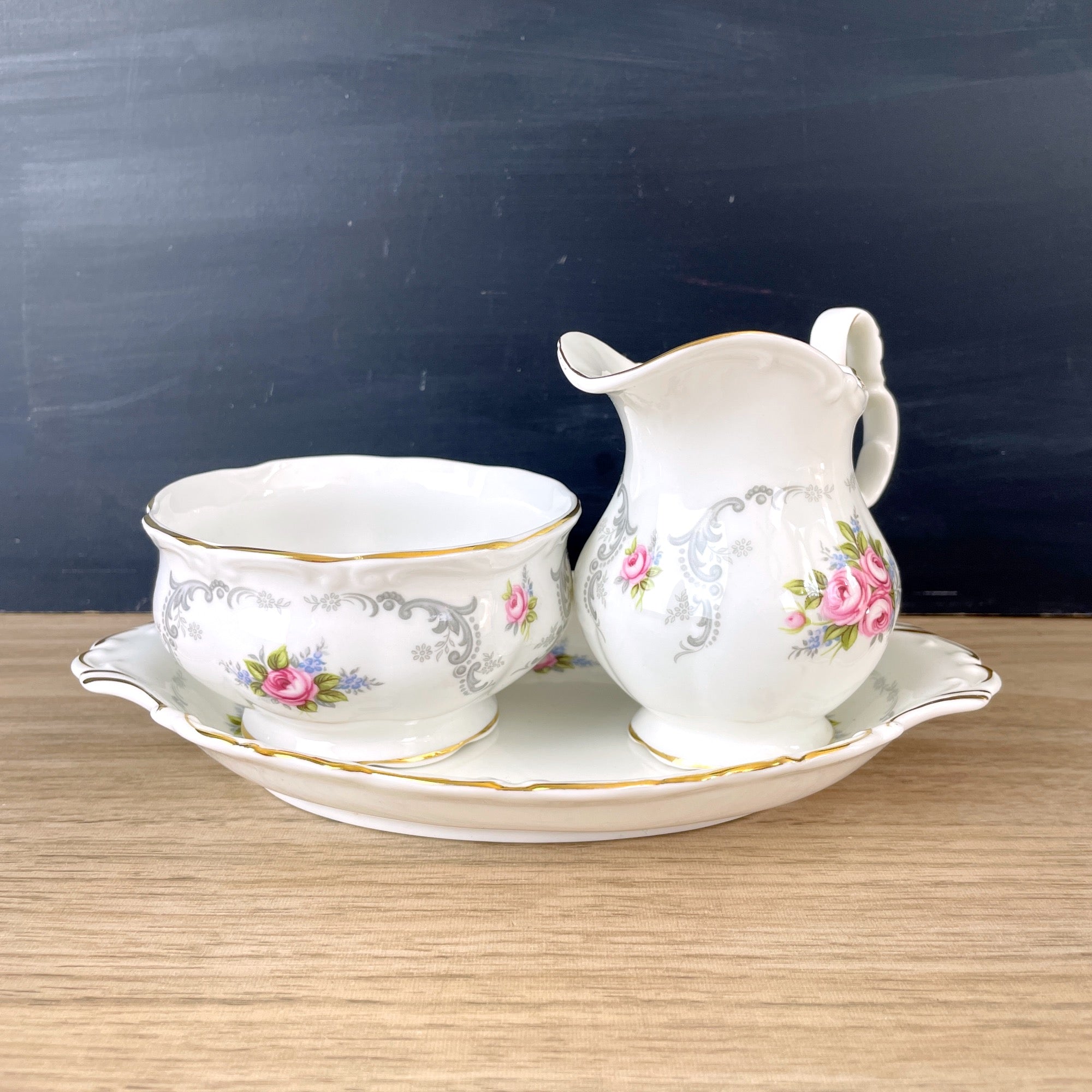 Royal Albert Tranquility pattern set of three pieces: a mini creamer, open sugar bowl and tray.