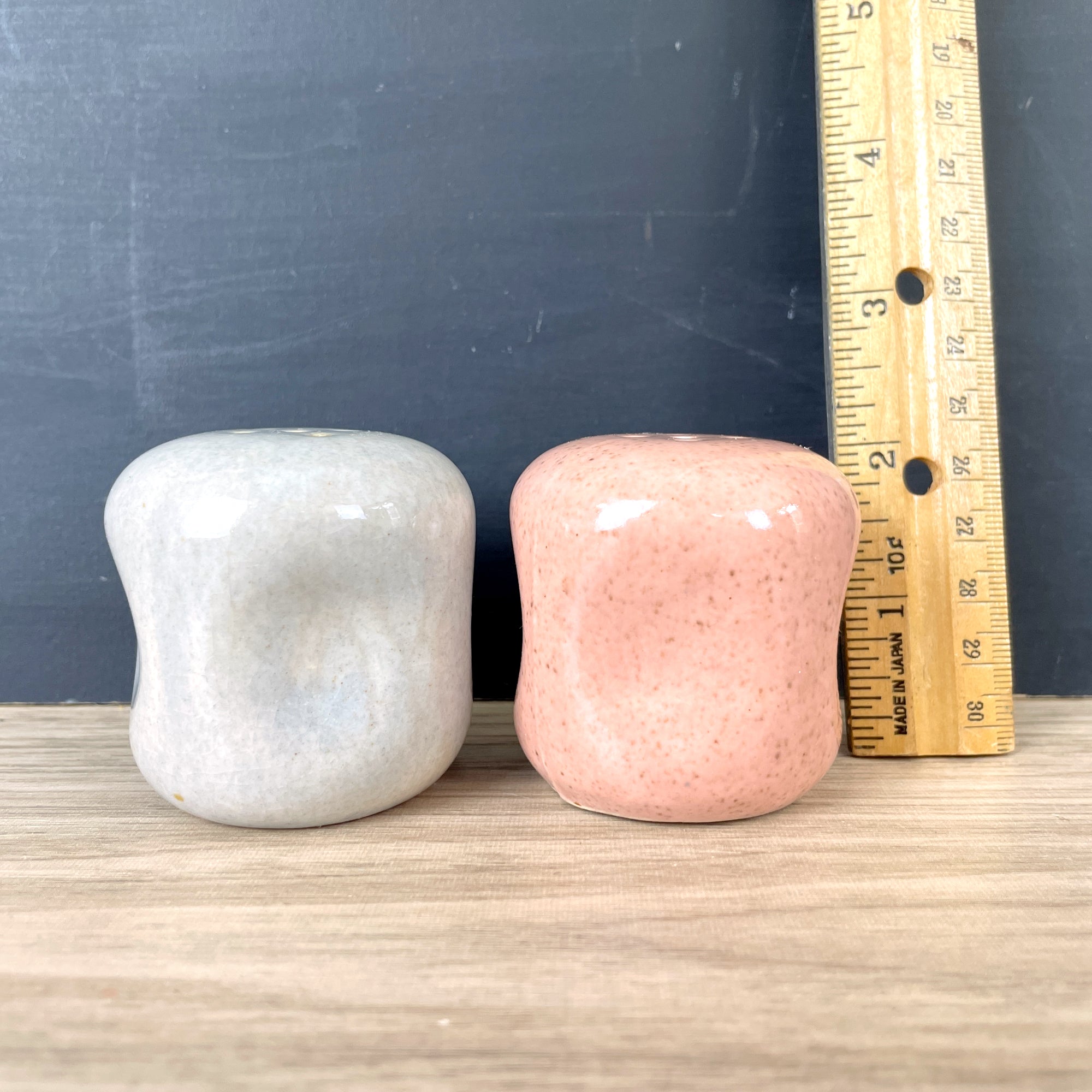 Mid century modern Russell Wright salt and pepper shaker set in coral pink speckled and gray. American Modern pattern, made by Steubenville from 1939-1959. Original, not reproduction.