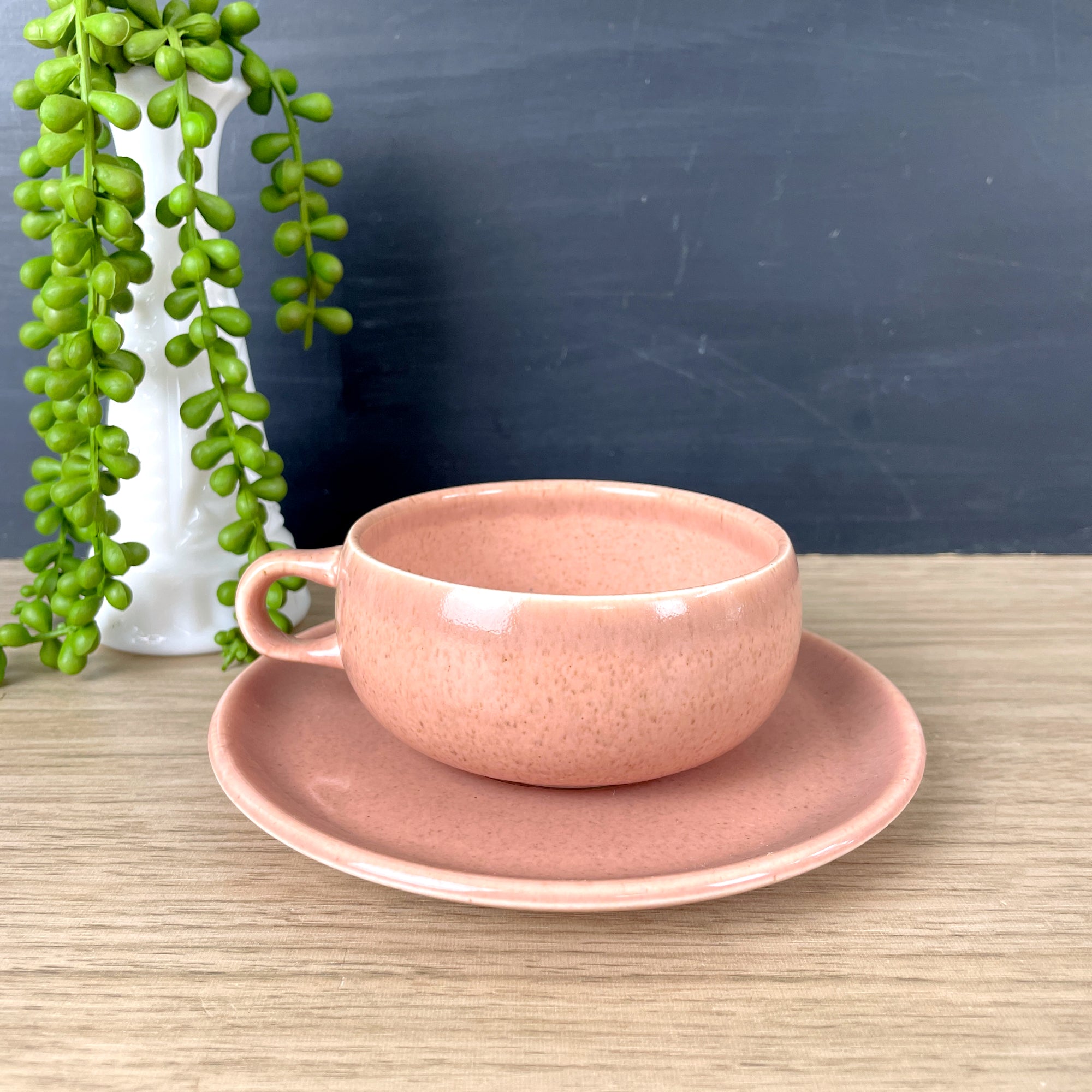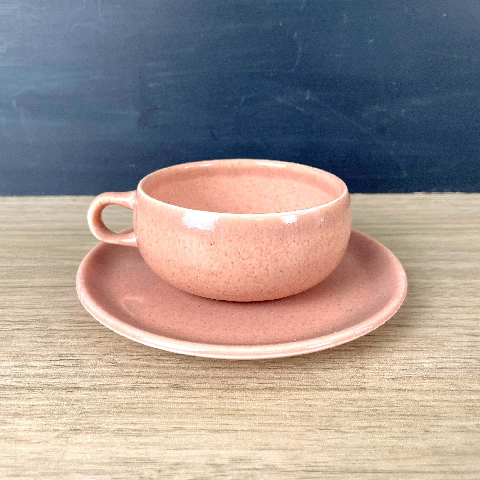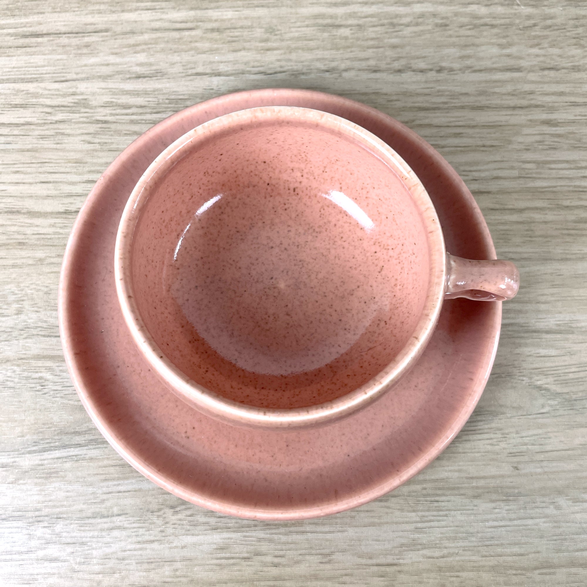Mid century modern Russel Wright cup and saucer in coral pink speckled glaze. American Modern pattern made by Steubanville. Original, not reproduction.