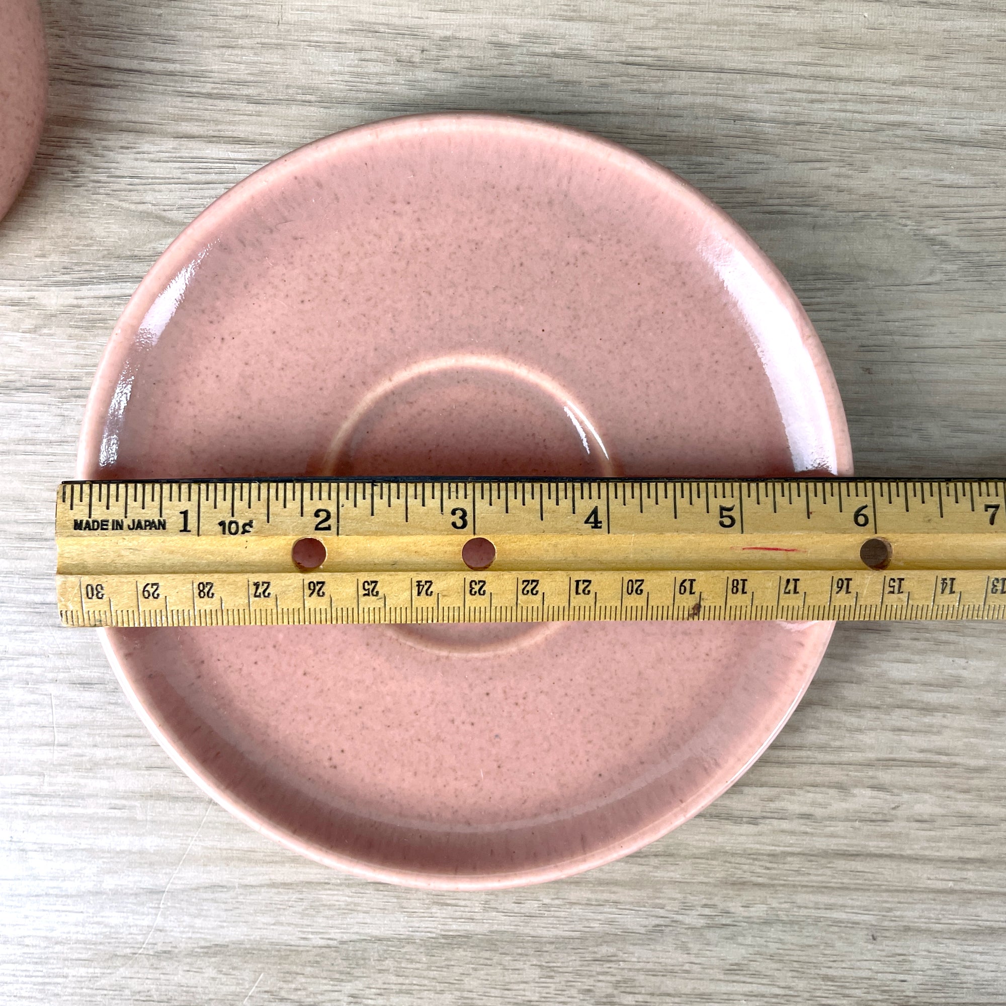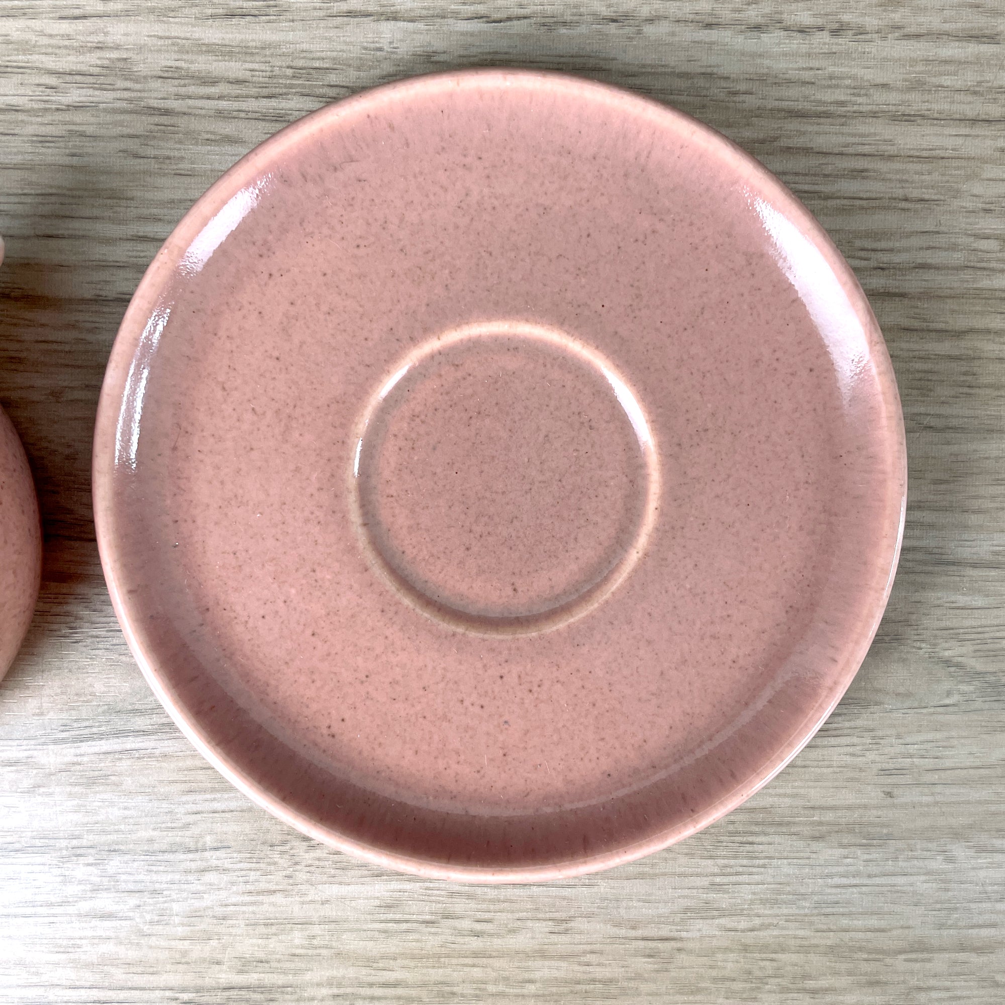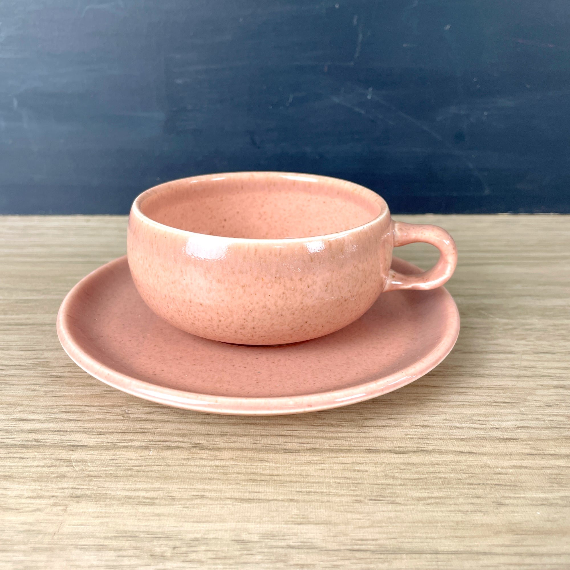 Mid century modern Russel Wright cup and saucer in coral pink speckled glaze. American Modern pattern made by Steubanville. Original, not reproduction.