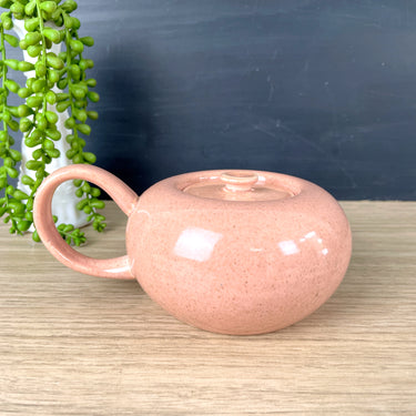 Mid century modern Russell Wright handled sugar bowl with lid in coral pink speckled color. Steubenville American Modern pattern, made from 1939-1959. Original, not reproduction.